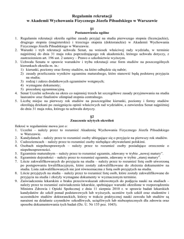 Regulamin rekrutacji w Akademii Wychowania Fizycznego Józefa Piłsudskiego w Warszawie §1 Postanowienia ogólne 1. Regulamin rekrutacji określa ogólne zasady przyjęć na studia pierwszego stopnia (licencjackie), drugiego stopnia (magisterskie) i trzeciego stopnia (doktoranckie) w Akademii Wychowania Fizycznego Józefa Piłsudskiego w Warszawie. 2. Warunki i tryb rekrutacji uchwala Senat, na wniosek właściwej rady wydziału, w terminie najpóźniej do dnia 31 maja roku poprzedzającego rok akademicki, którego uchwała dotyczy, z zastrzeżeniem art. 196 ust. 2 ustawy – Prawo o szkolnictwie wyższym. 3. Uchwała Senatu w sprawie warunków i trybu rekrutacji oraz form studiów na poszczególnych kierunkach określa m. in.: 1) kierunki, poziomy oraz formy studiów, na które odbędzie się nabór; 2) zasady przeliczania wyników egzaminu maturalnego, które stanowić będą podstawę przyjęcia na studia; 3) rodzaj i zakres dodatkowych egzaminów wstępnych; 4) wymagane dokumenty; 5) procedurę egzaminacyjną. 4. Senat Uczelni uchwala na okres co najmniej trzech lat szczegółowe zasady przyjmowania na studia laureatów oraz finalistów olimpiad stopnia centralnego. 5. Liczbę miejsc na pierwszy rok studiów na poszczególne kierunki, poziomy i formy studiów określają dziekani po zasięgnięciu opinii właściwych rad wydziałów, a zatwierdza Senat najpóźniej do dnia 31 maja roku, którego ta uchwała dotyczy. §2 Znaczenie użytych określeń Ilekroć w regulaminie mowa jest o: 1. Uczelni – należy przez to rozumieć Akademię Wychowania Fizycznego Józefa Piłsudskiego w Warszawie. 2. Kandydatach – należy przez to rozumieć osoby ubiegające się o przyjęcie na pierwszy rok studiów. 3. Cudzoziemcach – należy przez to rozumieć osoby niebędące obywatelami polskimi. 4. Osobach niepełnosprawnych – należy przez to rozumieć osoby posiadające orzeczenie o niepełnosprawności. 5. Egzaminie maturalnym – należy przez to rozumieć egzamin, zdawany w trybie „nowej matury”. 6. Egzaminie dojrzałości – należy przez to rozumieć egzamin, zdawany w trybie „starej matury”. 7. Liście zakwalifikowanych do przyjęcia na studia – należy przez to rozumieć listę osób utworzoną po postępowaniu kwalifikacyjnym, które zostały zakwalifikowane do złożenia dokumentów na studia. Lista zakwalifikowanych nie jest równoznaczna z listą osób przyjętych na studia. 8. Liście przyjętych na studia – należy przez to rozumieć listę osób, które zostały zakwalifikowane do przyjęcia na studia i złożyły wymagane dokumenty w wyznaczonym terminie. 9. Zaświadczeniu lekarskim o braku przeciwwskazań zdrowotnych do podjęcia nauki na studiach – należy przez to rozumieć zaświadczenie lekarskie, spełniające warunki określone w rozporządzeniu Ministra Zdrowia i Opieki Społecznej z dnia 11 sierpnia 2010 r. w sprawie badań lekarskich kandydatów do szkół ponad podstawowych lub wyższych, uczniów tych szkół oraz studentów i uczestników studiów doktoranckich, którzy w trakcie praktycznej nauki zawodu lub studiów są narażeni na działanie czynników szkodliwych, uciążliwych lub niebezpiecznych dla zdrowia oraz sposobu dokumentowania tych badań (Dz. U. Nr 155 poz. 1045). §3 Zasady rekrutacji 1. Warunkiem ubiegania się o przyjęcie na pierwszy rok studiów jest: 1) posiadanie świadectwa dojrzałości – na studia pierwszego stopnia; 2) posiadanie tytułu licencjata, magistra lub tytułu równorzędnego – na studia drugiego stopnia; 3) posiadanie tytułu magistra lub tytułu równorzędnego – na studia trzeciego stopnia. 2. Do odbywania studiów może być dopuszczona osoba, która spełniła warunki rekrutacji ustalone przez Uczelnię. 3. Postępowanie kwalifikacyjne ma charakter konkursowy. 4. Terminy składania dokumentów i datę rozpoczęcia postępowania kwalifikacyjnego na studia określa Rektor w formie zarządzenia. 5. Wysokość opłaty za postępowanie związane z przyjęciem na studia ustala Rektor na rok akademicki, uwzględniając zasadę, że opłata nie może przekraczać kosztów planowanych do poniesienia w zakresie niezbędnym do wykonywania czynności związanych z przyjmowaniem na studia na danym kierunku i określonym poziomie kształcenia. W przypadku kandydowania na więcej niż jeden kierunek studiów od kandydata pobiera się wielokrotność stawki odpowiadającej ilości wybranych kierunków. 6. Osoba przyjęta na studia nabywa prawa studenta z chwilą immatrykulacji i złożenia ślubowania, którego treść określa statut Uczelni. 7. Wyniki uzyskane w postępowaniu kwalifikacyjnym wyrażone są w punktach. 8. Wyniki postępowania kwalifikacyjnego na wszystkich etapach są jawne. 9. Jeżeli laureat lub finalista olimpiady centralnej zwolniony jest w postępowaniu rekrutacyjnym z przedmiotu związanego ze specjalnością olimpiady, oznacza to uzyskanie przez niego maksymalnej liczby punktów z tego przedmiotu. 10. Osoby, które nie zostały zakwalifikowane na studia stanowią grupę rezerwową. W przypadku zwalniania się miejsc na liście przyjętych na studia, osoby te zostaną przyjęte z zachowaniem kolejności, wynikającej z miejsca na liście rangowej. §4 Zasady rekrutacji na studia 1. W Uczelni obowiązuje System Elektronicznej Rekrutacji kandydatów dla osób ubiegających się o przyjęcie na studia pierwszego i drugiego stopnia na wszystkich wydziałach. 2. Postępowanie rekrutacyjne na studia pierwszego i drugiego stopnia składa się z następujących etapów: 1) zarejestrowanie kandydata w Systemie Elektronicznej Rekrutacji; 2) postępowanie kwalifikacyjne; 3) postępowanie w przedmiocie wydania decyzji o przyjęciu lub nieprzyjęciu na studia; 4) postępowanie odwoławcze. 3. Warunkiem uczestniczenia w postępowaniu kwalifikacyjnym na studia pierwszego i drugiego stopnia jest: 1) właściwe zarejestrowanie się w Systemie Elektronicznej Rekrutacji kandydatów przez wpisanie wymaganych danych