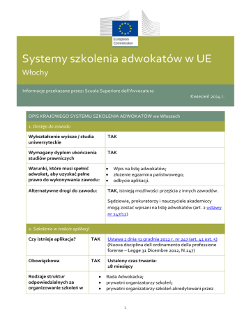Systemy szkolenia adwokatów w UE Włochy Informacje przekazane przez: Scuola Superiore dell’Avvocatura Kwiecień 2014 r. OPIS KRAJOWEGO SYSTEMU SZKOLENIA ADWOKATÓW we Włoszech 1. Dostęp do zawodu Wykształcenie wyższe / studia uniwersyteckie TAK Wymagany dyplom ukończenia studiów prawniczych TAK Warunki, które musi spełnić adwokat, aby uzyskać pełne prawo do wykonywania zawodu: Alternatywne drogi do zawodu: Wpis na listę adwokatów; złożenie egzaminu państwowego; odbycie aplikacji. TAK, istnieją możliwości przejścia z innych zawodów. Sędziowie, prokuratorzy i nauczyciele akademiccy mogą zostać wpisani na listę adwokatów (art. 2 ustawy nr 247/12) 2. Szkolenie w trakcie aplikacji Czy istnieje aplikacja? TAK Ustawa z dnia 31 grudnia 2012 r. nr 247 (art. 41 ust. 5) (Nuova disciplina dell ordinamento della professione forense – Legge 31 Dicembre 2012, N.247) Obowiązkowa TAK Ustalony czas trwania: 18 miesięcy Rodzaje struktur odpowiedzialnych za organizowanie szkoleń w Rada Adwokacka; prywatni organizatorzy szkoleń; prywatni organizatorzy szkoleń akredytowani przez 1 Państwo: Włochy trakcie aplikacji Radę Adwokacką; uczelnie; akademie prawnicze i struktury szkoleniowe ustanowione przez Radę Adwokacką. Forma szkoleń w trakcie aplikacji Praktyki pod nadzorem Rady Adwokackiej Egzamin wstępny / sprawdzenie wiedzy przed rozpoczęciem aplikacji TAK Ustalony program nauczania w trakcie aplikacji Brak ustalonego programu nauczania Brak wymogów dotyczących szkoleń w zakresie prawa UE i szkoleń językowych Sprawdzenie/weryfikacja dyplomu Brak zróżnicowania poszczególnych etapów pod kątem tematów szkoleń lub metod szkoleniowych Ocena/egzamin po odbyciu aplikacji NIE Po wejściu reformy systemu zawodów prawniczych w życie w dniu 1 stycznia 2015 r. ostateczny termin przeprowadzenia oceny końcowej okresu aplikacji będzie wynosił 6 lat. Aplikant będzie musiał złożyć w tym okresie egzamin państwowy. Po upływie 6 miesięcy od daty wpisania na listę aplikantów adwokackich aplikant może wystąpić do swojego patrona o udzielenie mu prawa do występowania przed sądami (w ściśle określonych rodzajach spraw) (tzw. practicante abilitato – wykwalifikowany aplikant). Jeżeli w ciągu 6 lat od daty wpisania na listę jako „wykwalifikowanego aplikanta” aplikant nie złoży egzaminu państwowego, zostanie automatycznie skreślony z listy. Ogólnie rzecz biorąc, termin na uzyskanie pełnego prawa do wykonywania zawodu adwokata wynosi 6 lat. Skreślenie z listy aplikantów nie uniemożliwia jednak kandydatowi ubiegania się o ponowne wpisanie go na tę listę po poddaniu się ocenie przez odpowiednią Radę Adwokacką. 2 Państwo: Włochy 3. System doskonalenia zawodowego Rozróżnienie między doskonaleniem zawodowym a szkoleniem z zakresu specjalizacji TAK, począwszy od 1 stycznia 2015 r. (zob. poniżej) Obowiązek doskonalenia zawodowego Podstawa prawna po 1 stycznia 2015 r.: TAK ustawa reformująca nr 247/12 (art. 11) – wprowadzenie obowiązku doskonalenia zawodowego obowiązek doskonalenia zawodowego określony w prawie krajowym; obowiązek doskonalenia zawodowego określony w regulaminie wewnętrznym Rady / Towarzystwa Prawniczego. Obowiązek szkolenia z zakresu specjalizacji TAK Podstawa prawna: Kwestie dotyczące szkoleń z zakresu specjalizacji zostaną uregulowane w art. 9 ustawy nr 247/12 obowiązek szkolenia z zakresu specjalizacji określony w prawie krajowym; obowiązek szkolenia z zakresu specjalizacji ustanowiony w regulaminie wewnętrznym Rady / Towarzystwa Prawniczego. Obowiązek nauki języków obcych Brak Obowiązek włączenia treści związanych z prawem UE w zakres doskonalenia zawodowego / szkolenia z zakresu specjalizacji NIE 4. Systemy akredytacji i organizatorzy szkoleń Możliwość akredytacji TAK Podstawa prawna (z dnia 1 stycznia 2015 r.): art. 9, 11 ustawy nr 247/12 Liczba organizatorów szkoleń oferujących działania szkoleniowe w ramach doskonalenia Ponad 50 organizatorów szkoleń 3 Państwo: Włochy zawodowego Rodzaj organizatorów szkoleń opracowujących akredytowane działania szkoleniowe w ramach doskonalenia zawodowego Liczba organizatorów szkoleń organizujących działania szkoleniowe przygotowujące do specjalizacji Rodzaj organizatorów szkoleń opracowujących akredytowane działania szkoleniowe przygotowujące do specjalizacji Rada Adwokacka; organizacja zarządzana lub utworzona przez Radę Adwokacką (w tym ośrodki prawnicze i lokalne zrzeszenia adwokatów); akredytowany prywatny komercyjny organizator szkoleń (w tym kancelarie prawne); akredytowany prywatny lub publiczny niekomercyjny organizator szkoleń (w tym uczelnie, fundacje); nieakredytowany prywatny komercyjny organizator szkoleń; nieakredytowany prywatny lub publiczny niekomercyjny organizator szkoleń. Ponad 50 organizatorów szkoleń Rada Adwokacka; organizacja zarządzana lub utworzona przez Radę Adwokacką (w tym ośrodki prawnicze i lokalne zrzeszenia adwokatów); akredytowany prywatny komercyjny organizator szkoleń (w tym kancelarie prawne); akredytowany prywatny lub publiczny niekomercyjny organizator szkoleń (w tym uczelnie, fundacje); nieakredytowany prywatny komercyjny organizator szkoleń; nieakredytowany prywatny lub publiczny niekomercyjny organizator szkoleń. Działania i metody Rodzaj działań szkoleniowych akceptowanych w ramach obowiązku doskonalenia zawodowego lub szkolenia z zakresu specjalizacji Uczestnictwo w szkoleniach stacjonarnych; ukończenie kursów kształcenia na odległość; 4 uczestnictwo w działaniach szkoleniowych w innych państwach członkowskich: Tak, wymóg odbycia szkolenia można spełnić, Państwo: Włochy zaliczenie modułów e-uczenia się; uczestnictwo w seminarium internetowym; ukończenie szkoleń prowadzonych w formule mieszanego uczenia się; uczestnictwo w konferencjach szkoleniowych; uczestnictwo w działaniach szkoleniowych jako osoba prowadząca szkolenie lub nauczycie