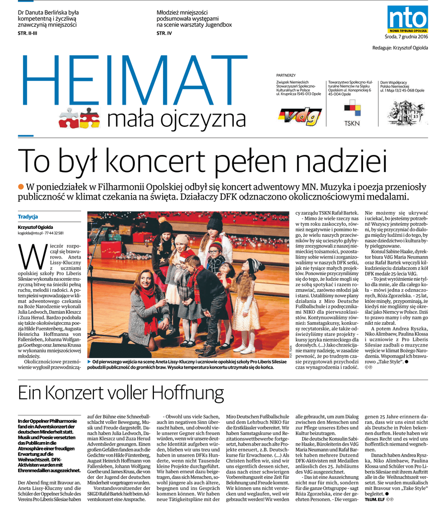 Dr Danuta Berlińska była kompetentną i życzliwą znawczynią mniejszości Młodzież mniejszości podsumowała występami na scenie warsztaty Jugendbox STR. II-III STR. IV HEIMAT Środa, 7 grudnia 2016 Redaguje: Krzysztof Ogiolda PARTNERZY Związek Niemieckich Stowarzyszeń SpołecznoKulturalnych w Polsce ul. Krupnicza 1545-013 Opole Towarzystwo Społeczno-Kulturalne Niemców na Śląsku Opolskim ul. Konopnickiej 6 45-004 Opole Dom Współpracy Polsko Niemieckiej ul. 1 Maja 13/2 45-068 Opole mała ojczyzna To był koncert pełen nadziei A W poniedziałek w Filharmonii Opolskiej odbył się koncert adwentowy MN. Muzyka i poezja przeniosły publiczność w klimat czekania na święta. Działaczy DFK odznaczono okolicznościowymi medalami. Tradycja Krzysztof Ogiolda [email protected] - 77 44 32 581 FOT. TSKN W ieczór rozpoczął się brawurowo. Aneta Lissy-Kluczny z uczniami opolskiej szkoły Pro Liberis Silesiae wykonała na scenie muzyczną bitwę na śnieżki pełną ruchu, melodii i radości. A potem pieśni wprowadzające w klimat adwentowego czekania na Boże Narodzenie wykonali Julia Ledwoch, Damian Kleszcz i Zuza Herud. Bardzo podobała się także okołoświąteczna poezja Hilde Fuerstenberg, Augusta Heinricha Hoffmanna von Fallersleben, Johanna Wolfganga Goethego oraz Jamesa Krussa w wykonaniu mniejszościowej młodzieży. Okolicznościowe przemówienie wygłosił przewodniczą- b Od pierwszego wejścia na scenę Aneta Lissy-Kluczny i uczniowie opolskiej szkoły Pro Liberis Silesiae pobudzili publiczność do gromkich braw. Wysoka temperatura koncertu utrzymała się do końca. cy zarządu TSKN Rafał Bartek. - Mimo że wiele rzeczy nas w tym roku zaskoczyło, również negatywnie i pomimo tego, że wielu naszych przeciwników by się ucieszyło gdybyśmy zrezygnowali z naszej niemieckiej tożsamości, pozostaliśmy sobie wierni i zorganizowaliśmy w naszych DFK setki, jak nie tysiące małych projektów. Ponownie przyczyniliśmy się do tego, że ludzie mogli się ze sobą spotykać i razem rozmawiać, zarówno młodzi jak i starsi. Ustaliliśmy nowe plany działania z Miro Deutsche Fußballschule i z podręcznikami NIKO dla pierwszoklasistów. Kontynuowaliśmy również: Samstagskursy, konkursy recytatorskie, ale także odświeżyliśmy stare projekty – kursy języka niemieckiego dla dorosłych. (...) Jako chrześcijanie mamy nadzieję, w zasadzie pewność, że po trudnym czasie przygotowań przychodzi czas wynagrodzenia i radość. Nie możemy się ukrywać i uciekać, bo jesteśmy potrzebni! Wszyscy jesteśmy potrzebni, by się przyczyniać do dialogu między ludźmi i do tego, by nasze dziedzictwo i kultura były pielęgnowane. Konsul Sabine Haake, dyrektor biura VdG Maria Neumann oraz Rafał Bartek wręczyli kilkudziesięciu działaczom z kół DFK medale 25-lecia VdG. - To jest wyróżnienie nie tylko dla mnie, ale dla całego koła – mówi jedna z odznaczonych, Róża Zgorzelska. – 25 lat, które minęły, przypominają, że kiedyś nie mogliśmy się określać jako Niemcy w Polsce. Dziś to prawo mamy i oby nam go nikt nie zabrał. A potem Andrea Ryszka, Niko Alimbaew, Paulina Klossa i uczniowie z Pro Liberis Silesiae zadbali o muzyczne wejście w klimat Bożego Narodzenia. Wspomagał ich brawurowo „Take Style”. a ¹ alle gebraucht, um zum Dialog zwischen den Menschen und zur Pflege unseres Erbes und Kultur beizutragen. Die deutsche Konsulin Sabine Haake, Büroleiterin des VdG Maria Neumann und Rafał Bartek haben mehrere Dutzend DFK-Aktivisten mit Medaillen anlässlich des 25. Jubiläums des VdG ausgezeichnet. - Das ist eine Auszeichnung nicht nur für mich, sondern für die ganze Ortsgruppe - sagt Róża Zgorzelska, eine der geehrten Personen. - Die vergan- genen 25 Jahre erinnern daran, dass wir uns einst nicht als Deutsche in Polen bekennen durften. Heute haben wir dieses Recht und es wird uns hoffentlich niemand wegnehmen. Danach haben Andrea Ryszka, Niko Alimbaew, Paulina Klossa und Schüler von Pro Liberis Silesiae mit ihrem Auftritt alle in die Weihnachtszeit versetzt. Sie wurden musikalisch mit Bravour von „Take Style” begleitet. a TŁUM. ELF ¹ Ein Konzert voller Hoffnung In der Oppelner Philharmonie fand ein Adventskonzert der deutschen Minderheit statt. Musik und Poesie versetzten das Publikum in die Atmosphäre einer freudigen Erwartung auf die Weihnachtszeit. DFKAktivisten wurden mit Ehrenmedaillen ausgezeichnet. Der Abend fing mit Bravour an. Aneta Lissy-Kluczny und die Schüler der Oppelner Schule des Vereins Pro Liberis Silesiae haben auf der Bühne eine Schneeballschlacht voller Bewegung, Musik und Freude dargestellt. Danach haben Julia Ledwoch, Damian Kleszcz und Zuza Herud Adventslieder gesungen. Einen großen Gefallen fanden auch die Gedichte von Hilde Fürstenberg, August Heinrich Hoffmann von Fallersleben, Johann Wolfgang Goethe und James Kruss, die von der der Jugend der deutschen Minderheit vorgetragen wurden. Vorstandsvorsitzender der SKGD Rafał Bartek hielt beim Adventskonzert eine Ansprache. - Obwohl uns viele Sachen, auch im negativen Sinn überrascht haben, und obwohl viele unserer Gegner sich freuen würden, wenn wir unsere deutsche Identität aufgeben würden, blieben wir uns treu und haben in unseren DFKs Hunderte, wenn nicht Tausende kleine Projekte durchgeführt. Wir haben erneut dazu beigetragen, dass sich Menschen, sowohl jüngere als auch ältere, begegnen und ins Gespräch kommen können. Wir haben neue Tätigkeitspläne mit der Miro Deutschen Fußballschule und dem Lehrbuch NIKO für die Erstklässler vorbereitet. Wir haben Samstagskurse und Rezitationswettbewerbe fortgesetzt, haben aber auch alte Projekte erneuert, z.B. Deutschkurse für Erwachsene. (...) Als Christen hoffen wir, sind wir uns eigentlich dessen sicher, dass nach einer schwierigen Vorbereitungszeit eine Zeit für Belohnung und Freude kommt. Wir können uns nicht verstecken und weglaufen, weil wir gebraucht werden! Wir werden II • Heimat - mał