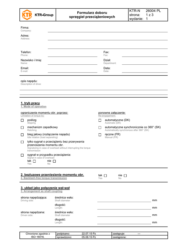 KTR-N 26004 PL strona: 1z3 wydanie: 1 Formularz doboru sprzęgieł przeciążeniowych Firma: Company: Adres: Address: Telefon: Fax: Phone: Fax: Nazwisko i Imię: Dział: Name: Department: Email: Data: E-mail: Date: opis napędu: Description of drive: 1. tryb pracy 1. Mode of operation ograniczenie momentu obr. poprzez: ponowne załączenie: Limitation of torque by: Re-engagement: poślizg automatyczne (DK) Slipping Automatic (DK) mechanizm zapadkowy automatyczne synchronicznie co 360° (SK) Ratching Automatically synchronous after 360° (SK) bieg jałowy (rozłączenie napędu) ręczne (FR) Idle rotation (load separating) Manual (FR) tylko sygnał o przeciążeniu bez przerywania przenoszenia momentu obr. Signalizing in case of overload without interrupting the torque transmission sygnał w przypadku przeciążenia: Signal in case of overload: tak nie Yes No 2. bezluzowe przeniesienie momentu obr. tak nie 2. Backlash-free torque transmission Yes No 3. układ jako połączenie wał-wał 3. Arrangement as shaft coupling strona napędzająca: średnica wału: Driving side: Shaft diameter mm długość: mm Length: strona napędzana: średnica wału: Driven side: Shaft diameter mm długość: mm Length: Chronione zgodnie z ISO 16016. podpisano: sprawdzono: 22.07.15 Pz 05.08.15 Pz zastępuje: zastąpione: --- KTR-N 26004 PL strona: 2z3 wydanie: 1 Formularz doboru sprzęgieł przeciążeniowych 4. napęd: silnik elektryczny 4. Drive: E-motor moment rozruchowy TAS Nm Starting torque TAS lub moment utyku TAS or Tilting torque TAS asynchroniczny start bezpośredni start λ Asynchronous Direct starting λ start Nm inne: Other: 5. moc napędu oraz prędkość 5. Driving power and speed moc napędu: kW Driving power: prędkość obr. sprzęgła przeciążeniowego: 1/min Speed of torque limiter: cała moc napędu jest przenoszona do sprzęgła przeciążeniowego The overall driving power is transferred to the torque limiter moc przenoszona do sprzęgła przeciążeniowego Power: to torque limiter 6. strona napędzana: 6. Driven side wymagany moment obr. po stronie obciążenia Load torque required Nm liczba przeciążeń na dzień Number of overload cases per day czas zatrzymania w przypadku przeciążenia sek. Rundown-time in case of overload sec. wartość nastawy momentu obr. Nm Limit torque to be set (Wartość nastawy momentu obr. musi być 30% wyższa niż maksymalna wartość momentu roboczego.) (Limit torque must be 30 % above the maximum operating torque.) protokół nastawy: tak nie Setting records: Yes No 7. warunki montażu 7. Mounting conditions wewnątrz obudowy maszyny w układzie połącznia wał-wał In a closed machine housing With an arrangement as a shaft coupling poza obudową, w pomieszczeniu Open, in a closed space zanurzenie w oleju lub mgle olejowej maks. odchyłka promieniowa sprzęgła In oil tempering or oil dust Max. parallel displacement of coupling mm na zewnątrz, temperatura otoczenia maks. odchyłka kątowa stopnie Outdoor, ambient temperature Max. angular displacement Degree z do from to maks. odchyłka osiowa °C mm Max. axial displacement inne (dostęp, zapylenie, itd.): odległość między końcami wałów Other (accessibility, dust volume, etc.): Distance between shaft ends Chronione zgodnie z ISO 16016. podpisano: sprawdzono: 22.07.15 Pz 05.08.15 Pz zastępuje: zastąpione: --- mm Formularz doboru sprzęgieł przeciążeniowych KTR-N 26004 PL strona: 3z3 wydanie: 1 8. przewidywane zapotrzebowanie szt. (jednorazowo) 8. Anticipated demand Piece (once) szt./miesiąc Pieces/month szt./rok Pieces/year 9. dokumentacja i specyfikacje dotyczące zarządzania jakością (QM) 9. Documentations and specifications by QM certyfikat materiałowy: Material test certificate: raport kontroli partii próbnej: Initial sample test report: ATEX: tak nie ATEX: Yes No inne: Other: 10. wymagany układ napędowy z wymiarami montażowymi i przyłączeniowymi 10. Drive system with connecting dimensions required Chronione zgodnie z ISO 16016. podpisano: sprawdzono: 22.07.15 Pz 05.08.15 Pz zastępuje: zastąpione: ---