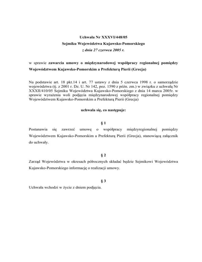 Uchwała Nr XXXVI/448/05 Sejmiku Województwa Kujawsko-Pomorskiego z dnia 27 czerwca 2005 r. w sprawie zawarcia umowy o międzynarodowej współpracy regionalnej pomiędzy Województwem Kujawsko-Pomorskim a Prefekturą Pierii (Grecja) Na podstawie art. 18 pkt.14 i art. 77 ustawy z dnia 5 czerwca 1998 r. o samorządzie województwa (tj. z 2001 r. Dz. U. Nr 142, poz. 1590 z późn. zm.) w związku z uchwałą Nr XXXII/410/05 Sejmiku Województwa Kujawsko-Pomorskiego z dnia 14 marca 2005r. w sprawie wyrażenia woli podjęcia międzynarodowej współpracy regionalnej pomiędzy Województwem Kujawsko-Pomorskim a Prefekturą Pierii (Grecja) uchwala się, co następuje: §1 Postanawia się zawrzeć umowę o współpracy międzyregionalnej pomiędzy Województwem Kujawsko-Pomorskim a Prefekturą Pierii (Grecja), stanowiącą załącznik do uchwały. §2 Zarząd Województwa w okresach półrocznych składać będzie Sejmikowi Województwa Kujawsko-Pomorskiego informację o realizacji umowy. §3 Uchwała wchodzi w życie z dniem podjęcia. Uzasadnienie Na mocy ustawy z dnia 5 czerwca 1998 r. o samorządzie województwa (tj. Dz.U.z 2001 r. Nr 142, poz. 1590 z późn. zm.) samorząd województwa, posiadając osobowość prawną i działając poprzez swoje organy, może zawierać umowy i porozumienia o międzynarodowej współpracy regionalnej. Współpraca międzynarodowa stanowi istotny element kształtowania rozwoju gospodarczego, kulturowego i społecznego regionu. Głównymi dziedzinami gospodarki Prefektury Pierii są rolnictwo i turystyka. Województwo Kujawsko-Pomorskie skorzysta także z doświadczeń Prefektury Pierii w wykorzystywaniu funduszy unijnych. Na tej podstawie i w oparciu o stale rozwijające się kontakty pomiędzy administracjami i firmami obu regionów, Sejmik Województwa Kujawsko-Pomorskiego podjął w dniu 14 marca 2005r. Uchwałę Nr XXXII/410/05 wyrażającą wolę nawiązania współpracy międzyregionalnej pomiędzy Województwem Kujawsko-Pomorskim a Prefekturą Pierii (Grecja). Zgodnie z obowiązującą procedurą, projekt uchwały wraz z projektem umowy o współpracy międzyregionalnej pomiędzy Województwem Kujawsko-Pomorskim a Prefekturą Pierii (Grecja) podlega akceptacji Ministra Spraw Zagranicznych.