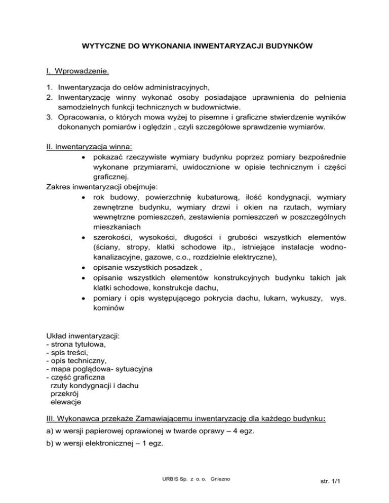 WYTYCZNE DO WYKONANIA INWENTARYZACJI BUDYNKÓW I. Wprowadzenie. 1. Inwentaryzacja do celów administracyjnych, 2. Inwentaryzację winny wykonać osoby posiadające uprawnienia do pełnienia samodzielnych funkcji technicznych w budownictwie. 3. Opracowania, o których mowa wyżej to pisemne i graficzne stwierdzenie wyników dokonanych pomiarów i oględzin , czyli szczegółowe sprawdzenie wymiarów. II. Inwentaryzacja winna: pokazać rzeczywiste wymiary budynku poprzez pomiary bezpośrednie wykonane przymiarami, uwidocznione w opisie technicznym i części graficznej. Zakres inwentaryzacji obejmuje: rok budowy, powierzchnię kubaturową, ilość kondygnacji, wymiary zewnętrzne budynku, wymiary drzwi i okien na rzutach, wymiary wewnętrzne pomieszczeń, zestawienia pomieszczeń w poszczególnych mieszkaniach szerokości, wysokości, długości i grubości wszystkich elementów (ściany, stropy, klatki schodowe itp., istniejące instalacje wodnokanalizacyjne, gazowe, c.o., rozdzielnie elektryczne), opisanie wszystkich posadzek , opisanie wszystkich elementów konstrukcyjnych budynku takich jak klatki schodowe, konstrukcje dachu, pomiary i opis występującego pokrycia dachu, lukarn, wykuszy, wys. kominów Układ inwentaryzacji: - strona tytułowa, - spis treści, - opis techniczny, - mapa poglądowa- sytuacyjna - część graficzna rzuty kondygnacji i dachu przekrój elewacje III. Wykonawca przekaże Zamawiającemu inwentaryzację dla każdego budynku: a) w wersji papierowej oprawionej w twarde oprawy – 4 egz. b) w wersji elektronicznej – 1 egz. URBIS Sp. z o. o. Gniezno str. 1/1