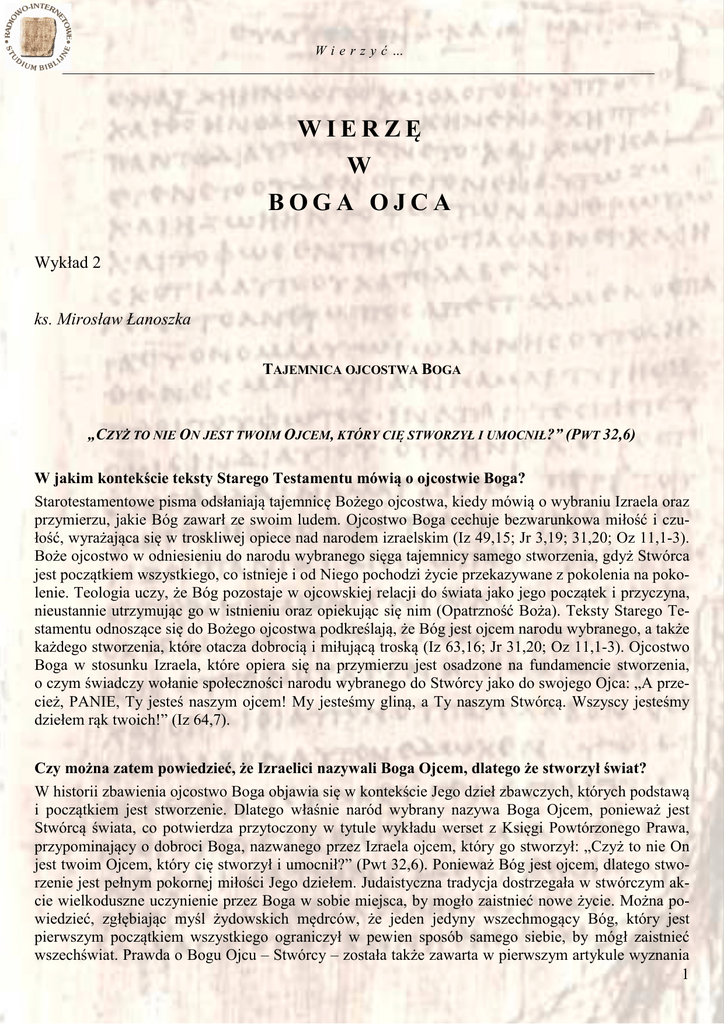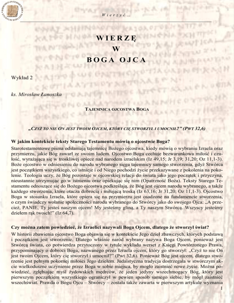 Wierzyć… } WIERZĘ W BOGA OJCA Wykład 2 ks. Mirosław Łanoszka TAJEMNICA OJCOSTWA BOGA „CZYŻ TO NIE ON JEST TWOIM OJCEM, KTÓRY CIĘ STWORZYŁ I UMOCNIŁ?” (PWT 32,6) W jakim kontekście teksty Starego Testamentu mówią o ojcostwie Boga? Starotestamentowe pisma odsłaniają tajemnicę Bożego ojcostwa, kiedy mówią o wybraniu Izraela oraz przymierzu, jakie Bóg zawarł ze swoim ludem. Ojcostwo Boga cechuje bezwarunkowa miłość i czułość, wyrażająca się w troskliwej opiece nad narodem izraelskim (Iz 49,15; Jr 3,19; 31,20; Oz 11,1-3). Boże ojcostwo w odniesieniu do narodu wybranego sięga tajemnicy samego stworzenia, gdyż Stwórca jest początkiem wszystkiego, co istnieje i od Niego pochodzi życie przekazywane z pokolenia na pokolenie. Teologia uczy, że Bóg pozostaje w ojcowskiej relacji do świata jako jego początek i przyczyna, nieustannie utrzymując go w istnieniu oraz opiekując się nim (Opatrzność Boża). Teksty Starego Testamentu odnoszące się do Bożego ojcostwa podkreślają, że Bóg jest ojcem narodu wybranego, a także każdego stworzenia, które otacza dobrocią i miłującą troską (Iz 63,16; Jr 31,20; Oz 11,1-3). Ojcostwo Boga w stosunku Izraela, które opiera się na przymierzu jest osadzone na fundamencie stworzenia, o czym świadczy wołanie społeczności narodu wybranego do Stwórcy jako do swojego Ojca: „A przecież, PANIE, Ty jesteś naszym ojcem! My jesteśmy gliną, a Ty naszym Stwórcą. Wszyscy jesteśmy dziełem rąk twoich!” (Iz 64,7). Czy można zatem powiedzieć, że Izraelici nazywali Boga Ojcem, dlatego że stworzył świat? W historii zbawienia ojcostwo Boga objawia się w kontekście Jego dzieł zbawczych, których podstawą i początkiem jest stworzenie. Dlatego właśnie naród wybrany nazywa Boga Ojcem, ponieważ jest Stwórcą świata, co potwierdza przytoczony w tytule wykładu werset z Księgi Powtórzonego Prawa, przypominający o dobroci Boga, nazwanego przez Izraela ojcem, który go stworzył: „Czyż to nie On jest twoim Ojcem, który cię stworzył i umocnił?” (Pwt 32,6). Ponieważ Bóg jest ojcem, dlatego stworzenie jest pełnym pokornej miłości Jego dziełem. Judaistyczna tradycja dostrzegała w stwórczym akcie wielkoduszne uczynienie przez Boga w sobie miejsca, by mogło zaistnieć nowe życie. Można powiedzieć, zgłębiając myśl żydowskich mędrców, że jeden jedyny wszechmogący Bóg, który jest pierwszym początkiem wszystkiego ograniczył w pewien sposób samego siebie, by mógł zaistnieć wszechświat. Prawda o Bogu Ojcu – Stwórcy – została także zawarta w pierwszym artykule wyznania 1 Wierzyć… } wiary chrześcijańskiej, ponieważ stworzenie jest fundamentem wszystkich dzieł Bożych oraz początkiem historii zbawienia. W jaki sposób autorzy tekstów Starego Testamentu mówią o Bogu Stwórcy? Jak już zostało powiedziane, Izraelici widzieli w Bogu Ojca, który ich wybrał spośród innych narodów i zawarł z nimi wieczne przymierze, a dopiero potem mówili o Nim jako Stworzycielu wszechświata i ludzkości. W Biblii Bóg jest jedynym Panem i Stwórcą, który swym wszechmocnym słowem powołuje do istnienia wszelkie byty. W biblijnym ujęciu Stworzyciel jest osobowym Bogiem, który w sposób absolutnie wolny stwarza doskonałe i w pełni harmonijne dzieło, angażując się w nie z miłością. O tym stwórczym dziele Boga opowiada biblijny poemat, który znajduje się w pierwszym i drugim rozdziale Księgi Rodzaju. Te uzupełniające się opowiadania o początkach wszechświata i człowieka stanowią pierwszy etap historii zbawienia. Tych dwóch różnych biblijnych tekstów nie można oczywiście traktować, jako opisu mechanizmu wyjaśniającego etapy powstawania kosmosu czy też pochodzenia różnorodności biologicznej, gdyż ich celem jest odsłonięcie sensu stworzenia wszechświata i ludzkości, gdzie Bóg jest pierwszym początkiem wszystkiego. W jaki zatem sposób opowiada o Bogu Stwórcy pierwsze biblijne opowiadanie o stworzeniu? Pierwsze opowiadanie o stworzeniu, które jednocześnie rozpoczyna całą Biblię stanowi wyznanie wiary w Boga jako Stwórcę nieba i ziemi: „Na początku Bóg stworzył niebo i ziemię” (Rdz 1,1). Pochodzący ze środowiska kapłańskiego poemat o stwórczym dziele Boga (Rdz 1,1-2,4a) został zbudowany w oparciu o cyklicznie powtarzający się schemat strukturalny: wstęp, zasadnicza część opowiadania oraz jego konkluzja. Tę zwartą i harmonijną budowę cechuje paralelizm stwarzanych dzieł oraz opisujących je formuł, a także symbolika numeryczna, gdyż sam opis stworzenia został wpisany w siedmiodniowy porządek tygodnia. Sama struktura literacka każdego ze stwórczych dni również została zbudowana z siedmiu elementów, co służy podkreśleniu harmonii i piękna Bożego dzieła. Sześć dni stworzenia opowiadających o stwórczej aktywności Boga wyraźnie dzieli się na dwie równe części, z których pierwsza przedstawia rozdzielanie przestrzeni wszechświata (światłość i ciemność, wody powyżej i poniżej sklepienia, „sucha powierzchnia” i „zbiorowisko wody – morze”), natomiast druga mówi o wypełnianiu tych wydzielonych obszarów odpowiednimi stworzeniami. Uroczyste wyznanie wiary, którym zaczyna się Pismo Święte stwierdza fundamentalną prawdę, że Bóg stworzył wszechświat, a więc wszystko, co istnieje jest zależne od Stwórcy (Rdz 1,1). Boże działanie w wersecie otwierającym Biblię zostało opisane czasownikiem „stwarzać” (hebr. bārā’), które Biblia hebrajska odnosi tylko do Boga, a więc podmiotem tego aktu może być tylko jeden jedyny Stwórca. Już żydowscy uczeni wyjaśniali, że słowo bārā’ oznacza stworzenie „czegoś” z „niczego”. Późniejsze teksty greckie Starego Testamentu odwołując się do początków wszechświata i człowieka mówią wprost o stworzeniu z niczego (2Mch 7,28; Mdr 13,1-5), co chrześcijańska teologia zdefiniowała za pomoc