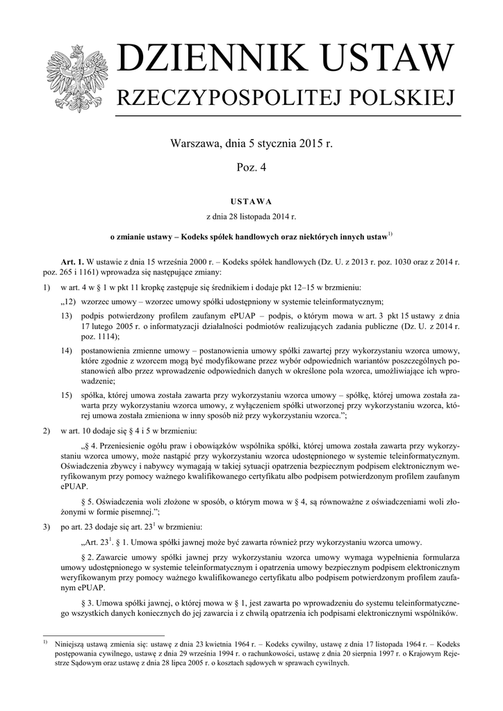 DZIENNIK USTAW RZECZYPOSPOLITEJ POLSKIEJ Warszawa, dnia 5 stycznia 2015 r. Poz. 4 US T AW A z dnia 28 listopada 2014 r. o zmianie ustawy – Kodeks spółek handlowych oraz niektórych innych ustaw1) Art. 1. W ustawie z dnia 15 września 2000 r. – Kodeks spółek handlowych (Dz. U. z 2013 r. poz. 1030 oraz z 2014 r. poz. 265 i 1161) wprowadza się następujące zmiany: 1) w art. 4 w § 1 w pkt 11 kropkę zastępuje się średnikiem i dodaje pkt 12–15 w brzmieniu: „12) wzorzec umowy – wzorzec umowy spółki udostępniony w systemie teleinformatycznym; 2) 13) podpis potwierdzony profilem zaufanym ePUAP – podpis, o którym mowa w art. 3 pkt 15 ustawy z dnia 17 lutego 2005 r. o informatyzacji działalności podmiotów realizujących zadania publiczne (Dz. U. z 2014 r. poz. 1114); 14) postanowienia zmienne umowy – postanowienia umowy spółki zawartej przy wykorzystaniu wzorca umowy, które zgodnie z wzorcem mogą być modyfikowane przez wybór odpowiednich wariantów poszczególnych postanowień albo przez wprowadzenie odpowiednich danych w określone pola wzorca, umożliwiające ich wprowadzenie; 15) spółka, której umowa została zawarta przy wykorzystaniu wzorca umowy – spółkę, której umowa została zawarta przy wykorzystaniu wzorca umowy, z wyłączeniem spółki utworzonej przy wykorzystaniu wzorca, której umowa została zmieniona w inny sposób niż przy wykorzystaniu wzorca.”; w art. 10 dodaje się § 4 i 5 w brzmieniu: „§ 4. Przeniesienie ogółu praw i obowiązków wspólnika spółki, której umowa została zawarta przy wykorzystaniu wzorca umowy, może nastąpić przy wykorzystaniu wzorca udostępnionego w systemie teleinformatycznym. Oświadczenia zbywcy i nabywcy wymagają w takiej sytuacji opatrzenia bezpiecznym podpisem elektronicznym weryfikowanym przy pomocy ważnego kwalifikowanego certyfikatu albo podpisem potwierdzonym profilem zaufanym ePUAP. § 5. Oświadczenia woli złożone w sposób, o którym mowa w § 4, są równoważne z oświadczeniami woli złożonymi w formie pisemnej.”; 3) po art. 23 dodaje się art. 231 w brzmieniu: „Art. 231. § 1. Umowa spółki jawnej może być zawarta również przy wykorzystaniu wzorca umowy. § 2. Zawarcie umowy spółki jawnej przy wykorzystaniu wzorca umowy wymaga wypełnienia formularza umowy udostępnionego w systemie teleinformatycznym i opatrzenia umowy bezpiecznym podpisem elektronicznym weryfikowanym przy pomocy ważnego kwalifikowanego certyfikatu albo podpisem potwierdzonym profilem zaufanym ePUAP. § 3. Umowa spółki jawnej, o której mowa w § 1, jest zawarta po wprowadzeniu do systemu teleinformatycznego wszystkich danych koniecznych do jej zawarcia i z chwilą opatrzenia ich podpisami elektronicznymi wspólników. 1) Niniejszą ustawą zmienia się: ustawę z dnia 23 kwietnia 1964 r. – Kodeks cywilny, ustawę z dnia 17 listopada 1964 r. – Kodeks postępowania cywilnego, ustawę z dnia 29 września 1994 r. o rachunkowości, ustawę z dnia 20 sierpnia 1997 r. o Krajowym Rejestrze Sądowym oraz ustawę z dnia 28 lipca 2005 r. o kosztach sądowych w sprawach cywilnych. Dziennik Ustaw –2– Poz. 4 § 4. Umowa spółki jawnej, o której mowa w § 1, może być również zmieniona, w zakresie postanowień zmiennych umowy, przy wykorzystaniu wzorca uchwały zmieniającej umowę spółki udostępnionego w systemie teleinformatycznym. Przepis § 2 stosuje się odpowiednio. Jeżeli umowa nie jest zmieniana przy wykorzystaniu wzorca uchwały, zmiana następuje przez sporządzenie nowego tekstu umowy spółki. § 5. Minister Sprawiedliwości określi, w drodze rozporządzenia, wzorzec umowy oraz wzorzec uchwały zmieniającej umowę spółki jawnej, a także wzorce innych uchwał i czynności wykonywanych w systemie teleinformatycznym, mając na względzie potrzebę ułatwienia zakładania spółek, zapewnienia sprawności postępowania przy ich zakładaniu oraz sprawności postępowania sądowego w przedmiocie ich rejestracji, wdrożenia ułatwień w ich funkcjonowaniu, a także konieczność zapewnienia bezpieczeństwa i pewności obrotu gospodarczego. § 6. Minister Sprawiedliwości w porozumieniu z ministrem właściwym do spraw informatyzacji określi, w drodze rozporządzenia, tryb zakładania konta w systemie teleinformatycznym, sposób korzystania z systemu teleinformatycznego i podejmowania w nim czynności związanych z zawiązaniem spółki jawnej przy wykorzystaniu wzorca umowy oraz innych czynności wykonywanych w systemie teleinformatycznym, mając na względzie potrzebę ułatwienia zakładania i funkcjonowania spółek, zapewnienia sprawności postępowania oraz ochrony bezpieczeństwa i pewności obrotu gospodarczego, a także konieczność zabezpieczenia danych zgromadzonych w systemie, w tym danych osobowych.”; 4) w art. 26 § 3 i 4 otrzymują brzmienie: „§ 3. Każdy wspólnik ma prawo i obowiązek zgłoszenia spółki jawnej do rejestru. § 4. Spółka, o której mowa w art. 860 Kodeksu cywilnego (spółka cywilna), może być przekształcona w spółkę jawną, przy czym umowa spółki jawnej nie może być zawarta przy wykorzystaniu wzorca umowy. Przekształcenie wymaga zgłoszenia do sądu rejestrowego przez wszystkich wspólników. Przepisy § 1–3 stosuje się odpowiednio.”; 5) po art. 40 dodaje się art. 401 w brzmieniu: „Art. 401. § 1. Wspólnicy spółki, której umowa została zawarta przy wykorzystaniu wzorca umowy, mogą podjąć przy wykorzystaniu wzorca uchwały udostępnionego w systemie teleinformatycznym uchwałę o zmianie adresu spółki oraz o zatwierdzeniu sprawozdania finansowego. W takim przypadku wniosek o wpis do rejestru składany jest za pośrednictwem systemu teleinformatycznego. § 2. Podjęcie uchwały przy wykorzystaniu wzorca uchwały wymaga wypełnienia formularza uchwały udostępnionego w systemie teleinformatycznym i opatrzenia uchwały bezpiecznymi podpisami elektronicznymi weryfikowanymi przy pomocy ważnych kwalifikowanych certyf