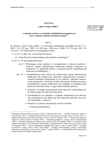 ©Kancelaria Sejmu s. 1/1 USTAWA Opracowano na podstawie: Dz.U. z 2008 r. Nr 141, poz. 888. z dnia 10 lipca 2008 r. o zmianie ustawy o swobodzie działalności gospodarczej oraz o zmianie niektórych innych ustaw1) Art. 1. W ustawie z dnia 2 lipca 2004 r. o swobodzie działalności gospodarczej (Dz. U. z 2007 r. Nr 155, poz. 1095 i Nr 180, poz. 1280 oraz z 2008 r. Nr 70, poz. 416 i Nr 116, poz. 732) wprowadza się następujące zmiany: 1) w art. 5 w pkt 2 lit. a otrzymuje brzmienie: „a) osobę fizyczną nieposiadającą obywatelstwa polskiego,”; 2) art. 9 i 10 otrzymują brzmienie: „Art. 9. Wykonując swoje zadania, w szczególności w zakresie nadzoru i kontroli, organy administracji publicznej działają wyłącznie na podstawie i w granicach prawa, z poszanowaniem uzasadnionych interesów przedsiębiorcy. Art. 10. 1. Przedsiębiorca może złożyć do właściwego organu administracji publicznej lub państwowej jednostki organizacyjnej wniosek o wydanie pisemnej interpretacji co do zakresu i sposobu zastosowania przepisów, z których wynika obowiązek świadczenia przez przedsiębiorcę daniny publicznej oraz składek na ubezpieczenia społeczne lub zdrowotne, w jego indywidualnej sprawie. 2. Wniosek o wydanie interpretacji może dotyczyć zaistniałego stanu faktycznego lub zdarzeń przyszłych. 3. Przedsiębiorca we wniosku o wydanie interpretacji jest obowiązany przedstawić stan faktyczny lub zdarzenie przyszłe oraz własne stanowisko w sprawie. 4. Wniosek o wydanie interpretacji zawiera również: 1) firmę przedsiębiorcy; 1) Niniejszą ustawą zmienia się ustawy: ustawę z dnia 20 maja 1971 r. – Kodeks wykroczeń, ustawę z dnia 26 lipca 1991 r. o podatku dochodowym od osób fizycznych, ustawę z dnia 15 lutego 1992 r. o podatku dochodowym od osób prawnych, ustawę z dnia 20 sierpnia 1997 r. o Krajowym Rejestrze Sądowym, ustawę z dnia 29 sierpnia 1997 r. - Ordynacja podatkowa, ustawę z dnia 13 października 1998 r. o systemie ubezpieczeń społecznych, ustawę z dnia 20 listopada 1998 r. o zryczałtowanym podatku dochodowym od niektórych przychodów osiąganych przez osoby fizyczne, ustawę z dnia 19 listopada 1999 r. - Prawo działalności gospodarczej, ustawę z dnia 11 marca 2004 r. o podatku od towarów i usług, ustawę z dnia 2 lipca 2004 r. - Przepisy wprowadzające ustawę o swobodzie działalności gospodarczej oraz ustawę z dnia 27 sierpnia 2004 r. o świadczeniach opieki zdrowotnej finansowanych ze środków publicznych. 2008-08-27 ©Kancelaria Sejmu s. 2/2 2) oznaczenie siedziby i adresu albo miejsca zamieszkania i adresu przedsiębiorcy; 3) numer identyfikacji podatkowej (NIP); 4) numer w rejestrze przedsiębiorców w Krajowym Rejestrze Sądowym albo w Ewidencji Działalności Gospodarczej; 5) adres do korespondencji w przypadku, gdy jest on inny niż adres siedziby albo adres zamieszkania przedsiębiorcy. 5. Udzielenie interpretacji następuje w drodze decyzji, od której przysługuje odwołanie. Interpretacja zawiera wskazanie prawidłowego stanowiska w sprawie wraz z uzasadnieniem prawnym oraz pouczeniem o prawie wniesienia środka zaskarżenia. 6. Wniosek o wydanie interpretacji podlega opłacie w wysokości 40 zł, którą należy wpłacić w terminie 7 dni od dnia złożenia wniosku. W razie nieuiszczenia opłaty w terminie wniosek pozostawia się bez rozpatrzenia. 7. W przypadku wystąpienia w jednym wniosku o wydanie interpretacji odrębnych stanów faktycznych lub zdarzeń przyszłych pobiera się opłatę od każdego przedstawionego we wniosku odrębnego stanu faktycznego lub zdarzenia przyszłego. 8. Opłata, o której mowa w ust. 6 i 7, stanowi odpowiednio dochód budżetu państwa, Narodowego Funduszu Zdrowia albo jednostki samorządu terytorialnego. 9. Opłatę od wniosku, o którym mowa w ust. 1, uiszcza się na rachunek organu administracji publicznej lub państwowej jednostki organizacyjnej, właściwych do wydania interpretacji albo, jeżeli istnieje taka możliwość, gotówką w kasie tego organu lub jednostki.”; 3) po art. 10 dodaje się art. 10a w brzmieniu: „Art. 10a. 1. Interpretację wydaje się bez zbędnej zwłoki, jednak nie później niż w terminie 30 dni od dnia otrzymania przez organ administracji publicznej lub państwową jednostkę organizacyjną kompletnego i opłaconego wniosku. W razie niewydania interpretacji w terminie uznaje się, że w dniu następującym po dniu, w którym upłynął termin wydania interpretacji, została wydana interpretacja stwierdzająca prawidłowość stanowiska przedsiębiorcy przedstawionego we wniosku o wydanie interpretacji. 2. Interpretacja nie jest wiążąca dla przedsiębiorcy, jednakże przedsiębiorca nie może być obciążony jakimikolwiek daninami publicznymi, sankcjami administracyjnymi, finansowymi lub karami w zakresie, w jakim zastosował się do uzyskanej interpretacji. 3. Interpretacja jest wiążąca dla organów administracji publicznej lub państwowych jednostek organizacyjnych właściwych dla przedsiębiorcy i może zostać zmieniona wyłącznie w drodze wznowienia postępowania. Nie zmienia się interpretacji, w wyniku której nastąpiły nieodwracalne skutki prawne. 2008-08-27 ©Kancelaria Sejmu s. 3/3 4. Zasady i tryb udzielania interpretacji przepisów prawa podatkowego reguluje ustawa z dnia 29 sierpnia 1997 r. - Ordynacja podatkowa (Dz. U. z 2005 r. Nr 8, poz. 60, z późn. zm.2)).”; 4) art. 11 otrzymuje brzmienie: „Art. 11. 1. Organy administracji publicznej są obowiązane do załatwiania spraw przedsiębiorców bez zbędnej zwłoki. 2. Organy administracji publicznej nie mogą odmówić przyjęcia pism i wniosków niekompletnych ani żądać jakichkolwiek dokumentów, których konieczność przedstawienia lub złożenia nie wynika wprost z przepisu prawa. 3. Terminy i tryb uzupełniania pism i wniosków, o których mowa w ust. 2, oraz terminy załatwiania spraw wynikających z tych pism i wniosków określają odrębne przepisy.”; 5) w art. 