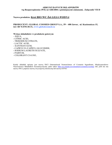 ARKUSZ DANYCH SKŁADNIKÓW wg Rozporządzenia (WE) nr 648/2004 z późniejszymi zmianami, Załącznik VII D Nazwa produktu: Kret BIO WC Żel LILIA WODNA PRODUCENT: GLOBAL COSMED GROUP S.A., 59 – 400 Jawor, ul. Kuziennicza 15, tel.+48 76 870-30-31, www.globalcosmed.eu Wykaz składników w produkcie gotowym - AQUA, - CITRIC ACID, - TRISODIUM CITRATE, - LACTIC ACID, - XANTHAN GUM, - CAPRYLYL/CAPRYL GLUCOSIDE, - SODIUM LAURETH SULFATE, - PARFUM, - COLORANT CI 61585, Każdy składnik opisany jest nazwą INCI (International Nomenclature of Cosmetic Ingredients, Międzynarodowe Nazewnictwo Składników Kosmetycznych), patrz także http://ec.europa.eu/consumers/cosmetics/cosing/ lub, jeśli nie ma nazwy INCI, poprzez nazwę zwyczajową chemiczną lub nazwę IUPAC
