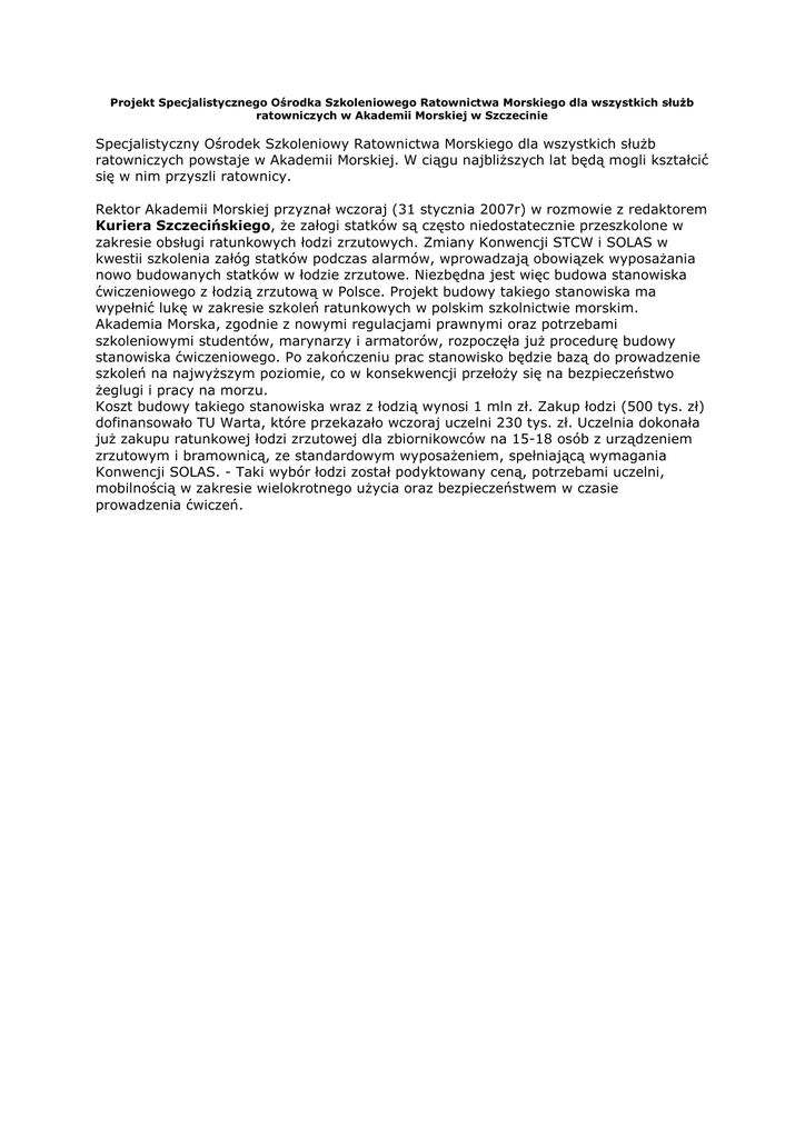 Projekt Specjalistycznego Ośrodka Szkoleniowego Ratownictwa Morskiego dla wszystkich służb ratowniczych w Akademii Morskiej w Szczecinie Specjalistyczny Ośrodek Szkoleniowy Ratownictwa Morskiego dla wszystkich służb ratowniczych powstaje w Akademii Morskiej. W ciągu najbliższych lat będą mogli kształcić się w nim przyszli ratownicy. Rektor Akademii Morskiej przyznał wczoraj (31 stycznia 2007r) w rozmowie z redaktorem Kuriera Szczecińskiego, że załogi statków są często niedostatecznie przeszkolone w zakresie obsługi ratunkowych łodzi zrzutowych. Zmiany Konwencji STCW i SOLAS w kwestii szkolenia załóg statków podczas alarmów, wprowadzają obowiązek wyposażania nowo budowanych statków w łodzie zrzutowe. Niezbędna jest więc budowa stanowiska ćwiczeniowego z łodzią zrzutową w Polsce. Projekt budowy takiego stanowiska ma wypełnić lukę w zakresie szkoleń ratunkowych w polskim szkolnictwie morskim. Akademia Morska, zgodnie z nowymi regulacjami prawnymi oraz potrzebami szkoleniowymi studentów, marynarzy i armatorów, rozpoczęła już procedurę budowy stanowiska ćwiczeniowego. Po zakończeniu prac stanowisko będzie bazą do prowadzenie szkoleń na najwyższym poziomie, co w konsekwencji przełoży się na bezpieczeństwo żeglugi i pracy na morzu. Koszt budowy takiego stanowiska wraz z łodzią wynosi 1 mln zł. Zakup łodzi (500 tys. zł) dofinansowało TU Warta, które przekazało wczoraj uczelni 230 tys. zł. Uczelnia dokonała już zakupu ratunkowej łodzi zrzutowej dla zbiornikowców na 15-18 osób z urządzeniem zrzutowym i bramownicą, ze standardowym wyposażeniem, spełniającą wymagania Konwencji SOLAS. - Taki wybór łodzi został podyktowany ceną, potrzebami uczelni, mobilnością w zakresie wielokrotnego użycia oraz bezpieczeństwem w czasie prowadzenia ćwiczeń.