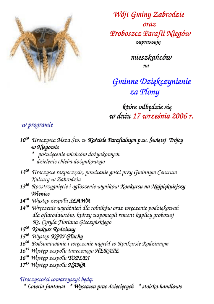 Wójt Gminy Zabrodzie oraz Proboszcz Parafii Niegów zapraszają mieszkańców na Gminne Dziękczynienie za Plony które odbędzie się w dniu 17 września 2006 r. w program programie rogramie 1000 Uroczysta Msza Św. w Kościele Parafialnym p.w. Świętej Trójcy w Niegowie * poświęcenie wieńców dożynkowych * dzielenie chleba dożynkowego 1300 Uroczyste rozpoczęcie, powitanie gości przy Gminnym Centrum Kultury w Zabrodziu 30 13 Rozstrzygnięcie i ogłoszenie wyników Konkursu na Najpiękniejszy Wieniec Wieniec 00 14 Występ zespołu SŁAWA 1430 Wręczenie wyróżnień dla rolników oraz wręczenie podziękowań dla ofiarodawców, którzy wspomogli remont kaplicy grobowej Ks. Cyryla Floriana Gieczyńskiego 00 15 Konkurs Rodzinny 1540 Występ KGW Głuchy Głuchy 00 16 Podsumowanie i wręczenie nagród w Konkursie Rodzinnym 1615 Występ zespołu tanecznego HEKATE 1630 Występ zespołu TOPLES 1745 Występ zespołu NANA Uroczystości towarzyszyć będą: * Loteria fantowa * Wystawa prac dziecięcych * stoiska handlowe