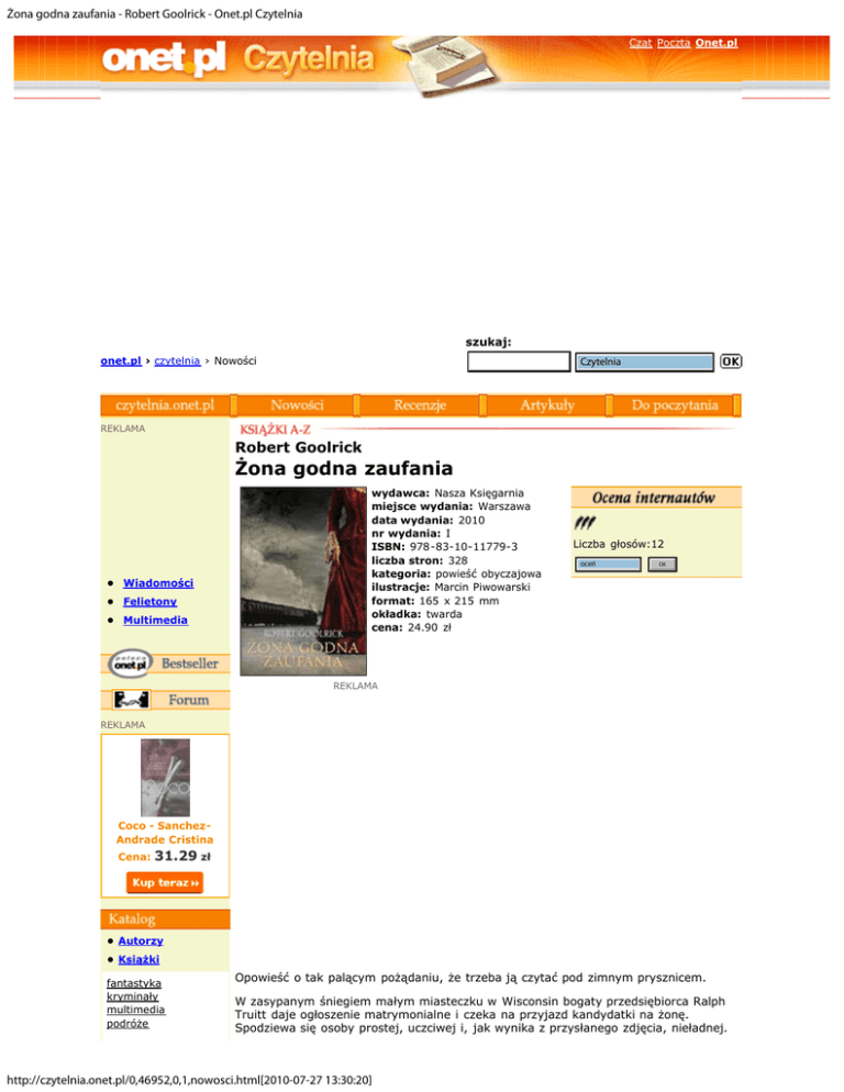 Żona godna zaufania - Robert Goolrick - Onet.pl Czytelnia Czat Poczta Onet.pl szukaj: onet.pl › czytelnia › Nowości Czytelnia Czytelnia Strony WWW: REKLAMA Robert Goolrick Żona godna zaufania • Wiadomości • Felietony • Multimedia wydawca: Nasza Księgarnia miejsce wydania: Warszawa data wydania: 2010 nr wydania: I ISBN: 978-83-10-11779-3 liczba stron: 328 kategoria: powieść obyczajowa ilustracje: Marcin Piwowarski format: 165 x 215 mm okładka: twarda cena: 24.90 zł Liczba głosów:12 oceń oceń 5 piórek OK REKLAMA REKLAMA Coco - SanchezAndrade Cristina Cena: 31.29 zł • Autorzy • Książki fantastyka kryminały multimedia podróże Opowieść o tak palącym pożądaniu, że trzeba ją czytać pod zimnym prysznicem. W zasypanym śniegiem małym miasteczku w Wisconsin bogaty przedsiębiorca Ralph Truitt daje ogłoszenie matrymonialne i czeka na przyjazd kandydatki na żonę. Spodziewa się osoby prostej, uczciwej i, jak wynika z przysłanego zdjęcia, nieładnej. http://czytelnia.onet.pl/0,46952,0,1,nowosci.html[2010-07-27 13:30:20] Żona godna zaufania - Robert Goolrick - Onet.pl Czytelnia popularnonaukowe powieść obyczajowa przewodniki psychologia socjologia zdrowie, seks Ku jego zdumieniu z pociągu wysiada tajemnicza piękność. Zaniepokojony Ralph ma wiele wątpliwości i podejrzeń, lecz gdy nieznajoma już w drodze do domu ratuje mu życie, jest gotów jej zaufać. A jednak pierwsze wrażenie było słuszne... Ta osadzona na początku XX wieku opowieść o trojgu ludzi udręczonych gniewem, tłumionymi pragnieniami i poczuciem winy jest subtelną miłosno-kryminalną balladą o więcej » czułości, która zabija, i o truciźnie, która daje nadzieję na odkupienie. • Wydawnictwa • Serie Inne książki w tej kategorii » OnetBoksy • ABC literatury Chcê odnie¶æ sukces! więcej » Poczu³em ju¿ jego smak Teatr, film, reklama, sztuka tomaszgolaski.pl • Robin Hood Polskie Radio Londyn • I love you Phillip Morris fakty,muzyka,gry,zabawy,informacje s³uchaj nas w DAB i internecje www.prl24.net • W chmurach Szukasz PRACY? Sprawd¼ akutalne og³oszenia! Grosik24.pl: Praca dla Ciebie! www.Grosik24.pl Napisz swoją recenzję » nie ma jeszcze żadnych eRecenzji Dodaj swój komentarz » 23 komentarze Twój e-mail: Zapisz się więcej » napisz do nas O czym [16] O czym jest ta książka dla Was? O miłości? Zagubieniu? ... 26.07.2010 08:39 ~koala Śliczna okładka [1] Naprawdę bardzo łądnie wydana książka. Od razu przyciąga ... 13.07.2010 00:08 ~omega Pytanie- [1] Czy ktoś już przeczytał i może podzielić się wrażeniami?:) 30.06.2010 23:21 ~tylda według mnie... [1] Dla mnie to książka, która kojarzy się ze stylem Jane ... 30.06.2010 01:11 ~gaja zobacz wszystkie wypowiedzi » Ciekawe: Randki Mapa Polski VoD Czat Projekty domów Nieruchomości Copyright 1996 - 2010 Grupa Onet.pl SA - Wszystkie serwisy » Polityka prywatności » Indeks Onetu » http://czytelnia.onet.pl/0,46952,0,1,nowosci.html[2010-07-27 13:30:20] do góry