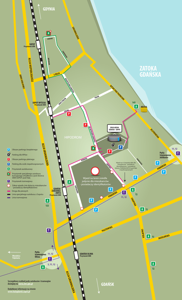 GDYNIA K LDZ NWA GRU A A CHOPINA SOPOT Przystanek SKM SOB IES GO KIE KOŚCIUSZKI A 3 MA J WŁ P OD TK A YP KIE TW BI ŁO WA SŁA ADY WEJ KRA JO DLEGŁOŚCI ALEJA NIEPO ARMII ZATOKA GDAŃSKA I NA JA Przystanek SKM AM SOPOT WYŚCIGI WC ŁO NA POL A N OL ZK 143 A HESTIA A POLN P SK OW ITK A Parking dla osób niepełnosprawnych ACKA Wjazd na ul. Gospody tylko dla mieszkanców - posiadaczy identyfikatorów + posiadaczy biletów PARKINGOWYCH pod Hala i niepełnosprawnych! OD SP GO LDZKA RYB Przystanek autobusowy A Przystanek specjalnego autobusu kursujacego whadłowo z pod dworca SKM SOPOT pod Halę Y A Przystanek tramwajowy A SUBIS Zakaz wjazdu (nie dotyczy mieszkanców - posiadaczy identyfikatorów) Linia specjalnego autobusu z Sopotu P A RSK O Przystanek SKM P A 122 A T2 A T2 ALEJA KA Z WALD GRUN Dodatkowe informacje na stronie www.halagdansk.sopot.pl T2 Przystanek SKM 5, 11, 12 Szczegółowy rozkład jazdy autobusów i tramwajów dostepny na www.ztm.gda.pl T2 GDAŃSK OLIWA T A KA S TOW PIAS Pętla tramwajowa 11, 12 Oliwa 11, 12 A CHŁOPSKA Obwodnica Trójmiasta T A P T P KA OPS CHŁ POM Linia tramwajowa KA ORS POM P Wjazd na teren osiedla jedynie dla mieszkanców - posiadaczy identyfikatorów ŁAWA GDAŃSK ŻABIANKA - AWFiS Droga dla pieszych P O P Pętla tramwajowa Jelitkowo IEG Obszar parkingu płatnego 11, 12 P SK P P BIE Parking dla VIPów A SO P P RUNWA Obszar parkingu bezpłatnego JEL ALEJA G P T IETKA HIPODROM ERGO ARENA GDANSK - SOPOT OK WA Ł YSŁA WŁAD P GDAŃSK LOŃSK JAGIE A T