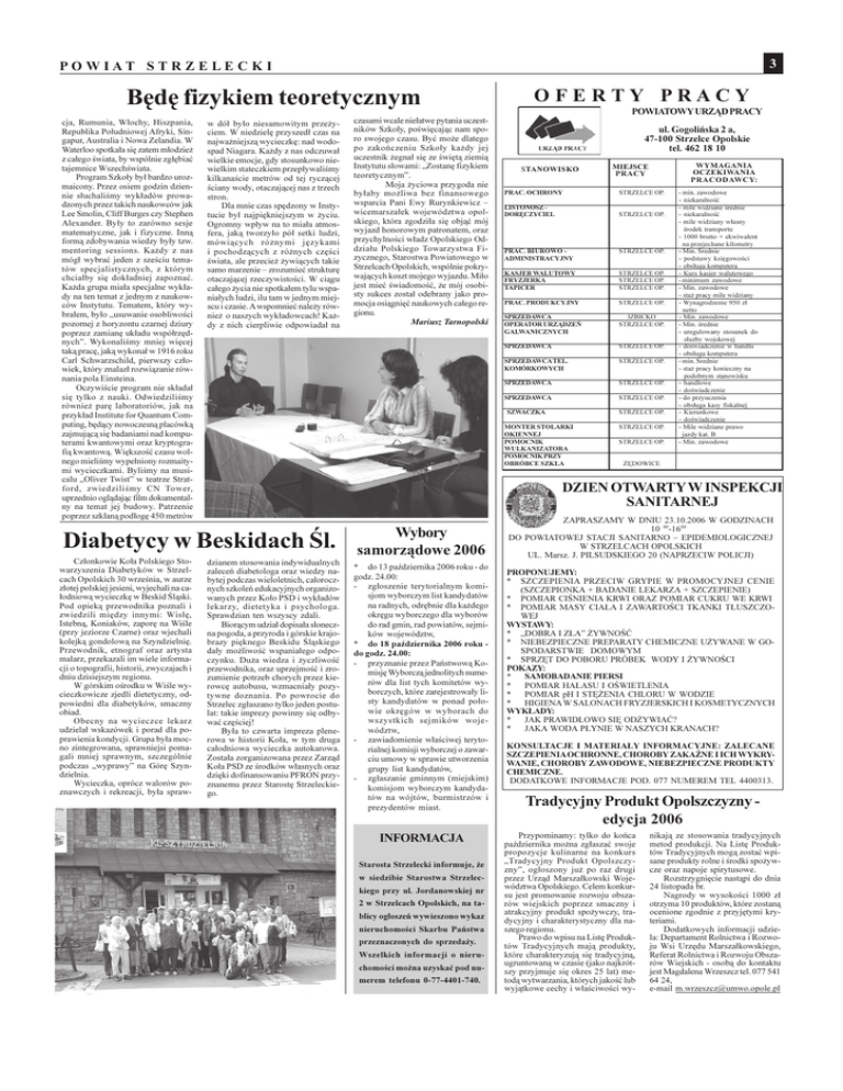 3 POWIAT STR Z E LE C K I Bêdê fizykiem teoretycznym cja, Rumunia, W³ochy, Hiszpania, Republika Po³udniowej Afryki, Singapur, Australia i Nowa Zelandia. W Waterloo spotka³a siê zatem m³odzie¿ z ca³ego wiata, by wspólnie zg³êbiaæ tajemnice Wszechwiata. Program Szko³y by³ bardzo urozmaicony. Przez osiem godzin dziennie s³uchalimy wyk³adów prowadzonych przez takich naukowców jak Lee Smolin, Cliff Burges czy Stephen Alexander. By³y to zarówno sesje matematyczne, jak i fizyczne. Inn¹ form¹ zdobywania wiedzy by³y tzw. mentoring sessions. Ka¿dy z nas móg³ wybraæ jeden z szeciu tematów specjalistycznych, z którym chcia³by siê dok³adniej zapoznaæ. Ka¿da grupa mia³a specjalne wyk³ady na ten temat z jednym z naukowców Instytutu. Tematem, który wybra³em, by³o usuwanie osobliwoci pozornej z horyzontu czarnej dziury poprzez zamianê uk³adu wspó³rzêdnych. Wykonalimy mniej wiêcej tak¹ pracê, jak¹ wykona³ w 1916 roku Carl Schwarzschild, pierwszy cz³owiek, który znalaz³ rozwi¹zanie równania pola Einsteina. Oczywicie program nie sk³ada³ siê tylko z nauki. Odwiedzilimy równie¿ parê laboratoriów, jak na przyk³ad Institute for Quantum Computing, bêd¹cy nowoczesn¹ placówk¹ zajmuj¹c¹ siê badaniami nad komputerami kwantowymi oraz kryptografi¹ kwantow¹. Wiêkszoæ czasu wolnego mielimy wype³niony rozmaitymi wycieczkami. Bylimy na musicalu Oliver Twist w teatrze Stratford, zwiedzilimy CN Tower, uprzednio ogl¹daj¹c film dokumentalny na temat jej budowy. Patrzenie poprzez szklan¹ pod³ogê 450 metrów w dó³ by³o niesamowitym prze¿yciem. W niedzielê przyszed³ czas na najwa¿niejsz¹ wycieczkê: nad wodospad Niagara. Ka¿dy z nas odczuwa³ wielkie emocje, gdy stosunkowo niewielkim stateczkiem przep³ywalimy kilkanacie metrów od tej rycz¹cej ciany wody, otaczaj¹cej nas z trzech stron. Dla mnie czas spêdzony w Instytucie by³ najpiêkniejszym w ¿yciu. Ogromny wp³yw na to mia³a atmosfera, jak¹ tworzy³o pó³ setki ludzi, mówi¹cych ró¿nymi jêzykami i pochodz¹cych z ró¿nych czêci wiata, ale przecie¿ ¿ywi¹cych takie samo marzenie zrozumieæ strukturê otaczaj¹cej rzeczywistoci. W ci¹gu ca³ego ¿ycia nie spotka³em tylu wspania³ych ludzi, ilu tam w jednym miejscu i czasie. A wspomnieæ nale¿y równie¿ o naszych wyk³adowcach! Ka¿dy z nich cierpliwie odpowiada³ na Cz³onkowie Ko³a Polskiego Stowarzyszenia Diabetyków w Strzelcach Opolskich 30 wrzenia, w aurze z³otej polskiej jesieni, wyjechali na ca³odniow¹ wycieczkê w Beskid l¹ski. Pod opiek¹ przewodnika poznali i zwiedzili miêdzy innymi: Wis³ê, Istebn¹, Koniaków, zaporê na Wile (przy jeziorze Czarne) oraz wjechali kolejk¹ gondolow¹ na Szyndzielniê. Przewodnik, etnograf oraz artysta malarz, przekazali im wiele informacji o topografii, historii, zwyczajach i dniu dzisiejszym regionu. W górskim orodku w Wile wycieczkowicze zjedli dietetyczny, odpowiedni dla diabetyków, smaczny obiad. Obecny na wycieczce lekarz udziela³ wskazówek i porad dla poprawienia kondycji. Grupa by³a mocno zintegrowana, sprawniejsi pomagali mniej sprawnym, szczególnie podczas wyprawy na Górê Szyndzielnia. Wycieczka, oprócz walorów poznawczych i rekreacji, by³a spraw- dzianem stosowania indywidualnych zaleceñ diabetologa oraz wiedzy nabytej podczas wieloletnich, ca³orocznych szkoleñ edukacyjnych organizowanych przez Ko³o PSD i wyk³adów lekarzy, dietetyka i psychologa. Sprawdzian ten wszyscy zdali. Bior¹cym udzia³ dopisa³a s³oneczna pogoda, a przyroda i górskie krajobrazy piêknego Beskidu l¹skiego da³y mo¿liwoæ wspania³ego odpoczynku. Du¿a wiedza i ¿yczliwoæ przewodnika, oraz uprzejmoæ i zrozumienie potrzeb chorych przez kierowcê autobusu, wzmacnia³y pozytywne doznania. Po powrocie do Strzelec zg³aszano tylko jeden postulat: takie imprezy powinny siê odbywaæ czêciej! By³a to czwarta impreza plenerowa w historii Ko³a, w tym druga ca³odniowa wycieczka autokarowa. Zosta³a zorganizowana przez Zarz¹d Ko³a PSD ze rodków w³asnych oraz dziêki dofinansowaniu PFRON przyznanemu przez Starostê Strzeleckiego. czasami wcale nie³atwe pytania uczestników Szko³y, powiêcaj¹c nam sporo swojego czasu. Byæ mo¿e dlatego po zakoñczeniu Szko³y ka¿dy jej uczestnik ¿egna³ siê ze wiêt¹ ziemi¹ Instytutu s³owami: Zostanê fizykiem teoretycznym. Moja ¿yciowa przygoda nie by³aby mo¿liwa bez finansowego wsparcia Pani Ewy Rurynkiewicz wicemarsza³ek województwa opolskiego, która zgodzi³a siê obj¹æ mój wyjazd honorowym patronatem, oraz przychylnoci w³adz Opolskiego Oddzia³u Polskiego Towarzystwa Fizycznego, Starostwa Powiatowego w Strzelcach Opolskich, wspólnie pokrywaj¹cych koszt mojego wyjazdu. Mi³o jest mieæ wiadomoæ, ¿e mój osobisty sukces zosta³ odebrany jako promocja osi¹gniêæ naukowych ca³ego regionu. Mariusz Tarnopolski OFERTY PRACY POWIATOWY URZ¥D PRACY ul. Gogoliñska 2 a, 47-100 Strzelce Opolskie tel. 462 18 10 STANOWISKO PRAC. OCHRONY STRZELCE OP. LISTONOSZ DORÊCZYCIEL STRZELCE OP. PRAC. BIUROWO ADMINISTRACYJNY KASJER WALUTOWY FRYZJERKA TAPICER PRAC. PRODUKCYJNY SPRZEDAWCA OPERATOR URZ¥DZEÑ GALWANICZNYCH SPRZEDAWCA SPRZEDAWCA TEL. KOMÓRKOWYCH STRZELCE OP. STRZELCE OP. STRZELCE OP. STRZELCE OP. STRZELCE OP. IZBICKO STRZELCE OP. STRZELCE OP. STRZELCE OP. SPRZEDAWCA STRZELCE OP. SPRZEDAWCA STRZELCE OP. STRZELCE OP. SZWACZKA MONTER STOLARKI OKIENNEJ POMOCNIK WULKANIZATORA POMOCNIK PRZY OBRÓBCE SZK£A Diabetycy w Beskidach l. WYMAGANIA OCZEKIWANIA PRACODAWCY: MIEJSCE PRACY STRZELCE OP. STRZELCE OP. - min. zawodowe - niekaralnoæ - mile widziane rednie - niekaralnoæ - mile widziany w³asny rodek transportu - 1000 brutto + ekwiwalent na przejechane kilometry - Min. rednie - podstawy ksiêgowoci - obs³uga komputera - Kurs kasjer walutowego - minimum zawodowe - Min. zawodowe - sta¿ pracy mile widziany - Wynagrodzenie 950 z³ netto - Min. zawodowe - Min. rednie - uregulowany stosunek do s³u¿by wojskowej - dowiadcz