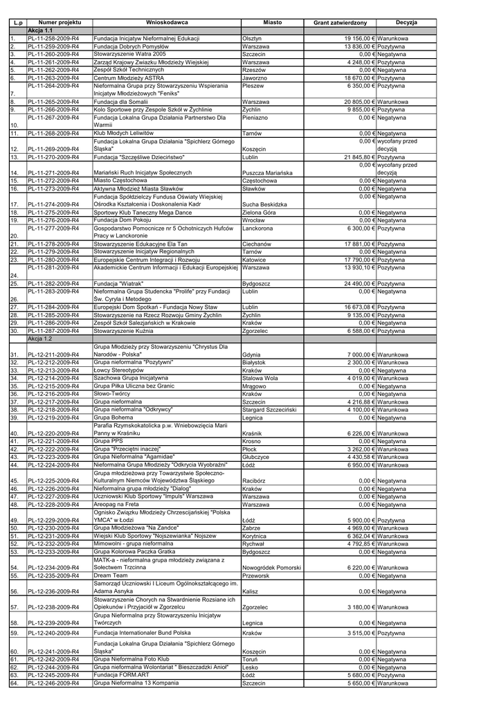 L.p 1. 2. 3. 4. 5. 6. 7. 8. 9. Numer projektu Akcja 1.1 PL-11-258-2009-R4 PL-11-259-2009-R4 PL-11-260-2009-R4 PL-11-261-2009-R4 PL-11-262-2009-R4 PL-11-263-2009-R4 PL-11-264-2009-R4 PL-11-265-2009-R4 PL-11-266-2009-R4 PL-11-267-2009-R4 10. 11. PL-11-268-2009-R4 12. 13. PL-11-269-2009-R4 PL-11-270-2009-R4 14. 15. 16. PL-11-271-2009-R4 PL-11-272-2009-R4 PL-11-273-2009-R4 17. 18. 19. PL-11-274-2009-R4 PL-11-275-2009-R4 PL-11-276-2009-R4 PL-11-277-2009-R4 20. 21. 22. 23. 24. 25. 26. 27. 28. 29. 30. PL-11-278-2009-R4 PL-11-279-2009-R4 PL-11-280-2009-R4 PL-11-281-2009-R4 PL-11-282-2009-R4 PL-11-283-2009-R4 PL-11-284-2009-R4 PL-11-285-2009-R4 PL-11-286-2009-R4 PL-11-287-2009-R4 Akcja 1.2 Wnioskodawca Miasto Grant zatwierdzony Decyzja Fundacja Inicjatyw Nieformalnej Edukacji Fundacja Dobrych Pomysłów Stowarzyszenie Watra 2005 Zarząd Krajowy Zwiazku MłodzieŜy Wiejskiej Zespół Szkół Technicznych Centrum MłodzieŜy ASTRA Nieformalna Grupa przy Stowarzyszeniu Wspierania Inicjatyw MłodzieŜowych "Feniks" Fundacja dla Somalii Kolo Sportowe przy Zespole Szkół w śychlinie Fundacja Lokalna Grupa Działania Partnerstwo Dla Warmii Klub Młodych Leliwitów Fundacja Lokalna Grupa Działania "Spichlerz Górnego Śląska" Fundacja "Szczęśliwe Dzieciństwo" Olsztyn Warszawa Szczecin Warszawa Rzeszów Jaworzno Pleszew 19 156,00 € 13 836,00 € 0,00 € 4 248,00 € 0,00 € 18 670,00 € 6 350,00 € Warszawa śychlin Pieniazno 20 805,00 € Warunkowa 9 855,00 € Pozytywna 0,00 € Negatywna Tarnów Mariański Ruch Inicjatyw Społecznych Miasto Częstochowa Aktywna MłodzieŜ Miasta Sławków Fundacja Spółdzielczy Fundusa Oświaty Wiejskiej Ośrodka Kształcenia i Doskonalenia Kadr Sportowy Klub Taneczny Mega Dance Fundacja Dom Pokoju Gospodarstwo Pomocnicze nr 5 Ochotniczych Hufców Pracy w Lanckoronie Stowarzyszenie Edukacyjne Ela Tan Stowarzyszenie Inicjatyw Regionalnych Europejskie Centrum Integracji i Rozwoju Akademickie Centrum Informacji i Edukacji Europejskiej Puszcza Mariańska Częstochowa Sławków 0,00 € Negatywna 0,00 € wycofany przed decyzją 21 845,80 € Pozytywna 0,00 € wycofany przed decyzją 0,00 € Negatywna 0,00 € Negatywna 0,00 € Negatywna Fundacja "Wiatrak" Nieformalna Grupa Studencka "Prolife" przy Fundacji Św. Cyryla i Metodego Europejski Dom Spotkań - Fundacja Nowy Staw Stowarzyszenie na Rzecz Rozwoju Gminy śychlin Zespół Szkół Salezjańskich w Krakowie Stowarzyszenie Kuźnia Koszęcin Lublin Sucha Beskidzka Zielona Góra Wrocław Lanckorona Warunkowa Pozytywna Negatywna Pozytywna Negatywna Pozytywna Pozytywna 0,00 € Negatywna 0,00 € Negatywna 6 300,00 € Pozytywna Ciechanów Tarnów Katowice Warszawa 17 881,00 € 0,00 € 17 790,00 € 13 930,10 € Pozytywna Negatywna Pozytywna Pozytywna Bydgoszcz Lublin 24 490,00 € Pozytywna 0,00 € Negatywna Lublin śychlin Kraków Zgorzelec 16 673,08 € 9 135,00 € 0,00 € 6 588,00 € Pozytywna Pozytywna Negatywna Pozytywna Gdynia Białystok Kraków Stalowa Wola Mrągowo Kraków Szczecin Stargard Szczeciński Legnica 7 000,00 € 2 300,00 € 0,00 € 4 019,00 € 0,00 € 0,00 € 4 216,88 € 4 100,00 € 0,00 € Warunkowa Warunkowa Negatywna Warunkowa Negatywna Negatywna Warunkowa Warunkowa Negatywna Kraśnik Krosno Płock Głubczyce Łódź 6 226,00 € 0,00 € 3 262,00 € 4 430,58 € 6 950,00 € Warunkowa Negatywna Warunkowa Warunkowa Warunkowa Racibórz Kraków Warszawa Warszawa 0,00 € 0,00 € 0,00 € 0,00 € Łódź Zabrze Korytnica Rychwał Bydgoszcz 5 900,00 € 4 969,00 € 6 362,04 € 4 792,85 € 0,00 € Nowogródek Pomorski Przeworsk 6 220,00 € Warunkowa 0,00 € Negatywna 58. PL-12-239-2009-R4 Grupa MłodzieŜy przy Stowarzyszeniu "Chrystus Dla Narodów - Polska" Grupa nieformalna "Pozytywni" Łowcy Stereotypów Szachowa Grupa Inicjatywna Grupa Piłka Uliczna bez Granic Słowo-Twórcy Grupa nieformalna Grupa nieformalna "Odkrywcy" Grupa Bohema Parafia Rzymskokatolicka p.w. Wniebowzięcia Marii Panny w Kraśniku Grupa PPS Grupa "Przeciętni inaczej" Grupa Nieformalna "Agamidae" Nieformalna Grupa MłodzieŜy "Odkrycia Wyobraźni" Grupa młodzieŜowa przy Towarzystwie SpołecznoKulturalnym Niemców Województwa Śląskiego Nieformalna grupa młodzieŜy "Dialog" Uczniowski Klub Sportowy "Impuls" Warszawa Areopag na Freta Ognisko Związku MłodzieŜy Chrzescijańskiej "Polska YMCA" w Łodzi Grupa MłodzieŜowa "Na Zandce" Wiejski Klub Sportowy "Nojszewianka" Nojszew Mimowolni - grupa nieformalna Grupa Kolorowa Paczka Gratka MATK-a - nieformalna grupa młodzieŜy związana z Sołectwem Trzcinna Dream Team Samorząd Uczniowski I Liceum Ogólnokształcącego im. Adama Asnyka Stowarzyszenie Chorych na Stwardnienie Rozsiane ich Opiekunów i Przyjaciół w Zgorzelcu Grupa Nieformalna przy Stowarzyszeniu Inicjatyw Twórczych Legnica 0,00 € Negatywna 59. PL-12-240-2009-R4 Fundacja Internationaler Bund Polska Kraków 3 515,00 € Pozytywna 60. 61. 62. 63. 64. PL-12-241-2009-R4 PL-12-242-2009-R4 PL-12-244-2009-R4 PL-12-245-2009-R4 PL-12-246-2009-R4 Fundacja Lokalna Grupa Działania "Spichlerz Górnego Śląska" Grupa Nieformalna Foto Klub Grupa nieformalna Wolontariat " Bieszczadzki Anioł" Fundacja FORM.ART Grupa Nieformalna 13 Kompania Koszęcin Toruń Lesko Łódź Szczecin 0,00 € 0,00 € 0,00 € 5 680,00 € 5 650,00 € 31. 32. 33. 34. 35. 36. 37. 38. 39. PL-12-211-2009-R4 PL-12-212-2009-R4 PL-12-213-2009-R4 PL-12-214-2009-R4 PL-12-215-2009-R4 PL-12-216-2009-R4 PL-12-217-2009-R4 PL-12-218-2009-R4 PL-12-219-2009-R4 40. 41. 42. 43. 44. PL-12-220-2009-R4 PL-12-221-2009-R4 PL-12-222-2009-R4 PL-12-223-2009-R4 PL-12-224-2009-R4 45. 46. 47. 48. PL-12-225-2009-R4 PL-12-226-2009-R4 PL-12-227-2009-R4 PL-12-228-2009-R4 49. 50. 51. 52. 53. PL-12-229-2009-R4 PL-12-230-2009-R4 PL-12-231-2009-R4 PL-12-232-2009-R4 PL-12-233-2009-R4 54. 55. PL-12-234-2009-R4 PL-12-235-2009-R4 56. PL-12-236-2009-R4 57. PL-12-238-2009-R4 Kalisz Zgorzelec Negatywna Negatywna Negatywna Negatywna Pozytywna Warun