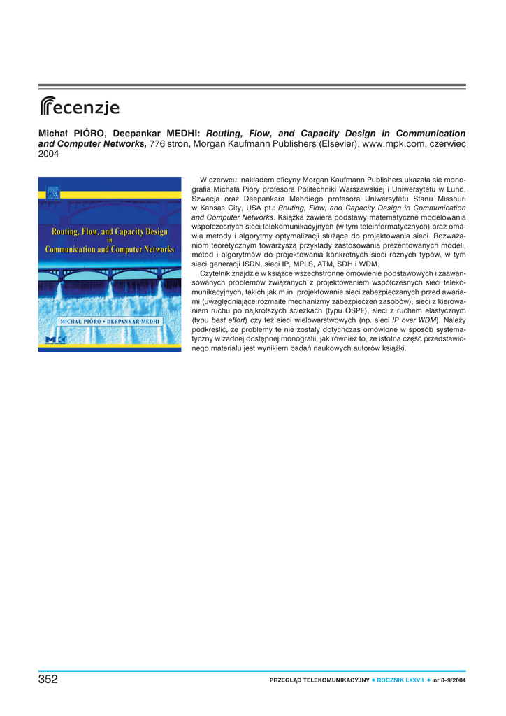ecenzje Michał PIÓRO, Deepankar MEDHI: Routing, Flow, and Capacity Design in Communication and Computer Networks, 776 stron, Morgan Kaufmann Publishers (Elsevier), www.mpk.com, czerwiec 2004 W czerwcu, nakładem oficyny Morgan Kaufmann Publishers ukazała się monografia Michała Pióry profesora Politechniki Warszawskiej i Uniwersytetu w Lund, Szwecja oraz Deepankara Mehdiego profesora Uniwersytetu Stanu Missouri w Kansas City, USA pt.: Routing, Flow, and Capacity Design in Communication and Computer Networks. Książka zawiera podstawy matematyczne modelowania współczesnych sieci telekomunikacyjnych (w tym teleinformatycznych) oraz omawia metody i algorytmy optymalizacji służące do projektowania sieci. Rozważaniom teoretycznym towarzyszą przykłady zastosowania prezentowanych modeli, metod i algorytmów do projektowania konkretnych sieci różnych typów, w tym sieci generacji ISDN, sieci IP, MPLS, ATM, SDH i WDM. Czytelnik znajdzie w książce wszechstronne omówienie podstawowych i zaawansowanych problemów związanych z projektowaniem współczesnych sieci telekomunikacyjnych, takich jak m.in. projektowanie sieci zabezpieczanych przed awariami (uwzględniające rozmaite mechanizmy zabezpieczeń zasobów), sieci z kierowaniem ruchu po najkrótszych ścieżkach (typu OSPF), sieci z ruchem elastycznym (typu best effort) czy też sieci wielowarstwowych (np. sieci IP over WDM). Należy podkreślić, że problemy te nie zostały dotychczas omówione w sposób systematyczny w żadnej dostępnej monografii, jak również to, że istotna część przedstawionego materiału jest wynikiem badań naukowych autorów książki. 352 PRZEGLĄD TELEKOMUNIKACYJNY ! ROCZNIK LXXVII ! nr 8–9/2004 Podstawowym podejściem matematycznym stosowanym w książce jest teoria tzw. sieci przepływów wielotowarowych. Jest ona wyczerpująco wyjaśniona i w interesujący sposób rozwinięte w kontekście modelowania sieci telekomunikacyjnych i metod ich optymalizacji. Wyłożone zagadnienia o charakterze metodologicznym są bogato ilustrowane licznymi przykładami, co ułatwi Czytelnikowi zrozumienie, jak opisane metody formalne mogą być zastosowane w praktyce inżynierskiej. Książka składa się z trzynastu rozdziałów zgrupowanych w trzech częściach i z czterech dodatków. Część pierwsza zaznajamia Czytelnika z podstawowymi ideami projektowania sieci, wprowadza odpowiednią notację oraz sposoby formułowania problemów projektowania sieci, a część druga wprowadza klasyczne i nowe modele oraz metody projektowania sieci. W części trzeciej przedstawiono modele zaawansowane, związane z problematyką projektowania sieci odpornych na awarie, sieci z niepokrywającymi się godzinami największego ruchu, sieci o wielu warstwach zasobów itp. W dodatkach (które stanowią wartość same w sobie) zawarto podstawy teorii optymalizacji i NP-zupełności, przedstawiono algorytmy doty- czące wyszukiwania najkrótszych ścieżek w sieci oraz pakiety optymalizacyjne programowania liniowego i całkowitoliczbowego. Monografia jest wyczerpującym źródłem wiedzy o modelach matematycznych i metodach projektowania sieci telekomunikacyjnych zarówno dla doświadczonych projektantów (część III), jak i dla nowych adeptów tej sztuki (części I i II). Może też być z powodzeniem stosowana jako podręcznik akademicki i być pomocna przy kształtowaniu treści programowych wykładów prowadzonych na różnym poziomie zaawansowania. Pomogą w tym ciekawe zestawy ćwiczeń umieszczonych po każdym rozdziale (rozwiązania wybranych ćwiczeń zamieszczono na końcu książki). Wartością samą w sobie jest też niezwykle bogata bibliografia (35 stron). Jestem przekonany, że recenzowana książka stanie się w najbliższych latach ważnym punktem odniesienia w dziedzinie metod modelowania i projektowania sieci telekomunikacyjnych. Przewiduję, że odniesie znaczący sukces w skali międzynarodowej. Gorąco ją polecam! Prof. Józef Lubacz Z działalności SEP Wyniki XXVIII Konkursu im. prof. M. Pożaryskiego Jury, pod przewodnictwem prof. dr. hab. inż. Mieczysława Heringa, rozstrzygnęło XXVIII Konkurs im. prof. Mieczysława Pożaryskiego na najlepsze artykuły opublikowane w 2003 r. w czasopismach Stowarzyszenia Elektryków Polskich. Na konkurs zgłoszono 40 artykułów. Jury, zgodnie z Regulaminem Konkursu, przyznało 3 nagrody oraz 3 wyróżnienia. Uroczystość wręczenia laureatom dyplomów, listów gratulacyjnych i nagród pieniężnych odbyła się 21 czerwca br. podczas imprezy: Spotkanie z Elektryką, w Villa Foksal w Warszawie. I nagrodę otrzymał M mgr inż. Zbigniew DUDEK za cykl artykułów: – Interfejs BCI – próba przełamania bariery pomiędzy człowiekiem a komputerem, – Pierwsze urządzenia bezpośrednio sterowane falami mózgowymi. Przeszkody ostatniego metra pokonane? opublikowanych w numerach 7 i 11 Przeglądu Telekomunikacyjnego i Wiadomości Telekomunikacyjnych. II nagrodę otrzymali: M prof. dr hab. inż. Jan Popczyk z Politechniki Śląskiej za artykuł: Aktualna sytuacja wielkich odbiorców energii elektrycznej w Polsce, opublikowany w numerze 7 Energetyki. M prof. dr hab. inż. Bohdan Mroziewicz z Instytutu Technologii Elektronowej w Warszawie za 3-częściowy artykuł: Półprzewodnikowe diody elektroluminescencyjne (LED): Część I. HB-LED – diody o wysokiej jaskrawości, Część II. Rewolucja w optoelektronice – LED emitujące światło niebieskie, PRZEGLĄD TELEKOMUNIKACYJNY ! ROCZNIK LXXVII ! nr 8–9/2004 Część III. Diody LED emitujące światło białe. Zostały one opublikowane w numerach 5, 6, 7–8 Elektronizacji. Wyróżnienia otrzymali: M dr inż. Zbigniew Białkiewicz redaktor działu historycznego Śląskich Wiadomości Elektrotechnicznych za cykl artykułów Sylwetki Prezesów SEP. opublikowanych w numerach 1, 2-3, 4-5, 6, 7-8, 9-10, 11-12 Magazynu Informacyjnego SEP Spektrum. M prof. dr hab. inż. Stanisław Piróg, mgr inż. Stanisław Gąsio