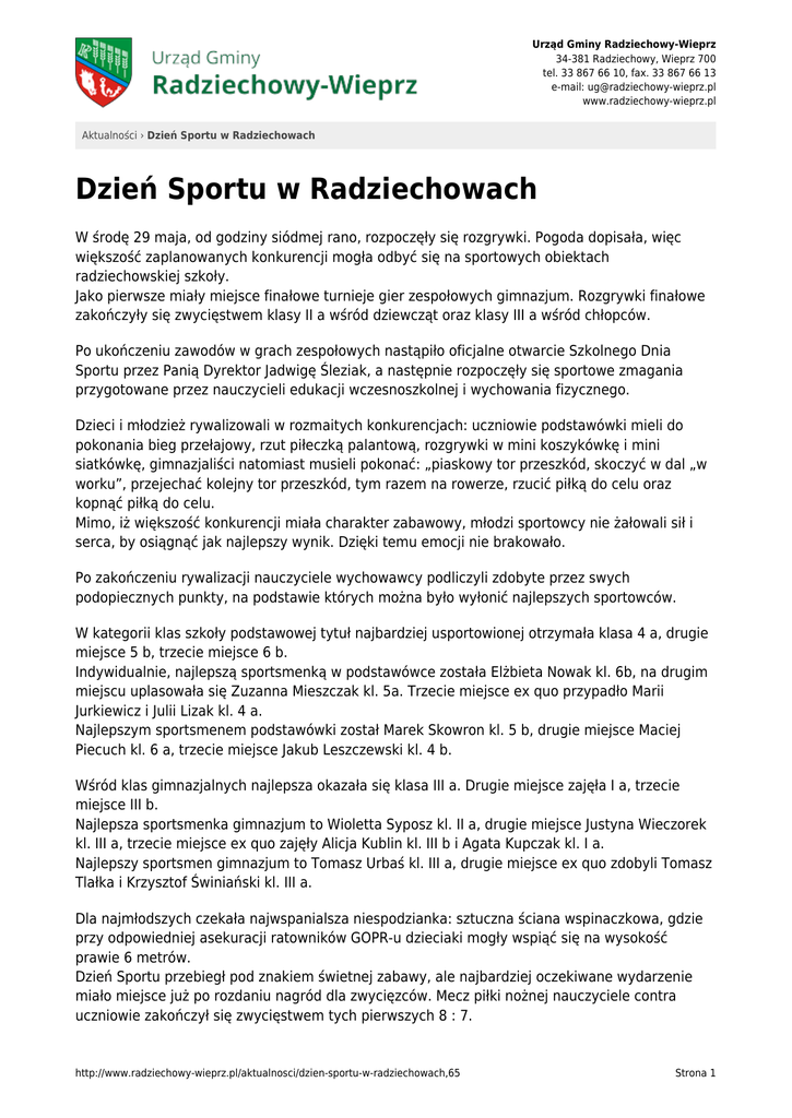 Urząd Gminy Radziechowy-Wieprz 34-381 Radziechowy, Wieprz 700 tel. 33 867 66 10, fax. 33 867 66 13 e-mail: [email protected] www.radziechowy-wieprz.pl Aktualności › Dzień Sportu w Radziechowach Dzień Sportu w Radziechowach W środę 29 maja, od godziny siódmej rano, rozpoczęły się rozgrywki. Pogoda dopisała, więc większość zaplanowanych konkurencji mogła odbyć się na sportowych obiektach radziechowskiej szkoły. Jako pierwsze miały miejsce finałowe turnieje gier zespołowych gimnazjum. Rozgrywki finałowe zakończyły się zwycięstwem klasy II a wśród dziewcząt oraz klasy III a wśród chłopców. Po ukończeniu zawodów w grach zespołowych nastąpiło oficjalne otwarcie Szkolnego Dnia Sportu przez Panią Dyrektor Jadwigę Śleziak, a następnie rozpoczęły się sportowe zmagania przygotowane przez nauczycieli edukacji wczesnoszkolnej i wychowania fizycznego. Dzieci i młodzież rywalizowali w rozmaitych konkurencjach: uczniowie podstawówki mieli do pokonania bieg przełajowy, rzut piłeczką palantową, rozgrywki w mini koszykówkę i mini siatkówkę, gimnazjaliści natomiast musieli pokonać: „piaskowy tor przeszkód, skoczyć w dal „w worku”, przejechać kolejny tor przeszkód, tym razem na rowerze, rzucić piłką do celu oraz kopnąć piłką do celu. Mimo, iż większość konkurencji miała charakter zabawowy, młodzi sportowcy nie żałowali sił i serca, by osiągnąć jak najlepszy wynik. Dzięki temu emocji nie brakowało. Po zakończeniu rywalizacji nauczyciele wychowawcy podliczyli zdobyte przez swych podopiecznych punkty, na podstawie których można było wyłonić najlepszych sportowców. W kategorii klas szkoły podstawowej tytuł najbardziej usportowionej otrzymała klasa 4 a, drugie miejsce 5 b, trzecie miejsce 6 b. Indywidualnie, najlepszą sportsmenką w podstawówce została Elżbieta Nowak kl. 6b, na drugim miejscu uplasowała się Zuzanna Mieszczak kl. 5a. Trzecie miejsce ex quo przypadło Marii Jurkiewicz i Julii Lizak kl. 4 a. Najlepszym sportsmenem podstawówki został Marek Skowron kl. 5 b, drugie miejsce Maciej Piecuch kl. 6 a, trzecie miejsce Jakub Leszczewski kl. 4 b. Wśród klas gimnazjalnych najlepsza okazała się klasa III a. Drugie miejsce zajęła I a, trzecie miejsce III b. Najlepsza sportsmenka gimnazjum to Wioletta Syposz kl. II a, drugie miejsce Justyna Wieczorek kl. III a, trzecie miejsce ex quo zajęły Alicja Kublin kl. III b i Agata Kupczak kl. I a. Najlepszy sportsmen gimnazjum to Tomasz Urbaś kl. III a, drugie miejsce ex quo zdobyli Tomasz Tlałka i Krzysztof Świniański kl. III a. Dla najmłodszych czekała najwspanialsza niespodzianka: sztuczna ściana wspinaczkowa, gdzie przy odpowiedniej asekuracji ratowników GOPR-u dzieciaki mogły wspiąć się na wysokość prawie 6 metrów. Dzień Sportu przebiegł pod znakiem świetnej zabawy, ale najbardziej oczekiwane wydarzenie miało miejsce już po rozdaniu nagród dla zwycięzców. Mecz piłki nożnej nauczyciele contra uczniowie zakończył się zwycięstwem tych pierwszych 8 : 7. http://www.radziechowy-wieprz.pl/aktualnosci/dzien-sportu-w-radziechowach,65 Strona 1 Urząd Gminy Radziechowy-Wieprz 34-381 Radziechowy, Wieprz 700 tel. 33 867 66 10, fax. 33 867 66 13 e-mail: [email protected] www.radziechowy-wieprz.pl Aktualności › Dzień Sportu w Radziechowach Dzięki wsparciu finansowemu i uprzejmości firmy TAURON (www.tauron-dystrybucja.pl) Święto Sportu okazało się wspaniałym i ważnym wydarzeniem w życiu naszej szkoły. Pozostaje mieć nadzieję, że równie fantastycznie uczniowie będą się bawić za rok. http://www.radziechowy-wieprz.pl/aktualnosci/dzien-sportu-w-radziechowach,65 Strona 2