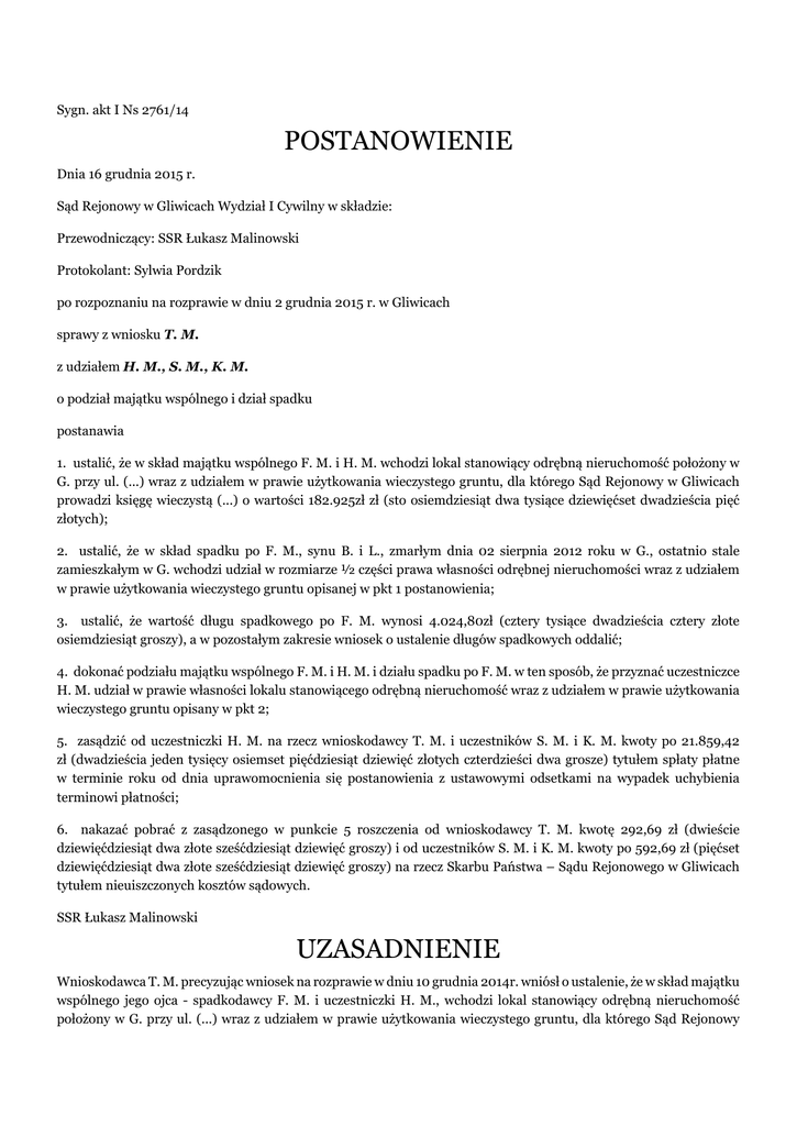 Sygn. akt I Ns 2761/14 POSTANOWIENIE Dnia 16 grudnia 2015 r. Sąd Rejonowy w Gliwicach Wydział I Cywilny w składzie: Przewodniczący: SSR Łukasz Malinowski Protokolant: Sylwia Pordzik po rozpoznaniu na rozprawie w dniu 2 grudnia 2015 r. w Gliwicach sprawy z wniosku T. M. z udziałem H. M., S. M., K. M. o podział majątku wspólnego i dział spadku postanawia 1. ustalić, że w skład majątku wspólnego F. M. i H. M. wchodzi lokal stanowiący odrębną nieruchomość położony w G. przy ul. (...) wraz z udziałem w prawie użytkowania wieczystego gruntu, dla którego Sąd Rejonowy w Gliwicach prowadzi księgę wieczystą (...) o wartości 182.925zł zł (sto osiemdziesiąt dwa tysiące dziewięćset dwadzieścia pięć złotych); 2. ustalić, że w skład spadku po F. M., synu B. i L., zmarłym dnia 02 sierpnia 2012 roku w G., ostatnio stale zamieszkałym w G. wchodzi udział w rozmiarze ½ części prawa własności odrębnej nieruchomości wraz z udziałem w prawie użytkowania wieczystego gruntu opisanej w pkt 1 postanowienia; 3. ustalić, że wartość długu spadkowego po F. M. wynosi 4.024,80zł (cztery tysiące dwadzieścia cztery złote osiemdziesiąt groszy), a w pozostałym zakresie wniosek o ustalenie długów spadkowych oddalić; 4. dokonać podziału majątku wspólnego F. M. i H. M. i działu spadku po F. M. w ten sposób, że przyznać uczestniczce H. M. udział w prawie własności lokalu stanowiącego odrębną nieruchomość wraz z udziałem w prawie użytkowania wieczystego gruntu opisany w pkt 2; 5. zasądzić od uczestniczki H. M. na rzecz wnioskodawcy T. M. i uczestników S. M. i K. M. kwoty po 21.859,42 zł (dwadzieścia jeden tysięcy osiemset pięćdziesiąt dziewięć złotych czterdzieści dwa grosze) tytułem spłaty płatne w terminie roku od dnia uprawomocnienia się postanowienia z ustawowymi odsetkami na wypadek uchybienia terminowi płatności; 6. nakazać pobrać z zasądzonego w punkcie 5 roszczenia od wnioskodawcy T. M. kwotę 292,69 zł (dwieście dziewięćdziesiąt dwa złote sześćdziesiąt dziewięć groszy) i od uczestników S. M. i K. M. kwoty po 592,69 zł (pięćset dziewięćdziesiąt dwa złote sześćdziesiąt dziewięć groszy) na rzecz Skarbu Państwa – Sądu Rejonowego w Gliwicach tytułem nieuiszczonych kosztów sądowych. SSR Łukasz Malinowski UZASADNIENIE Wnioskodawca T. M. precyzując wniosek na rozprawie w dniu 10 grudnia 2014r. wniósł o ustalenie, że w skład majątku wspólnego jego ojca - spadkodawcy F. M. i uczestniczki H. M., wchodzi lokal stanowiący odrębną nieruchomość położony w G. przy ul. (...) wraz z udziałem w prawie użytkowania wieczystego gruntu, dla którego Sąd Rejonowy w Gliwicach prowadzi księgę wieczystą (...). Nadto wniósł o ustalenie, że w skład spadku po F. M. wchodzi udział w rozmiarze ½ części prawa własności wymienionej nieruchomości lokalowej. Wnioskodawca zażądał dokonania podziału majątku wspólnego i działu spadku po F. M. w ten sposób, że uczestniczka H. M. otrzyma całą nieruchomość z obowiązkiem spłaty wnioskodawcy i pozostałych dzieci spadkodawcy – uczestników S. M. i K. M.. Wnioskodawca argumentował, że taki sposób działu spadku po ojcu uzasadnia fakt, że obecnie w nieruchomości zamieszkuje uczestniczka H. M., a potrzeby mieszkaniowe wnioskodawcy i pozostałych uczestników są zaspokojone. Wartość całej nieruchomości zdaniem wnioskodawcy wynosi 200.000 zł. dlatego wysokość spłaty wynosi po 25000 zł. Uczestnicy S. M. i K. M. przychylili się do wniosku. Uczestniczka H. M. zgodziła się na dokonanie podziału majątku wspólnego i działu spadku po jej zmarłym mężu F. M. w sposób wskazany we wniosku. Zdaniem uczestniczki wartość jedynego składnika majątku wspólnego - nieruchomości opisanej we wniosku to 140.000 zł. gdyż wymaga ona remontu. Zgodziła się na ratalną spłatę wnioskodawcy, podnosząc że spłata pozostałym uczestnikom nie należy się. Zarzuciła, że uczestnicy po wyprowadzeniu się z domu rodzinnego nie utrzymywali kontaktów ani z nią, ani z ojcem, a ten nie mógł liczyć na ich pomoc i wsparcie. Okazali zatem rażącą niewdzięczność spadkodawcy. Dlatego zgodnie z zasadami współżycia społecznego uczestniczka winna zostać zwolniona z obowiązku spłaty na ich rzecz. Wskazała nadto, że nie posiada majątku, zatem i z tej przyczyny nie może spłacić uczestników, a wnioskodawcę jedynie w ratach. Na rozprawie w dniu 7 października 2015r. a następnie w piśmie z dnia 14 października 2015r. uczestniczka wniosła o rozliczenie jako długu spadkowego – kosztów pogrzebu spadkodawcy, stypy oraz pomnika w łącznej kwocie 9524,80 zł., przyznając jednocześnie, że otrzymała zasiłek pogrzebowy w kwocie 4000 zł. Wnioskodawca i pozostali uczestnicy zgodzili się na zaliczenie do długów spadkowych kosztów pogrzebu spadkodawcy za wyjątkiem: kosztów wykonania pomnika /k.125/ i stypy /k.150/. Podnieśli nadto, że uczestniczka otrzymała środki z (...) z tytułu śmierci spadkodawcy oraz zasiłek pogrzebowy. Sąd ustalił następujący stan faktyczny: Spadkodawca F. M. ze związku z T. G. posiadał troje dzieci – wnioskodawcę T. M. urodzonego w (...)r. i uczestników S. M. urodzonego w (...)r. i K. M. zd. (...) urodzoną w (...)r. T. G. zmarła 1972r. Spadkodawca ponownie zawarł związek małżeński z uczestniczką H. M. w 1974r., która miała już syna z poprzedniego związku. okoliczności bezsporne. Stosunki między dziećmi spadkodawcy a uczestniczką H. M. nie układały się dobrze. Pierwszy z domu rodzinnego wyprowadził się S. M. w latach 1978-1979, który ożenił się i zamieszkał na terenie Niemiec. Ze względu na złe relacje, szczególnie z uczestniczką, dom rodzinny następnie opuściła K. M. będąc w zaawansowanej ciąży. Zamieszkała także na terenie Niemiec. Wnioskodawca wyprowadził się z domu rodzinnego w 1990r. i po czym przez dwa lata nie utrzymywał k