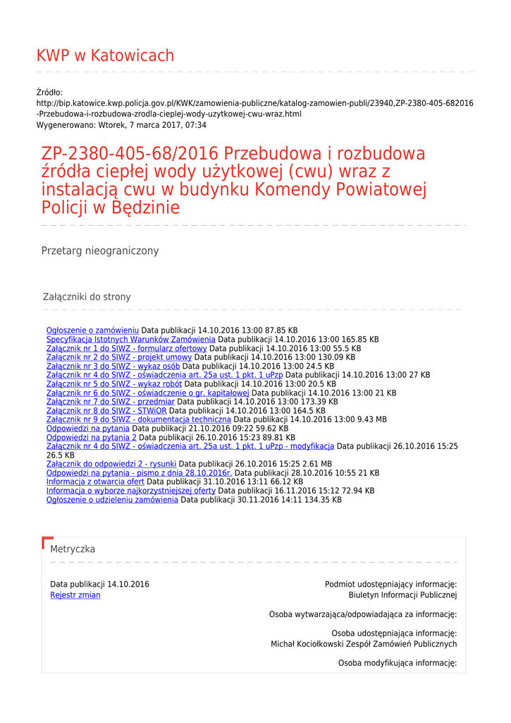 KWP w Katowicach Źródło: http://bip.katowice.kwp.policja.gov.pl/KWK/zamowienia-publiczne/katalog-zamowien-publi/23940,ZP-2380-405-682016 -Przebudowa-i-rozbudowa-zrodla-cieplej-wody-uzytkowej-cwu-wraz.html Wygenerowano: Wtorek, 7 marca 2017, 07:34 ZP-2380-405-68/2016 Przebudowa i rozbudowa źródła ciepłej wody użytkowej (cwu) wraz z instalacją cwu w budynku Komendy Powiatowej Policji w Będzinie Przetarg nieograniczony Załączniki do strony Ogłoszenie o zamówieniu Data publikacji 14.10.2016 13:00 87.85 KB Specyfikacja Istotnych Warunków Zamówienia Data publikacji 14.10.2016 13:00 165.85 KB Załącznik nr 1 do SIWZ - formularz ofertowy Data publikacji 14.10.2016 13:00 55.5 KB Załącznik nr 2 do SIWZ - projekt umowy Data publikacji 14.10.2016 13:00 130.09 KB Załącznik nr 3 do SIWZ - wykaz osób Data publikacji 14.10.2016 13:00 24.5 KB Załącznik nr 4 do SIWZ - oświadczenia art. 25a ust. 1 pkt. 1 uPzp Data publikacji 14.10.2016 13:00 27 KB Załącznik nr 5 do SIWZ - wykaz robót Data publikacji 14.10.2016 13:00 20.5 KB Załącznik nr 6 do SIWZ - oświadczenie o gr. kapitałowej Data publikacji 14.10.2016 13:00 21 KB Załącznik nr 7 do SIWZ - przedmiar Data publikacji 14.10.2016 13:00 173.39 KB Załącznik nr 8 do SIWZ - STWiOR Data publikacji 14.10.2016 13:00 164.5 KB Załącznik nr 9 do SIWZ - dokumentacja techniczna Data publikacji 14.10.2016 13:00 9.43 MB Odpowiedzi na pytania Data publikacji 21.10.2016 09:22 59.62 KB Odpowiedzi na pytania 2 Data publikacji 26.10.2016 15:23 89.81 KB Załącznik nr 4 do SIWZ - oświadczenia art. 25a ust. 1 pkt. 1 uPzp - modyfikacja Data publikacji 26.10.2016 15:25 26.5 KB Załącznik do odpowiedzi 2 - rysunki Data publikacji 26.10.2016 15:25 2.61 MB Odpowiedzi na pytania - pismo z dnia 28.10.2016r. Data publikacji 28.10.2016 10:55 21 KB Informacja z otwarcia ofert Data publikacji 31.10.2016 13:11 66.12 KB Informacja o wyborze najkorzystniejszej oferty Data publikacji 16.11.2016 15:12 72.94 KB Ogłoszenie o udzieleniu zamówienia Data publikacji 30.11.2016 14:11 134.35 KB Metryczka Data publikacji 14.10.2016 Rejestr zmian Podmiot udostępniający informację: Biuletyn Informacji Publicznej Osoba wytwarzająca/odpowiadająca za informację: Osoba udostępniająca informację: Michał Kociołkowski Zespół Zamówień Publicznych Osoba modyfikująca informację: