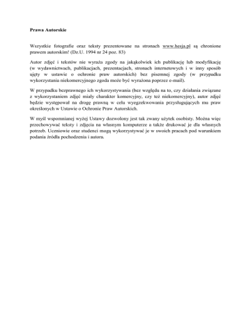 Prawa Autorskie Wszystkie fotografie oraz teksty prezentowane na stronach www.hesja.pl są chronione prawem autorskim! (Dz.U. 1994 nr 24 poz. 83) Autor zdjęć i tekstów nie wyraża zgody na jakąkolwiek ich publikację lub modyfikację (w wydawnictwach, publikacjach, prezentacjach, stronach internetowych i w inny sposób ujęty w ustawie o ochronie praw autorskich) bez pisemnej zgody (w przypadku wykorzystania niekomercyjnego zgoda może być wyrażona poprzez e-mail). W przypadku bezprawnego ich wykorzystywania (bez względu na to, czy działania związane z wykorzystaniem zdjęć miały charakter komercyjny, czy też niekomercyjny), autor zdjęć będzie występował na drogę prawną w celu wyegzekwowania przysługujących mu praw określonych w Ustawie o Ochronie Praw Autorskich. W myśl wspomnianej wyżej Ustawy dozwolony jest tak zwany użytek osobisty. Można więc przechowywać teksty i zdjęcia na własnym komputerze a także drukować je dla własnych potrzeb. Uczniowie oraz studenci mogą wykorzystywać je w swoich pracach pod warunkiem podania źródła pochodzenia i autora.