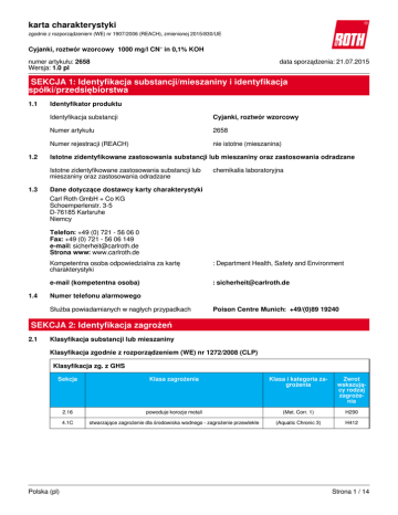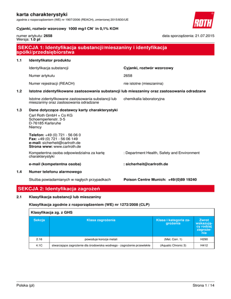 karta charakterystyki zgodnie z rozporządzeniem (WE) nr 1907/2006 (REACH), zmienionej 2015/830/UE Cyjanki, roztwór wzorcowy 1000 mg/l CN⁻ in 0,1% KOH numer artykułu: 2658 Wersja: 1.0 pl data sporządzenia: 21.07.2015 SEKCJA 1: Identyfikacja substancji/mieszaniny i identyfikacja spółki/przedsiębiorstwa 1.1 1.2 Identyfikator produktu Identyfikacja substancji Cyjanki, roztwór wzorcowy Numer artykułu 2658 Numer rejestracji (REACH) nie istotne (mieszanina) Istotne zidentyfikowane zastosowania substancji lub mieszaniny oraz zastosowania odradzane Istotne zidentyfikowane zastosowania substancji lub mieszaniny oraz zastosowania odradzane 1.3 chemikalia laboratoryjna Dane dotyczące dostawcy karty charakterystyki Carl Roth GmbH + Co KG Schoemperlenstr. 3-5 D-76185 Karlsruhe Niemcy Telefon: +49 (0) 721 - 56 06 0 Fax: +49 (0) 721 - 56 06 149 e-mail: [email protected] Strona www: www.carlroth.de 1.4 Kompetentna osoba odpowiedzialna za kartę charakterystyki : Department Health, Safety and Environment e-mail (kompetentna osoba) : [email protected] Numer telefonu alarmowego Służba powiadamianych w nagłych przypadkach Poison Centre Munich: +49/(0)89 19240 SEKCJA 2: Identyfikacja zagrożeń 2.1 Klasyfikacja substancji lub mieszaniny Klasyfikacja zgodnie z rozporządzeniem (WE) nr 1272/2008 (CLP) Klasyfikacja zg. z GHS Sekcja Klasa zagrożenia Klasa i kategoria zagrożenia Zwrot wskazujący rodzaj zagrożenia 2.16 powoduje korozje metali (Met. Corr. 1) H290 4.1C stwarzające zagrożenie dla środowiska wodnego - zagrożenie przewlekłe (Aquatic Chronic 3) H412 Polska (pl) Strona 1 / 14 karta charakterystyki zgodnie z rozporządzeniem (WE) nr 1907/2006 (REACH), zmienionej 2015/830/UE Cyjanki, roztwór wzorcowy 1000 mg/l CN⁻ in 0,1% KOH numer artykułu: 2658 Uwagi Pełny tekst zwrotów H: zob. SEKCJA 16. Dodatkowa informacja dotycząca zagrożenia 2.2 Kod Dodatkowa informacja dotycząca zagrożenia EUH032 w kontakcie z kwasami uwalnia bardzo toksyczne gazy Elementy oznakowania Oznakowania zgodnie z rozporządzeniem (WE) nr 1272/2008 (CLP) Hasło ostrzegawcze Uwaga Piktogramy Zwroty wskazujące rodzaj zagrożenia H290 H412 Może powodować korozję metali. Działa szkodliwie na organizmy wodne, powodując długotrwałe skutki. Zwroty wskazujące środki ostrożności Zwroty wskazujące środki ostrożności - zapobieganie P234 P273 Przechowywać wyłącznie w oryginalnym pojemniku. Unikać uwolnienia do środowiska. Oznakowanie opakowań, których zawartość nie przekracza 125 ml Hasło ostrzegawcze: Symbol(-e) 2.3 H412 Działa szkodliwie na organizmy wodne, powodując długotrwałe skutki. EUH032 W kontakcie z kwasami uwalnia bardzo toksyczne gazy. Inne zagrożenia Nie ma dodatkowych informacji. Polska (pl) Strona 2 / 14 karta charakterystyki zgodnie z rozporządzeniem (WE) nr 1907/2006 (REACH), zmienionej 2015/830/UE Cyjanki, roztwór wzorcowy 1000 mg/l CN⁻ in 0,1% KOH numer artykułu: 2658 SEKCJA 3: Skład/informacja o składnikach 3.2 Mieszaniny Opis mieszanki Skład/informacja o składnikach. Nazwa substancji Identyfikator wt% Klasyfikacja zg. z 1272/2008/WE sole cyjanowodoru Nr. CAS 151-50-8 0,25 Acute Tox. 2 / H300 Acute Tox. 1 / H310 Acute Tox. 2 / H330 Aquatic Acute 1 / H400 Aquatic Chronic 1 / H410 Nr. WE 205-792-3 Piktogramy Nr. indeksowy 006-007-00-5 Nr. rej. REACH 01-2119486407-29xxxx Uwagi Pełny tekst skrótów: zob. SEKCJA 16. Czynnik M: Toksyczność dla środowiska wodnego (ostra): 10. SEKCJA 4: Środki pierwszej pomocy 4.1 Opis środków pierwszej pomocy Uwagi ogólne Zdjąć zanieczyszczoną odzież. Po narażeniu przez drogi oddechowe Zapewnić dostęp do świeżego powietrza. Zasięgnąć porady lekarza w przypadku pojawienia się jakichkolwiek wątpliwości, lub jeżeli objawy nie ustępują. Po kontakcie ze skórą Spłukać skórę pod strumieniem wody/prysznicem. Należy udać się do dermatologa. Po kontakcie z oczami Ostrożnie płukać wodą przez kilka minut. Zasięgnąć porady lekarza w przypadku pojawienia się jakichkolwiek wątpliwości, lub jeżeli objawy nie ustępują. Po narażeniu przez przewód pokarmowy Wypłukać usta. W przypadku złego samopoczucia skontaktować się z lekarzem. 4.2 Najważniejsze ostre i opóźnione objawy oraz skutki narażenia Objawy i skutki dotychczas nie są znane Polska (pl) Strona 3 / 14 karta charakterystyki zgodnie z rozporządzeniem (WE) nr 1907/2006 (REACH), zmienionej 2015/830/UE Cyjanki, roztwór wzorcowy 1000 mg/l CN⁻ in 0,1% KOH numer artykułu: 2658 4.3 Wskazania dotyczące wszelkiej natychmiastowej pomocy lekarskiej i szczególnego postępowania z poszkodowanym żadne SEKCJA 5: Postępowanie w przypadku pożaru 5.1 Środki gaśnicze Odpowiednie środki gaśnicze Środki gaśnicze należy dostosować do otoczenia rozpylona woda, piana, suchy proszek gaśniczy, dwutlenek węgla (CO2) Niewłaściwe środki gaśnicze silny strumień wody 5.2 Szczególne zagrożenia związane z substancją lub mieszaniną Niepalny. Produkty spalania stwarzające zagrożenie Podczas pożaru mogą powstawać: Podczas spalania mogą się tworzyć toksyczne spaliny zawierające tlenek węgla. 5.3 Informacje dla straży pożarnej Nie pozwalać na odpływ wody gaśniczej do kanalizacji i cieków wodnych. Gasić pożar z rozsądnej odległości z zachowaniem zwykłych środków ostrożności. Nosić autonomiczny aparat oddechowy. SEKCJA 6: Postępowanie w przypadku niezamierzonego uwolnienia do środowiska 6.1 Indywidualne środki ostrożności, sprzęt ochronny i procedury w sytuacjach awaryjnych Dla osób nienależących do personelu udzielającego pomocy Noszenie odpowiedniego sprzętu ochronnego (w tym osobiste wyposażenie ochronne, o których mowa w sekcji 8 karty charakterystyki), aby zapobiec skażeniu skóry, oczu lub odzieży. 6.2 Środki ostrożności w zakresie ochrony środowiska Zapobiegać przedostaniu się do kanalizacji, wód powierzchniowych i gruntowych. Zachować zanieczyszczoną wodę przeznaczonej do mycia i ją usu
