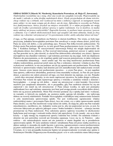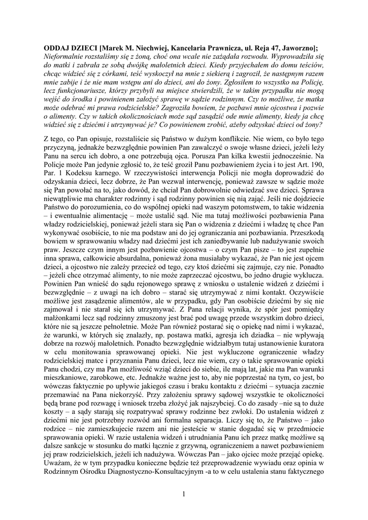 ODDAJ DZIECI [Marek M. Niechwiej, Kancelaria Prawnicza, ul. Reja 47, Jaworzno]; Nieformalnie rozstaliśmy się z żoną, choć ona wcale nie zażądała rozwodu. Wyprowadziła się do matki i zabrała ze sobą dwójkę małoletnich dzieci. Kiedy przyjechałem do domu teściów, chcąc widzieć się z córkami, teść wyskoczył na mnie z siekierą i zagroził, że następnym razem mnie zabije i że nie mam wstępu ani do dzieci, ani do żony. Zgłosiłem to wszystko na Policję, lecz funkcjonariusze, którzy przybyli na miejsce stwierdzili, że w takim przypadku nie mogą wejść do środka i powinienem założyć sprawę w sądzie rodzinnym. Czy to możliwe, że matka może odebrać mi prawa rodzicielskie? Zagroziła bowiem, że pozbawi mnie ojcostwa i pozwie o alimenty. Czy w takich okolicznościach może sąd zasądzić ode mnie alimenty, kiedy ja chcę widzieć się z dziećmi i utrzymywać je? Co powinienem zrobić, ażeby odzyskać dzieci od żony? Z tego, co Pan opisuje, rozstaliście się Państwo w dużym konflikcie. Nie wiem, co było tego przyczyną, jednakże bezwzględnie powinien Pan zawalczyć o swoje własne dzieci, jeżeli leży Panu na sercu ich dobro, a one potrzebują ojca. Porusza Pan kilka kwestii jednocześnie. Na Policje może Pan jedynie zgłosić to, że teść groził Panu pozbawieniem życia i to jest Art. 190, Par. 1 Kodeksu karnego. W rzeczywistości interwencja Policji nie mogła doprowadzić do odzyskania dzieci, lecz dobrze, że Pan wezwał interwencję, ponieważ zawsze w sądzie może się Pan powołać na to, jako dowód, że chciał Pan dobrowolnie odwiedzać swe dzieci. Sprawa niewątpliwie ma charakter rodzinny i sąd rodzinny powinien się nią zająć. Jeśli nie dojdziecie Państwo do porozumienia, co do wspólnej opieki nad waszym potomstwem, to takie widzenia – i ewentualnie alimentację – może ustalić sąd. Nie ma tutaj możliwości pozbawienia Pana władzy rodzicielskiej, ponieważ jeżeli stara się Pan o widzenia z dziećmi i władzę tę chce Pan wykonywać osobiście, to nie ma podstaw ani do jej ograniczania ani pozbawiania. Przeszkodą bowiem w sprawowaniu władzy nad dziećmi jest ich zaniedbywanie lub nadużywanie swoich praw. Jeszcze czym innym jest pozbawienie ojcostwa – o czym Pan pisze – to jest zupełnie inna sprawa, całkowicie absurdalna, ponieważ żona musiałaby wykazać, że Pan nie jest ojcem dzieci, a ojcostwo nie zależy przecież od tego, czy ktoś dziećmi się zajmuje, czy nie. Ponadto – jeżeli chce otrzymać alimenty, to nie może zaprzeczać ojcostwu, bo jedno drugie wyklucza. Powinien Pan wnieść do sądu rejonowego sprawę z wniosku o ustalenie widzeń z dziećmi i bezwzględnie – z uwagi na ich dobro – starać się utrzymywać z nimi kontakt. Oczywiście możliwe jest zasądzenie alimentów, ale w przypadku, gdy Pan osobiście dziećmi by się nie zajmował i nie starał się ich utrzymywać. Z Pana relacji wynika, że spór jest pomiędzy małżonkami lecz sąd rodzinny zmuszony jest brać pod uwagę przede wszystkim dobro dzieci, które nie są jeszcze pełnoletnie. Może Pan również postarać się o opiekę nad nimi i wykazać, że warunki, w których się znalazły, np. postawa matki, agresja ich dziadka – nie wpływają dobrze na rozwój małoletnich. Ponadto bezwzględnie widziałbym tutaj ustanowienie kuratora w celu monitowania sprawowanej opieki. Nie jest wykluczone ograniczenie władzy rodzicielskiej matce i przyznania Panu dzieci, lecz nie wiem, czy o takie sprawowanie opieki Panu chodzi, czy ma Pan możliwość wziąć dzieci do siebie, ile mają lat, jakie ma Pan warunki mieszkaniowe, zarobkowe, etc. Jednakże ważne jest to, aby nie poprzestać na tym, co jest, bo wówczas faktycznie po upływie jakiegoś czasu i braku kontaktu z dziećmi – sytuacja zacznie przemawiać na Pana niekorzyść. Przy założeniu sprawy sądowej wszystkie te okoliczności będą brane pod rozwagę i wniosek trzeba złożyć jak najszybciej. Co do zasady –nie są to duże koszty – a sądy starają się rozpatrywać sprawy rodzinne bez zwłoki. Do ustalenia widzeń z dziećmi nie jest potrzebny rozwód ani formalna separacja. Liczy się to, że Państwo – jako rodzice – nie zamieszkujecie razem ani nie jesteście w stanie dogadać się w przedmiocie sprawowania opieki. W razie ustalenia widzeń i utrudniania Panu ich przez matkę możliwe są dalsze sankcje w stosunku do matki łącznie z grzywną, ograniczeniem a nawet pozbawieniem jej praw rodzicielskich, jeżeli ich nadużywa. Wówczas Pan – jako ojciec może przejąć opiekę. Uważam, że w tym przypadku konieczne będzie też przeprowadzenie wywiadu oraz opinia w Rodzinnym Ośrodku Diagnostyczno-Konsultacyjnym -a to w celu ustalenia stanu faktycznego 1