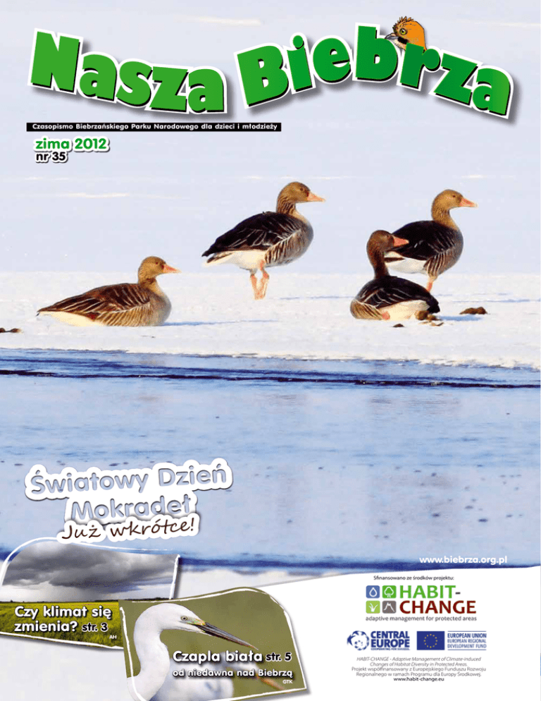 Czasopismo Biebrzańskiego Parku Narodowego dla dzieci i młodzieży zima 2012 nr 35 Już wkrótce! www.biebrza.org.pl Sfinansowano ze środków projektu: Czy klimat się zmienia? str. 3 AH Czapla biała str. 5 od niedawna nad Biebrzą GTK HABIT-CHANGE - Adaptive Management of Climate-induced Changes of Habitat Diversity in Protected Areas. Projekt współfinansowany z Europejskiego Funduszu Rozwoju Regionalnego w ramach Programu dla Europy Środkowej. www.habit-change.eu 1 Co słychać nad Biebrzą? Dzień Mokradeł jest obchodzony na świecie 2 lutego, na pamiątkę podpisania Konwencji RAMSAR w 1971 r., w mieście Ramsar, nad Morzem Kaspijskim w Iranie. Państwa, które ją przyjęły są zobligowane do ochrony obszarów wodno-błotnych, ważnych dla ptactwa wodnego. Na świcie jest 1968 takich obszarów, położonych w 160 krajach. W Polsce oprócz Biebrzańskiego Parku Narodowego należą do nich: rezerwat przyrody Jezioro Łuknajno, Park Narodowy Ujście Warty, rezerwat przyrody Jezioro Karaś, rezerwat przyrody Jezioro Siedmiu Wysp, rezerwat przyrody Świdwie, Słowiński Park Narodowy, Stawy Milickie w Parku Krajobrazowym Dolina Baryczy, Narwiański Park Narodowy, Poleski Park Narodowy, Wigierski Park Narodowy, rezerwat przyrody Jezioro Drużno, subalpejskie torfowiska w Karkonoskim Parku Narodowym. czy klim 2 lutego 2012 N a podstawie wieloletnich obserwacji temperatury powietrza oraz innych zjawisk meteorologicznych naukowcy stwierdzili, że klimat Ziemi się zmienia. Przyczyn zmian klimatu upatruje się zarówno w procesach naturalnych (np. zmiany magnetyzmu ziemi), jak i w działalności człowieka. Dostrzeżono, że największy wzrost temperatury powietrza występuje od momentu, gdy wynaleziono maszynę parową i zaczęto emitować do atmosfery duże ilości gazów cieplarnianych – pary wodnej i dwutlenku węgla. Zbliża się Światowy Dzień Mokradeł. W tym roku obchodzić go będziemy pod hasłem „Turystyka na mokradłach – wspaniałe przeżycie”. To okazja do zastanowienia się jaka powinna być u nas turystyka przyjazna biebrzańskiej przyrodzie. Wszystkie szkoły leżące w pobliżu Parku, zachęcamy do organizacji tego święta. Dział Edukacji służy pomocą, czekamy na kontakt od Państwa! Informacje i materiały na stronie www.biebrza.org.pl Mówiąc o klimacie mamy zwykle na myśli długie, kilkudziesięcio- lub kilkusetletnie okresy. W ciągu tak długich okresów zdarzają się lata cieplejsze i zimniejsze. Bywają lata, kiedy deszcze lub burze występują często bądź rzadko, oraz lata, gdy zimą na naszych podwórkach jest dużo śniegu. Bywają również lata, gdy zasiadając do wigilijnego stołu widzimy za oknem deszcz i pluchę i ani milimetra białego puchu. Deszcze, burze, śniegi, słoty i upały to jednak – w skali klimatu – krótkotrwałe zjawiska meteorologiczne. Aby mówić o klimacie danego obszaru (np. o klimacie Polski), należy go rozpatrywać jako wszystkie zjawiska meteoro- logiczne, jakie zachodzą w wieloleciu. Z całą pewnością, mówiąc o zmianie klimatu nie możemy mieć na myśli zmiany pogody. Jeżeli jednego dnia jest ciepło i świeci piękne słońce, a następnego dnia nie wychodzimy z domu bez parasola i kurtki, nie oznacza to, że zmienił się klimat. Zmieniła się jedynie pogoda. Co więcej, nawet gdyby okazało się, że tegoroczna zima będzie cieplejsza od poprzedniej, nie oznaczałoby to zmiany klimatu. Analizując zmiany klimatu rozpatruje się wieloletnie ciągi liczb opisujące sumę opadów atmosferycznych w poszczególnych latach (np. ile spa- Trudne pytania rawdiezniiac? Jak sp at się zm 2012 – Rok Dzikich Łąk w Biebrzańskim Parku Narodowym Relację z ubiegłorocznego świętowania Dnia Mokradeł w Goniądzu i Dolistowie przesłaliśmy do szwajcarskiego biura Konwencji. Warto zajrzeć na ich stronę www.ramsar.org (przekierowanie znajdziecie na stronie Parku). Znaleziono zwierzę - gdzie dzwonić? Podczas wędrówek biebrzańskimi ścieżkami może nam się przytrafić znalezienie rannego ptaka lub innego zwierzęcia. Co w takiej sytuacji zrobić? Najlepiej poinformować Komendanta Straży Parku nr tel. 606 148 312. Najwięcej takich telefonów dotyczy u nas bocianów. Służby Parku starają się pomagać w takich sytuacjach. Uwaga: rannych zwierząt nie dotykamy! AH iedzadieapćtują Wartieorzętw a na bieżąco AS Czym jest projekt HABIT-CHANGE? Naukowcy prognozują, że zmiany klimatu w naszym regionie Europy będą przejawiać się częstszym występowaniem ekstremalnych zjawisk pogodowych. Przewiduje się, że obok długotrwałych susz mogą w przyszłości występować dużo częstsze niż obecnie, intensywne i gwałtowne opady deszczu. Bardzo mroźne zimy będą przeplatane okresami gorącego lata. Najprawdopodobniej będziemy również 2 AH świadkami nietypowych w porównaniu z dotychczasowymi, suchych wiosen, mokrych lat, długich i suchych jesieni, krótkich i bardzo mroźnych zim… W takich warunkach, zarówno przyroda jak i ludzie będą coraz częściej przechodzić sprawdzian z elastyczności i dostosowania się do nowych warunków klimatycznych. Niewykluczone, że zmieniać się będą nasze mokradła – ich uwilgotnienie, szata roślin- PT na i fauna. Aby lepiej poznać powiązania zmian klimatu z użytkowaniem rolniczym i dynamiką siedliskową, Biebrzański Park Narodowy oraz 16 innych instytucji z 9 krajów Europy uczestniczy w projekcie HABIT-CHANGE. Głównym celem projektu jest opracowanie oraz wdrożenie skutecznych metod zarządzania i ochrony przyrody, dostosowanych do potencjalnych zmian klimatu. Mamy nadzieję, że lektura tego numeru „Naszej Biebrzy” przybliży Wam istotę zmian klimatu oraz powiązań pomiędzy warunkami klimatycznymi a światem przyrody Doliny Biebrzy. Żołna /GTK Batalion samiec/ PT Niektóre zw znych. runków klimatyc się do nowych wa iejszych dn ukiwaniu dogo Migrując w posz jawiają się tóre gatunki po warunków, niek ożemy to ch 