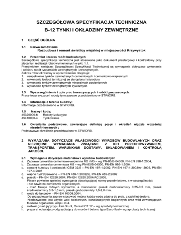 SZCZEGÓŁOWA SPECYFIKACJA TECHNICZNA B-12 TYNKI I OKŁADZINY ZEWNĘTRZNE 1 1.1 CZĘŚĆ OGÓLNA Nazwa zamówienia Rozbudowa i remont świetlicy wiejskiej w miejscowości Krzywystok 1.2 Przedmiot i zakres robót budowlanych Szczegółowa specyfikacja techniczna jest stosowana jako dokument przetargowy i kontraktowy przy zlecaniu i realizacji robót wymienionych w pkt. 1.1. Przedmiotem niniejszej Szczegółowej Specyfikacji Technicznej są wymagania dotyczące wykonania i odbioru robót tynkarskich wewnętrznych i zewnętrznych. Zakres robót określony w opracowaniem obejmuje: 1. uzupełnienie tynków zewnętrznych cementowych i cementowo-wapiennych 2. wykonanie izolacji termicznej ze styropianu i styroduru 3. wykonanie tynków zewnętrznych mineralnych pocienionych 4. wykonanie tynków zewnętrznych żywicznych 1.3 Wyszczególnienie i opis prac towarzyszących i robót tymczasowych. Prace towarzyszące i roboty tymczasowe przedstawiono w STWiORB. 1.4 Informacje o terenie budowy; Informację przedstawiono w STWiORB. 1.5 Nazwy i kody; 45320000-6 Roboty izolacyjne 45410000-4 Tynkowanie Określenia podstawowe, zawierające definicję pojęć i określeń nigdzie wcześniej niezdefiniowanych ; Podstawowe określenia przedstawiono w STWiORB. 1.6 2 WYMAGANIA DOTYCZĄCE WŁAŚCIWOŚCI WYROBÓW BUDOWLANYCH ORAZ NIEZBĘDNE WYMAGANIA ZWIĄZANE Z ICH PRZECHOWYWANIEM, TRANSPORTEM, WARUNKAMI DOSTAWY, SKŁADOWANIEM I KONTROLĄ JAKOŚCI. 2.1 Wymagania dotyczące materiałów i wyrobów budowlanych a. Zaprawa tynkarska cementowo-wapienna M2 i M5 – wg PN-85/B-04500, PN-EN 998-1:2004, b. Zaprawa tynkarska cementowa M5 – wg PN-85/B-04500, PN-EN 998-1:2004, c. cement hutniczy i portlandzki CEM 32,5 – PN-EN 197-1:2002, PN-EN 197-1:2002/A1:2005, PN-EN 197-4:2005 d. wapno hydratyzowane – PN-EN 459-1:2002(5), PN-EN 459-2:2002 e. piasek – PN-EN 12620:2004, PN-EN 12620:2004/AC:2005, Piasek powinien spełniać wymagania obowiązującej normy przedmiotowe, a w szczególności: - nie zawierać domieszek organicznych, - mieć frakcje różnych wymiarów, a mianowicie: piasek drobnoziarnisty 0,25-0,5 mm, piasek średnioziarnisty 0,5-1,0 mm, piasek gruboziarnisty 1,0-2,0 mm. f. woda do betonów - PN-EN 10008:2004. Do przygotowania zapraw stosować można każdą wodę zdatną do picia, z rzeki lub jeziora. Niedozwolone jest użycie wód ściekowych, kanalizacyjnych bagiennych oraz wód zawierających tłuszcze organiczne, oleje i muł. g. roztwór gruntujący typu Uni Grunt, Ceresit CT 17 – wg aprobaty technicznej h. preparat odsalająco-odgrzybiający do murów i betonu typu Esco-fluat– wg aprobaty technicznej i. j. k. l. m. n. o. p. q. r. s. t. zaprawa klejowa do mocowania płyt styropianowych powyżej poziomu terenu – wg aprobaty technicznej - Wygląd – sucha jednorodna mieszanka, bez zanieczyszczeń - Strata prażenia w temp. 450 °C [%] – 3,4 ± 10% - Konsystencja [cm] – 10 ± 1% - Gęstość objętościowa [g/cm3] – 1,5 ± 10% - Odporność na spływanie z powierzchni pionowej – nie powinna spływać - Odporność na występowanie rys skurczowych w warstwie o grubości - 0 ÷ 8 mm – brak rys do grubości 5 mm - Przyczepność [MPa] a) do tynku - w stanie powietrzno-suchym ≥ 0,3 - po 24 h zanurzenia w wodzie ≥ 0,2 - po 5 cyklach termiczno-wilgotnościowych ≥ 0,3 b) do styropianu - w stanie powietrzno-suchym ≥ 0,1 - po 24 h zanurzenia w wodzie ≥ 0,1 - po 5 cyklach termiczno-wilgotnościowych ≥ 0,1 emulsja asfaltowo-lateksowa, anionowa do wykonywania powłok izolacyjnych i przyklejania płyt styropianowych – wg aprobaty technicznej lub dopuszczenia ITB podkład tynkarski – wg aprobaty technicznej farba gruntująca do wypraw tynkarskich, biała – wg aprobaty technicznej tynk silikatowy do ociepleń w systemach BSO, z ziarnem 1,5mm – wg aprobaty technicznej tynk żywiczny – mozaikowy z ziarnem 1,5mm – wg aprobaty technicznej Kształtowniki – kątowniki, listwy startowe – wg rozwiązań systemowych siatka z włókien szklanych o oczkach 4x4mm – wg aprobat technicznych, świadectwa dopuszczenia do stosowania w budownictwie - odporność na zerwanie 1500N – w warunkach laboratoryjnych - odporność na zerwanie 600N – w wodnym roztworze cementowym - odporność na środowisko alkaliczne płyty styropianowe EPS-70 samogasnące z wpustem - PN-EN 13163:2004, PN-B 20132:2005 - λ ≤ 0,038 W/mK - Wytrzymałość na rozciąganie siłą prostopadłą do powierzchni nie mniej niż 100 kPa - Wytrzymałość na zginanie niemniej niż 115 kPa - Chłonność wody po 24 h - <+ 1,8% - Stabilność wymiarowa w temp 70°C po 48 h - ± 2% - Klasa reakcji na ogień: E - Sezonowanie – co najmniej 2 miesiące od daty wyprodukowania - Płyty styropianowe powinny posiadać barwę granulek styropianowych wstępnie spienionych, dopuszcza się występowanie wgniotów i miejscowych uszkodzeń o głębokości do 5 mm. 2 Łączna powierzchnia wad nie może przekraczać 50 cm , a powierzchnia największej 2 dopuszczalnej wady 10 cm - tolerancje: grubości - ± 2mm, długości i szerokości ± 6% lecz nie więcej niż 3 mm płyty z polistyrenu ekstrudowanego XPS z wpustem - PN-EN 13164:2003, - λ ≤ 0,036 W/mK - naprężenia ściskające przy 10% odkształceniu względnym: ≥ 300 kPa - zamkniętokomórkowość: ≥ 95%, - podciąganie kapilarne: 0 - Klasa reakcji na ogień: E - tolerancje: grubości - ± 2mm, długości i szerokości ± 6% lecz nie więcej niż 3 mm klej do styropianu i powłok bitumicznych, wodoodporny – wg aprobaty technicznej kleje i zaprawy klejowe do płytek elastyczne, wodo- i mrozoodporne – PN-EN 12004:2002, PN-EN 12004:2002/A1:2003 Materiały do wypraw tynkarskich przyjąć z rozwiązań systemowych. Wyroby wykończeniowe muszą posiadać atest higieniczny PZH. 2.2 Składowanie materiałów i transport Przechowywanie i składowanie Materiały i wyroby należy przechowywać w pomieszczeniach krytych, chroniących przed zawilgoceniem. Transport Materiały i w
