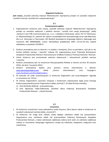 Regulamin konkursu pod nazwą „Szaszłyk potrawą mięsną? Niekoniecznie! Zaproponuj przepis na szaszłyka wyłącznie z polskich warzyw i prześlij nam swoją propozycję!” §1 Postanowienia ogólne 1. Organizatorem konkursu pod nazwą „Szaszłyk potrawą mięsną? Niekoniecznie! Zaproponuj przepis na szaszłyka wyłącznie z polskich warzyw i prześlij nam swoją propozycję!” (dalej „Konkurs”) jest ITBC Communication sp. z o.o. z siedzibą w Warszawie, adres: 03-717 Warszawa, ul. Kłopotowskiego 22, wpisana do rejestru przedsiębiorców prowadzonego przez Sąd Rejonowy dla m.st. Warszawy w Warszawie, XIII Wydział Gospodarczy Krajowego Rejestru Sądowego pod numerem KRS 0000038209, numer identyfikacji podatkowej (NIP) 113-22-32-133, kapitał zakładowy w wysokości 50.000 zł. 2. Konkurs prowadzony jest na zlecenie i w związku z kampanią „Pora na pomidora, czyli jak tu nie kochać polskich warzyw i owoców” (edycja VI), organizowaną przez Federację Branżowych Związków Producentów Rolnych, finansowaną ze środków Funduszu Promocji Owoców i Warzyw. 3. Celem Konkursu jest promowanie walorów odżywczych i zdrowotnych polskich warzyw i owoców. 4. Konkurs prowadzony jest na terytorium Rzeczpospolitej Polskiej w okresie od dnia 30 sierpnia 2016r. do dnia 7 września 2016 r. 5. Konkurs prowadzony będzie przy pomocy strony internetowej o adresie: www.poranapomidora.com (dalej „Strona internetowa”) oraz funpage’a: www.facebook.com/PoraNaPomidora 6. W stosunku do osób uczestniczących w Konkursie Organizator jest przyrzekającym nagrodę w rozumieniu art. 919 kc. 7. W imieniu Organizatora czynności związane z Konkursem wykonywane będą przez komisję konkursową powołaną przez Organizatora (dalej „Komisja”). W skład Komisji wchodzą: 1) Pani Dominika Wójciak – przewodniczący, 2) Pani Agnieszka Falba-Gałkowska, Dyrektor Biura Federacji Branżowych Związków Producentów Rolnych – członek Komisji. §2 Uczestnicy 1. W Konkursie uczestniczyć może pełnoletnia osoba fizyczna, która bierze udział w Konkursie na zasadach wskazanych poniżej (dalej „Uczestnik”). 2. W Konkursie nie mogą brać udziału osoby będące członkami władz lub pracownikami Organizatora oraz członkami władz lub pracownikami Federacji Branżowych Związków Producentów Rolnych, a także członkowie najbliższej rodziny tych osób. Za członków najbliższej rodziny w rozumieniu niniejszego regulaminu uznaje się małżonka, wstępnych, zstępnych oraz rodzeństwo. 1. 2. 3. 4. 5. 6. 7. 8. 9. 10. 1. 2. 3. 4. §3 Zasady Konkursu Zadaniem Uczestnika jest stworzenie szaszłyka z wykorzystaniem wyłącznie polskich, sezonowych warzyw oraz przesłanie przepisu szaszłyka (ze składnikami i sposobem przygotowania) i zdjęcia szaszłyka w ciekawej aranżacji pokazującej wykorzystane w przepisie warzywa. Przepis oraz zdjęcie szaszłyka powinno być przesłane na następujący adres poczty elektronicznej: [email protected], w terminie od dnia 30 sierpnia od godziny 13:00 do dnia 7 września 2016 r. do godziny 23:59. Zgłoszenia przesłane po ww. terminie nie będą brane pod uwagę przez Organizatora. Przepis na szaszłyk powinien być dołączony do wiadomości email w postaci dokumentu programu Microsoft Word, zaś dołączone zdjęcie szaszłyka powinno być zapisane w jednym z następujących formatów: „jpg”, „png”, „tiff” lub „gif”, zaś maksymalny rozmiar zdjęcia nie może przekraczać rozmiaru 2 MB. W wiadomości email, o której mowa w ustępie poprzedzającym, Uczestnik powinien wskazać również swoje imię i nazwisko oraz numer telefonu kontaktowego i nazwę miejscowości. Zgłoszenia niespełniające warunków opisanych powyżej nie będą uwzględniane w Konkursie. W Konkursie jeden Uczestnik może nadesłać wyłącznie jeden przepis. Uczestnik Konkursu przesyłając zgłoszenie, oświadcza, że jest autorem przepisu i zdjęcia oraz że przepis i zdjęcie nie będą naruszać praw osób trzecich oraz bierze na siebie pełną odpowiedzialność w przypadku, gdy osoba trzecia będzie sobie rościć prawa do przepisu i/lub zdjęcia. Nadsyłając przepis i zdjęcie Uczestnik wyraża zgodę na wykorzystanie przepisu i zdjęcia szaszłyka na potrzeby działań konkursowych, a w szczególności wyraża zgodę na publikację przepisu i zdjęcia potrawy na Stronie internetowej i funpage’u. Spośród wszystkich prawidłowo nadesłanych zgłoszeń Komisja wyłoni 3 Uczestników – laureatów Konkursu, będących autorami najlepszych lub najciekawszych przepisów na szaszłyk. Wybór Uczestników przez Komisję powinien nastąpić w terminie do dnia 23 września 2016 r. O wyborze Uczestnik powiadomiony zostanie za pośrednictwem wiadomości email wysłanej na adres poczty elektronicznej Uczestnika. Uczestnik w terminie 2 dni od dnia otrzymania wiadomości powinien potwierdzić przyjęcie nagrody w Konkursie. W przypadku braku kontaktu za pośrednictwem poczty elektronicznej, Organizator podejmie próbę kontaktu na numer telefonu wskazany przez Uczestnika. W przypadku nieudanej próby kontaktu do dnia 27 września 2016 r., Komisja zastrzega sobie prawo dokonania wyboru kolejnego zwycięskiego Uczestnika. Postanowienia ust. 9 stosuje się odpowiednio. §4 Nagroda w Konkursie W Konkursie Organizator przewidział trzy nagrody w postaci: zestawu sprzętu kuchennego i fartucha kuchennego o łącznej wartości 450, 00 zł każdy. Wydanie nagrody w postaci zestawu kuchennego nastąpi po potwierdzeniu przyjęcia nagrody przez Uczestnika w trybie wskazanym w § 3 ust. 9. Wydanie nagrody nastąpi za pośrednictwem przesyłki wysłanej Uczestnikowi najpóźniej w terminie do dnia 7 października 2016 r. Nagroda nie podlega wymianie na ekwiwalent pieniężny ani na inną nagrodę. Do każdej nagrody będzie przypisane świadczenie dodatkowe w kwocie w wysokości 11,11 % wartości nagrody („świadczenie dodatkowe”). 5. Przychód uzyskany z tytułu nagrody