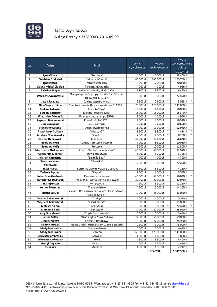 Lista wynikowa Aukcja Rzeźby • 332AR003, 2014-09-30 cena wywoławcza kwota wylicytowana kwota wylicytowana z opłatą aukcyjną Lot Autor Tytuł 1 2 3 5 6 Igor Mitoraj Stanisław Szukalski Igor Mitoraj Claude Michel Clodion Bolesław Biegas 14 000 zł 80 000 zł 13 000 zł 4 000 zł 1 800 zł 30 000 zł 145 000 zł 17 000 zł 4 200 zł 5 500 zł 35 400 zł 169 750 zł 20 060 zł 4 956 zł 6 490 zł 8 Wacław Szymanowski 18 000 zł 19 000 zł 22 420 zł 9 10 11 12 13 15 16 18 20 21 23 25 26 27 29 30 2 600 zł 70 000 zł 16 000 zł 13 000 zł 2 000 zł 13 000 zł 6 000 zł 11 000 zł 3 500 zł 7 000 zł 32 000 zł 7 000 zł 9 000 zł 40 000 zł 3 000 zł 4 000 zł 2 600 zł 120 000 zł 16 000 zł 13 000 zł 4 200 zł 14 000 zł 9 000 zł 11 000 zł 3 800 zł 7 000 zł 48 000 zł 8 500 zł 10 000 zł 44 000 zł 3 200 zł 4 000 zł 12 000 zł 19 000 zł 22 420 zł 32 33 35 36 39 40 Jacek Sarapata Alina Szapocznikow Barbara Falender Barbara Falender Władysław Miecznik Zygmunt Brachmański Jacek Sarapata Stanisław Wysocki Paweł Jacek Goliszek Krystyna Nowakowska Xawery Dunikowski Bolesław Cybis Bolesław Cybis Magdalena Abakanowicz Constantin Meunier Marian Konieczny Stanisław Horno Popławski Józef Marek Tadeusz Szpunar Julian Boss-Gosławski Krzysztof M. Bednarski Andrzej Getter Antoni Bieszczad "Perseusz" "Mówca - Orator" Para świeczników Tańcząca Bachantka Kobieta w welonie, około 1920 r. Płacząca (postać z grupy rzeźbiarskiej "Pochód na Wawel"), 1911 r. Kobieta wsparta o mur "Ventre - coussin [Brzuch - poduszka]", 1968 r. Szkic do "Ewy" Szkic do "Drzewa życia" Akt w zawstydzeniu, po 1946 r. Pływak, około 1976 r. Skok do wody Deszczowa piosenka "Magda -2" "Oni III" Madonna Głowa - prototyp wazonu Prototyp Z cyklu "Portrety anonimowe" Głowa mężczyzny "La Belle Bo..." "Nauzyka" 3 500 zł 2 600 zł 40 000 zł 26 000 zł 4 500 zł 4 500 zł 3 500 zł 3 000 zł 48 000 zł 28 000 zł 9 500 zł 12 000 zł 4 130 zł 3 540 zł 56 640 zł 33 040 zł 11 210 zł 14 160 zł 43 Tadeusz Szpunar 12 000 zł 28 000 zł 44 45 46 47 50 51 52 53 54 55 58 59 61 64 Wojciech Grzywaczyk Wojciech Grzywaczyk Mateusz Sikora Mateusz Sikora Jerzy Nowakowski Janusz Miller Jędrzej Wowro Henryk Kunzek Władysław Hasior Władysław Hasior Sylwester Ambroziak Sylwester Ambroziak Henryk Zegadło Nieznany "Portret w białym welonie", 1957 r. "Kapral” Pancernik powiatowy "Moby Dick - powierzchnia całkowita" Kompozycja Macierzyństwo Z cyklu „Rozważania nad kołem i kwadratem” "Kompozycja III" "Cyklop" "Cień Feniksa" Bez tytułu Bez tytułu Z cyklu "Introwersje" "Byk" z cyklu Znaki Zodiaku Chrystus frasobliwy Matka Boska z Dzieciątkiem w pozie oratorki Macierzyństwo Ochotnik Głowa II Troje W łodzi Marabut 4 000 zł 3 500 zł 19 000 zł 14 000 zł 8 000 zł 22 000 zł 13 000 zł 2 800 zł 5 000 zł 60 000 zł 1 600 zł 4 500 zł 500 zł 1 300 zł 4 500 zł 10 000 zł 19 000 zł 22 000 zł 8 000 zł 50 000 zł 22 000 zł 5 000 zł 5 500 zł 120 000 zł 1 600 zł 5 500 zł 1 200 zł 1 900 zł 966 200 zł 31 * * * * * 3 068 zł 141 000 zł 18 880 zł 15 340 zł 4 956 zł 16 520 zł 10 620 zł 12 980 zł 4 484 zł 8 260 zł 56 640 zł 10 030 zł 11 800 zł 51 920 zł 3 776 zł 4 720 zł * * * * * 33 040 zł * * * 5 310 zł 11 800 zł 22 420 zł 25 960 zł 9 440 zł 59 000 zł 25 960 zł 5 900 zł 6 490 zł 141 000 zł 1 888 zł 6 490 zł 1 416 zł 2 242 zł 1 337 566 zł DESA Unicum Sp. z o.o. ul. Marszałkowska 34/50 00-554 Warszawa tel. +48 (22) 584-95-25 fax. +48 (22) 584-95-26 email: [email protected] NIP 525-00-04-496 Spółka zarejestrowana w Sądzie Rejonowym dla m. st. Warszawy XII Wydział Gospodarczy KRS 0000090241. Kapitał zakładowy: 7 728 100,00 zł * * *