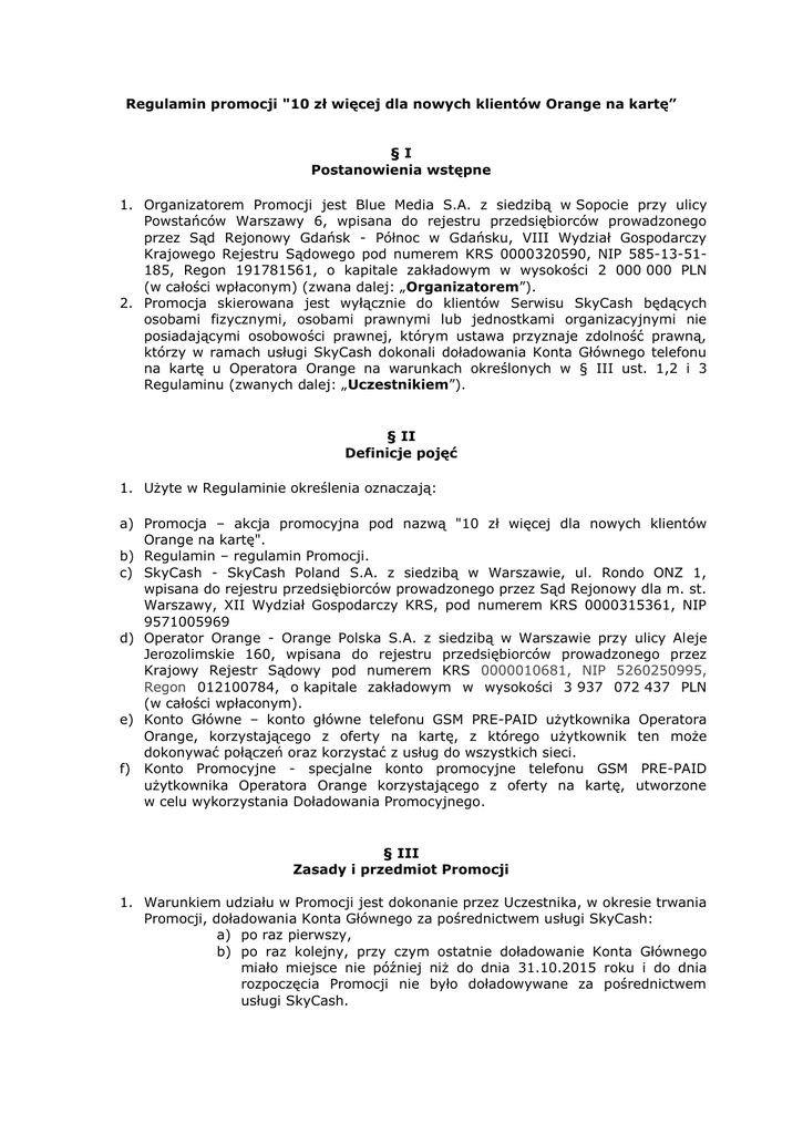 Regulamin promocji "10 zł więcej dla nowych klientów Orange na kartę” §I Postanowienia wstępne 1. Organizatorem Promocji jest Blue Media S.A. z siedzibą w Sopocie przy ulicy Powstańców Warszawy 6, wpisana do rejestru przedsiębiorców prowadzonego przez Sąd Rejonowy Gdańsk - Północ w Gdańsku, VIII Wydział Gospodarczy Krajowego Rejestru Sądowego pod numerem KRS 0000320590, NIP 585-13-51185, Regon 191781561, o kapitale zakładowym w wysokości 2 000 000 PLN (w całości wpłaconym) (zwana dalej: „Organizatorem”). 2. Promocja skierowana jest wyłącznie do klientów Serwisu SkyCash będących osobami fizycznymi, osobami prawnymi lub jednostkami organizacyjnymi nie posiadającymi osobowości prawnej, którym ustawa przyznaje zdolność prawną, którzy w ramach usługi SkyCash dokonali doładowania Konta Głównego telefonu na kartę u Operatora Orange na warunkach określonych w § III ust. 1,2 i 3 Regulaminu (zwanych dalej: „Uczestnikiem”). § II Definicje pojęć 1. Użyte w Regulaminie określenia oznaczają: a) Promocja – akcja promocyjna pod nazwą "10 zł więcej dla nowych klientów Orange na kartę". b) Regulamin – regulamin Promocji. c) SkyCash - SkyCash Poland S.A. z siedzibą w Warszawie, ul. Rondo ONZ 1, wpisana do rejestru przedsiębiorców prowadzonego przez Sąd Rejonowy dla m. st. Warszawy, XII Wydział Gospodarczy KRS, pod numerem KRS 0000315361, NIP 9571005969 d) Operator Orange - Orange Polska S.A. z siedzibą w Warszawie przy ulicy Aleje Jerozolimskie 160, wpisana do rejestru przedsiębiorców prowadzonego przez Krajowy Rejestr Sądowy pod numerem KRS 0000010681, NIP 5260250995, Regon 012100784, o kapitale zakładowym w wysokości 3 937 072 437 PLN (w całości wpłaconym). e) Konto Główne – konto główne telefonu GSM PRE-PAID użytkownika Operatora Orange, korzystającego z oferty na kartę, z którego użytkownik ten może dokonywać połączeń oraz korzystać z usług do wszystkich sieci. f) Konto Promocyjne - specjalne konto promocyjne telefonu GSM PRE-PAID użytkownika Operatora Orange korzystającego z oferty na kartę, utworzone w celu wykorzystania Doładowania Promocyjnego. § III Zasady i przedmiot Promocji 1. Warunkiem udziału w Promocji jest dokonanie przez Uczestnika, w okresie trwania Promocji, doładowania Konta Głównego za pośrednictwem usługi SkyCash: a) po raz pierwszy, b) po raz kolejny, przy czym ostatnie doładowanie Konta Głównego miało miejsce nie później niż do dnia 31.10.2015 roku i do dnia rozpoczęcia Promocji nie było doładowywane za pośrednictwem usługi SkyCash. 2. Promocja dotyczy wyłącznie doładowań telefonów na kartę u Operatora Orange zrealizowanych za pośrednictwem serwisu SkyCash o wartości 40 zł, przy czym Doładowanie Promocyjne o którym mowa w ust. 4 poniżej, zostanie przyznane za pierwsze 1000 doładowań o wartości 40 zł, dokonanych w czasie trwania Promocji. 3. Promocja trwa 1-12-2016 od godz. 09:00 do 31-03-2017 do godz. 23:59 lub do wyczerpania puli 1000 Doładowań Promocyjnych. 4. Po dokonaniu doładowania Konta Głównego o wartości wskazanej w ust. 2 powyżej w okresie trwania Promocji, Uczestnikowi zostanie przyznane doładowanie o wartości 10 zł (zwane dalej „Doładowaniem Promocyjnym”). 5. Doładowanie Promocyjne zostanie udzielone, w terminie do 14 dni roboczych licząc od dnia dokonania doładowania Konta Głównego na utworzone w celu wykorzystania Doładowania Promocyjnego Konto Promocyjne, o ile konto takie nie zostało wcześniej dla tego Uczestnika utworzone. 6. Doładowanie Promocyjne udzielone na Konto Promocyjne nie powoduje przedłużenia ważności Konta Głównego telefonu GSM PRE-PAID w ofercie na kartę. 7. Zgodnie z warunkami Operatora Orange, Doładowanie Promocyjne może być wykorzystane wyłącznie na połączenia, SMS-y i MMS-y w sieci Orange, na połączenia z numerami stacjonarnymi oraz na transfer danych (Internet). § IV Reklamacje 1. Reklamacje mogą być składane: a) drogą pisemną – osobiście w siedzibie Organizatora lub za pośrednictwem operatora pocztowego, kuriera lub posłańca na adres Organizatora: ul. Powstańców Warszawy 6, 81-718 Sopot; b) drogą elektroniczną - za pośrednictwem formularza reklamacyjnego dostępnego na stronie:pomoc.bluemedia.pl/; c) ustnie - telefonicznie pod nr tel. 58 7604 822 w godzinach 8:00 - 22.00 w dni robocze oraz w soboty w godzinach 8:00 – 16:00 (połączenie płatne według stawek właściwego dla użytkownika operatora telekomunikacyjnego) lub osobiście do protokołu w siedzibie Organizatora (w godzinach od 8.00 do 16.00 w dni robocze). 2. Złożenie reklamacji możliwe jest także przez pełnomocnika Uczestnika, dysponującego pełnomocnictwem udzielonym w zwykłej formie pisemnej. 3. Reklamacja powinna zawierać zwięzły opis zgłaszanych zastrzeżeń, numer transakcji oraz wskazanie danych Uczestnika wraz z jego adresem korespondencyjnym (np. adresem zamieszkania), chyba że: Uczestnik złożył reklamację za pomocą formularza reklamacyjnego dostępnego na stronie pomoc.bluemedia.pl/ - wówczas adres korespondencyjny nie jest wymagany lub gdy Uczestnik złożył wniosek o otrzymanie odpowiedzi na reklamację pocztą elektroniczną - wówczas Uczestnik wskazuje adres poczty e-mail do doręczenia odpowiedzi na reklamację (o ile Organizator nie posiada adresu e-mail Uczestnika). 4. Na żądanie Uczestnika, Organizator potwierdza Uczestnikowi otrzymanie reklamacji pocztą elektroniczną lub w formie pisemnej. 5. Organizator rozpatruje reklamację niezwłocznie, nie później niż w terminie 30 dni od dnia jej otrzymania. 6. W szczególnie skomplikowanych przypadkach, uniemożliwiających rozpatrzenie reklamacji i udzielenie odpowiedzi w terminie określonym w ust. 5, Organizator wyjaśnia Uczestnikowi przyczyny opóźnienia, wskazuje okoliczności, które muszą zostać ustalone dla rozpatrzenia reklamacji i wskazuje przewidywany termin rozpatrzenia reklamacji i udzieleni