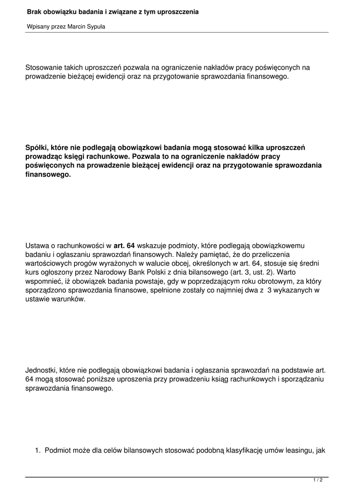 Brak obowiązku badania i związane z tym uproszczenia Wpisany przez Marcin Sypuła Stosowanie takich uproszczeń pozwala na ograniczenie nakładów pracy poświęconych na prowadzenie bieżącej ewidencji oraz na przygotowanie sprawozdania finansowego. Spółki, które nie podlegają obowiązkowi badania mogą stosować kilka uproszczeń prowadząc księgi rachunkowe. Pozwala to na ograniczenie nakładów pracy poświęconych na prowadzenie bieżącej ewidencji oraz na przygotowanie sprawozdania finansowego. Ustawa o rachunkowości w art. 64 wskazuje podmioty, które podlegają obowiązkowemu badaniu i ogłaszaniu sprawozdań finansowych. Należy pamiętać, że do przeliczenia wartościowych progów wyrażonych w walucie obcej, określonych w art. 64, stosuje się średni kurs ogłoszony przez Narodowy Bank Polski z dnia bilansowego (art. 3, ust. 2). Warto wspomnieć, iż obowiązek badania powstaje, gdy w poprzedzającym roku obrotowym, za który sporządzono sprawozdania finansowe, spełnione zostały co najmniej dwa z 3 wykazanych w ustawie warunków. Jednostki, które nie podlegają obowiązkowi badania i ogłaszania sprawozdań na podstawie art. 64 mogą stosować poniższe uproszenia przy prowadzeniu ksiąg rachunkowych i sporządzaniu sprawozdania finansowego. 1. Podmiot może dla celów bilansowych stosować podobną klasyfikację umów leasingu, jak 1/2 Brak obowiązku badania i związane z tym uproszczenia Wpisany przez Marcin Sypuła dla celów podatkowych. Niweluje to sytuację, kiedy np. umowa leasingu dla celów podatkowych sklasyfikowana zostaje jako leasing operacyjny, a dla celów bilansowych jako leasing finansowy, co rodzi dodatkowe obowiązki ewidencyjne (art. 3, ust. 6). 2. Jednostka może do kosztów bezpośrednich doliczyć koszty pośrednie związane z wytworzeniem produktu, niezależnie od poziomu wykorzystania zdolności produkcyjnych. Ustalony w ten sposób koszt wytworzenia nie może być wyższy od ceny sprzedaży netto (art. 28, ust. 4a). 3. Spółka może odstąpić od ustalania aktywów i rezerw z tytułu odroczonego podatku dochodowego (art. 37, ust. 10). 4. Spółka nie ma obowiązku przygotowania zestawienia zmian w kapitale (funduszu) własnym oraz rachunku przepływów pieniężnych (art. 45, ust. 3). 2/2
