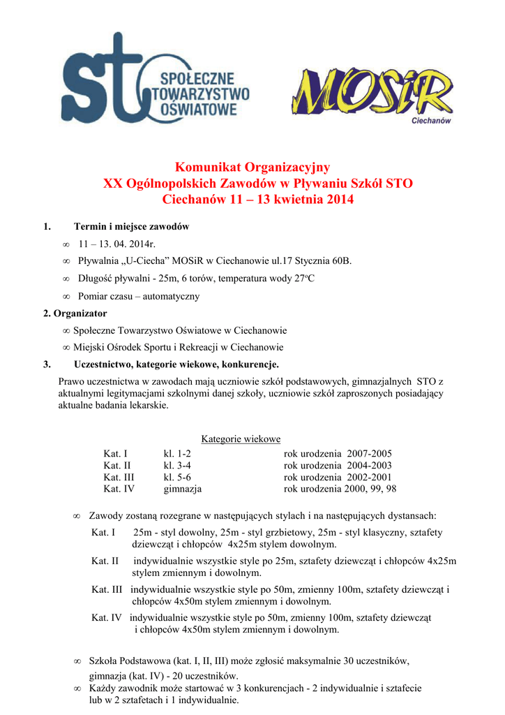 Komunikat Organizacyjny XX Ogólnopolskich Zawodów w Pływaniu Szkół STO Ciechanów 11 – 13 kwietnia 2014 1. Termin i miejsce zawodów • 11 – 13. 04. 2014r. • Pływalnia „U-Ciecha” MOSiR w Ciechanowie ul.17 Stycznia 60B. • Długość pływalni - 25m, 6 torów, temperatura wody 27oC • Pomiar czasu – automatyczny 2. Organizator • Społeczne Towarzystwo Oświatowe w Ciechanowie • Miejski Ośrodek Sportu i Rekreacji w Ciechanowie 3. Uczestnictwo, kategorie wiekowe, konkurencje. Prawo uczestnictwa w zawodach mają uczniowie szkół podstawowych, gimnazjalnych STO z aktualnymi legitymacjami szkolnymi danej szkoły, uczniowie szkół zaproszonych posiadający aktualne badania lekarskie. Kategorie wiekowe Kat. I Kat. II Kat. III Kat. IV • kl. 1-2 kl. 3-4 kl. 5-6 gimnazja rok urodzenia 2007-2005 rok urodzenia 2004-2003 rok urodzenia 2002-2001 rok urodzenia 2000, 99, 98 Zawody zostaną rozegrane w następujących stylach i na następujących dystansach: Kat. I 25m - styl dowolny, 25m - styl grzbietowy, 25m - styl klasyczny, sztafety dziewcząt i chłopców 4x25m stylem dowolnym. Kat. II indywidualnie wszystkie style po 25m, sztafety dziewcząt i chłopców 4x25m stylem zmiennym i dowolnym. Kat. III indywidualnie wszystkie style po 50m, zmienny 100m, sztafety dziewcząt i chłopców 4x50m stylem zmiennym i dowolnym. Kat. IV indywidualnie wszystkie style po 50m, zmienny 100m, sztafety dziewcząt i chłopców 4x50m stylem zmiennym i dowolnym. • • Szkoła Podstawowa (kat. I, II, III) może zgłosić maksymalnie 30 uczestników, gimnazja (kat. IV) - 20 uczestników. Każdy zawodnik może startować w 3 konkurencjach - 2 indywidualnie i sztafecie lub w 2 sztafetach i 1 indywidualnie. Zawodnik z wyższej kategorii nie może startować w niższej (dot. startów indywidualnych i sztafet). • Finalistom przed startem będą sprawdzane legitymacje szkolne. W przypadku braku zawodników w danej kategorii szkoła może wystawić więcej zawodników indywidualnie w innej kategorii, zachowując limit ogólny. • Organizator nie przewiduje startów poza konkurencjami. 4. Program zawodów: I dzień Piątek 11.04.2014 r. Blok poranny: rozgrzewka 8.45, otwarcie 9.45, eliminacje godz.10:00 Dziewczęta: Chłopcy: 1. 25 m stylem grzbietowym - roczniki 07-05 3. 25 m stylem grzbietowym - roczniki 04-03 5. 50 m stylem grzbietowym - roczniki 02-01 7. 50 m stylem grzbietowym - roczniki 00-98 2. 25 m stylem grzbietowym - roczniki 07-05 4. 25 m stylem grzbietowym - roczniki 04-03 6. 50 m stylem grzbietowym - roczniki 02-01 8. 50 m stylem grzbietowym - roczniki 00-98 I dzień Piątek 11.04.2014 r. Blok popołudniowy: rozgrzewka 15.00, eliminacje godz.16:00 Dziewczęta: Chłopcy: 9. 25 m stylem dowolnym - roczniki 07-05 11. 25 m stylem dowolnym - roczniki 04-03 13. 50 m stylem dowolnym - roczniki 02-01 15. 50 m stylem dowolnym - roczniki 00-98 10. 25 m stylem dowolnym - roczniki 07-05 12. 25 m stylem dowolnym - roczniki 04-03 14. 50 m stylem dowolnym - roczniki 02-01 16. 50 m stylem dowolnym - roczniki 00-98 II dzień Sobota 12.04.2014 r. Blok poranny: rozgrzewka 9.00, eliminacje godz.10:00 Dziewczęta: Chłopcy: 17. 25 m stylem klasycznym - roczniki 07-05 19. 25 m stylem klasycznym - roczniki 04-03 21. 50 m stylem klasycznym - roczniki 02-01 23. 50 m stylem klasycznym - roczniki 00-98 25. 25 m stylem motylkowym - roczniki 04-03 27. 50 m stylem motylkowym - roczniki 02-01 29. 50 m stylem motylkowym - roczniki 00-98 18. 25 m stylem klasycznym - roczniki 07-05 20. 25 m stylem klasycznym - roczniki 04-03 22. 50 m stylem klasycznym - roczniki 02-01 24. 50 m stylem klasycznym - roczniki 00-98 26. 25 m stylem motylkowym - roczniki 04-03 28. 50 m stylem motylkowym - roczniki 02-01 30. 50 m stylem motylkowym - roczniki 00-98 A – konkurencja 50 m stylem dowolnym (w wyścigu startują trenerzy, nauczyciele, opiekunowie zawodników). II dzień Sobota 12.04.2014 r. Blok popołudniowy: rozgrzewka 15.00, eliminacje godz.16:00 Dziewczęta 31. 100 m stylem zmiennym - roczniki 02-01 33. 100 m stylem zmiennym - roczniki 00-98 35. 4*25 m stylem dowolnym- roczniki 07-05 37. 4*25 m stylem zmiennym - roczniki 04-03 39. 4*50 m stylem zmiennym - roczniki 02-01 41. 4*50 m stylem zmiennym - roczniki 00-98 43. 4*25 m stylem dowolnym - roczniki 04-03 45. 4*50 m stylem dowolnym - roczniki 02-01 47. 4*50 m stylem dowolnym - roczniki 00-98 Chłopcy 32. 100 m stylem zmiennym - roczniki 02-01 34. 100 m stylem zmiennym - roczniki 00-98 36. 4*25 m stylem dowolnym - roczniki 07-05 38. 4*25 m stylem zmiennym - roczniki 04-03 40. 4*50 m stylem zmiennym - roczniki 02-01 42. 4*50 m stylem zmiennym - roczniki 00-98 44. 4*25 m stylem dowolnym - roczniki 04-03 46. 4*50 m stylem dowolnym - roczniki 02-01 48. 4*50 m stylem dowolnym - roczniki 00-98 B - sztafeta mieszana 4*25 m stylem dowolnym (w skład sztafety wchodzą uczeń i uczennica z kat. I oraz dwóch opiekunów) starty odbywają się w kolejności 1- uczeń kat. I; 2- opiekun (trener lub rodzic lub nauczyciel); 3- uczennica kat. I; 4- opiekun (trener lub rodzic lub nauczyciel). • • • 5. III dzień Niedziela 13.04.2014r. V blok rozgrzewka – godz. 8.00 wyścigi finałowe konkurencji 1-48 - godz. 9.00 zakończenie zawodów – ok. godz. 14.30 Punktacja, klasyfikacja, nagrody. Zawody zostaną rozegrane metodą eliminacji wstępnych i finałów, do których kwalifikuje się 6 zawodników z najlepszymi czasami. Jeżeli w danej kategorii nie będzie 6 zawodników lub sztafet- rozegrany będzie automatycznie finał. Z wyników konkurencji, indywidualnych i sztafet, prowadzona będzie punktacja wg następującego klucza: Indywidualnie I miejsce - 13 pkt. II miejsce - 11 pkt. III miejsce - 10 pkt. ...XII miejsce - 1 pkt. Sztafety punktowane będą podwójnie: I miejsce - 26 pkt. II miejsce - 22 pkt. III miejsce - 20 pkt. ...XII miejsce - 2 pkt. Suma uzyskanych punktów w konkurencjach indywidualnych i sztafetach decyduje o miejscu ekipy w klasyfikacji zespołowej. Klasyfikacja zes