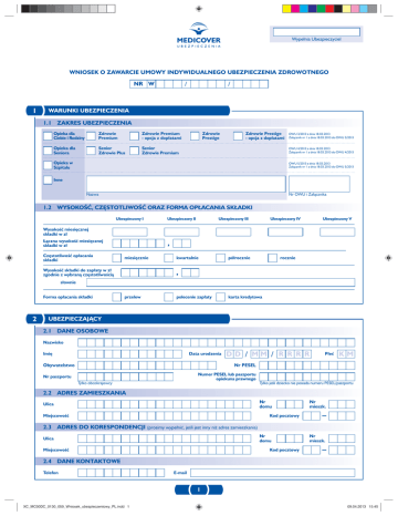 Wypełnia Ubezpieczyciel WNIOSEK O ZAWARCIE UMOWY INDYWIDUALNEGO UBEZPIECZENIA ZDROWOTNEGO NR W 1 / / WARUNKI UBEZPIECZENIA 1.1 ZAKRES UBEZPIECZENIA Opieka dla Ciebie i Rodziny Zdrowie Premium Zdrowie Premium - opcja z dopłatami Opieka dla Seniora Senior Zdrowie Plus Senior Zdrowie Premium Zdrowie Prestige Zdrowie Prestige - opcja z dopłatami OWU 3/2013 z dnia 18.03.2013 Załącznik nr 1 z dnia 18.03.2013 do OWU 3/2013 OWU 4/2013 z dnia 18.03.2013 Załącznik nr 1 z dnia 18.03.2013 do OWU 4/2013 Opieka w Szpitalu OWU 5/2013 z dnia 18.03.2013 Załącznik nr 1 z dnia 18.03.2013 do OWU 5/2013 Inne Nazwa Nr OWU i Załącznika 1.2 WYSOKOŚĆ, CZĘSTOTLIWOŚĆ ORAZ FORMA OPŁACANIA SKŁADKI Ubezpieczony I Ubezpieczony II Ubezpieczony III Ubezpieczony IV Ubezpieczony V Wysokość miesięcznej składki w zł Łączna wysokość miesięcznej składki w zł Częstotliwość opłacania składki , miesięcznie Wysokość składki do zapłaty w zł zgodnie z wybraną częstotliwością kwartalnie półrocznie rocznie , słownie Forma opłacania składki 2 przelew polecenie zapłaty karta kredytowa UBEZPIECZAJĄCY 2.1 DANE OSOBOWE Nazwisko Imię Data urodzenia Obywatelstwo D D / MM / R R R R Płeć KM Nr PESEL Numer PESEL lub paszportu opiekuna prawnego Nr paszportu Tylko obcokrajowcy Tylko jeśli dziecko nie posiada numeru PESEL/paszportu 2.2 ADRES ZAMIESZKANIA Nr domu Ulica Miejscowość Kod pocztowy Nr mieszk. − 2.3 ADRES DO KORESPONDENCJI (prosimy wypełnić, jeśli jest inny niż adres zamieszkania) Nr domu Ulica Miejscowość Kod pocztowy Nr mieszk. − 2.4 DANE KONTAKTOWE Telefon E-mail 1 XC_MC00DC_0130_059_Wniosek_ubezpieczeniowy_PL.indd 1 09.04.2013 15:45 3 UBEZPIECZONY I Czy Ubezpieczający jest równocześnie Ubezpieczonym? T N Jeśli zaznaczono opcję “TAK” prosimy o przejście do sekcji 4. 3.1 DANE OSOBOWE Nazwisko Imię Data urodzenia Obywatelstwo D D / MM / R R R R Płeć KM Nr PESEL Numer PESEL lub paszportu opiekuna prawnego Nr paszportu Tylko obcokrajowcy Tylko jeśli dziecko nie posiada numeru PESEL/paszportu 3.2 ADRES ZAMIESZKANIA (prosimy wypełnić, jeśli jest inny niż adres zamieszkania Ubezpieczającego) Nr domu Ulica Miejscowość Kod pocztowy Nr mieszk. − 3.3 ADRES DO KORESPONDENCJI (prosimy wypełnić, jeśli jest inny niż adres zamieszkania) Nr domu Ulica Miejscowość Kod pocztowy Nr mieszk. − 3.4 DANE KONTAKTOWE Telefon 4 E-mail UBEZPIECZONY II 4.1 DANE OSOBOWE Nazwisko Imię Data urodzenia Obywatelstwo D D / MM / R R R R Płeć KM Nr PESEL Numer PESEL lub paszportu opiekuna prawnego Nr paszportu Tylko obcokrajowcy Tylko jeśli dziecko nie posiada numeru PESEL/paszportu 4.2 ADRES ZAMIESZKANIA (prosimy wypełnić, jeśli jest inny niż adres zamieszkania Ubezpieczającego) Nr domu Ulica Miejscowość Kod pocztowy Nr mieszk. − 4.3 ADRES DO KORESPONDENCJI (prosimy wypełnić, jeśli jest inny niż adres zamieszkania) Nr domu Ulica Miejscowość Kod pocztowy Nr mieszk. − 4.4 DANE KONTAKTOWE Telefon 5 E-mail UBEZPIECZONY III 5.1 DANE OSOBOWE Nazwisko Imię Data urodzenia Obywatelstwo D D / MM / R R R R Płeć KM Nr PESEL Nr paszportu Tylko obcokrajowcy Numer PESEL lub paszportu opiekuna prawnego Tylko jeśli dziecko nie posiada numeru PESEL/paszportu 5.2 ADRES ZAMIESZKANIA (prosimy wypełnić, jeśli jest inny niż adres zamieszkania Ubezpieczającego) Nr domu Ulica Miejscowość Kod pocztowy Nr mieszk. − 2 XC_MC00DC_0130_059_Wniosek_ubezpieczeniowy_PL.indd 2 09.04.2013 15:46 5 UBEZPIECZONY III (cd.) 5.3 ADRES DO KORESPONDENCJI (prosimy wypełnić, jeśli jest inny niż adres zamieszkania) Nr domu Ulica Miejscowość Kod pocztowy Nr mieszk. − 5.4 DANE KONTAKTOWE Telefon 6 E-mail UBEZPIECZONY IV 6.1 DANE OSOBOWE Nazwisko Imię Data urodzenia Obywatelstwo D D / MM / R R R R Płeć KM Nr PESEL Numer PESEL lub paszportu opiekuna prawnego Nr paszportu Tylko obcokrajowcy Tylko jeśli dziecko nie posiada numeru PESEL/paszportu 6.2 ADRES ZAMIESZKANIA (prosimy wypełnić, jeśli jest inny niż adres zamieszkania Ubezpieczającego) Nr domu Ulica Miejscowość Kod pocztowy Nr mieszk. − 6.3 ADRES DO KORESPONDENCJI (prosimy wypełnić, jeśli jest inny niż adres zamieszkania) Nr domu Ulica Miejscowość Kod pocztowy Nr mieszk. − 6.4 DANE KONTAKTOWE Telefon 7 E-mail UBEZPIECZONY V 7.1 DANE OSOBOWE Nazwisko Imię Data urodzenia Obywatelstwo D D / MM / R R R R Płeć KM Nr PESEL Numer PESEL lub paszportu opiekuna prawnego Nr paszportu Tylko obcokrajowcy Tylko jeśli dziecko nie posiada numeru PESEL/paszportu 7.2 ADRES ZAMIESZKANIA (prosimy wypełnić, jeśli jest inny niż adres zamieszkania Ubezpieczającego) Nr domu Ulica Miejscowość Kod pocztowy Nr mieszk. − 7.3 ADRES DO KORESPONDENCJI (prosimy wypełnić, jeśli jest inny niż adres zamieszkania) Nr domu Ulica Miejscowość Kod pocztowy Nr mieszk. − 7.4 DANE KONTAKTOWE Telefon E-mail 3 XC_MC00DC_0130_059_Wniosek_ubezpieczeniowy_PL.indd 3 09.04.2013 15:46 8 KWESTIONARIUSZ MEDYCZNY Prosimy o udzielenie odpowiedzi na poniżej zadane pytania. Jeżeli składają Państwo wniosek o zawarcie ubezpieczenia zdrowotnego dla rodziny i na którekolwiek z poniższych pytań udzielili odpowiedzi TAK, prosimy o wskazanie której osoby Ubezpieczonej to dotyczy poprzez zaznaczenie “X”. Każda odpowiedź “TAK” wymaga udzielenia szczegółowych informacji w sekcji 9 - WYJAŚNIENIA DO KWESTIONARIUSZA MEDYCZNEGO. W przypadku wątpliwości, czy dana informacja jest istotna przy zawieraniu umowy ubezpieczenia, prosimy o jej ujawnienie. Prosimy o przekazanie wszelkich informacji na temat stanu zdrowia ubezpieczanych osób, w tym zdiagnozowanych chorób, a także odczuwanych objawów bądź dolegliwości, niezależnie od tego, czy były konsultowane z lekarzem czy też nie. SEKCJA 8.1 (DOTYCZY: ZDROWIE PREMIUM, ZDROWIE PREMIUM - OPCJA Z DOPŁATAMI, ZDROWIE PRESTIGE, ZDROWIE PRESTIGE - OPCJA Z DOPŁATAMI, SENIOR OPIEKA PLUS, SENIOR OPIEKA PREMIUM, OPIEKA W SZPITALU) Ubezpieczony I 1. Czy w okresie ostatnich 24 miesięcy kt