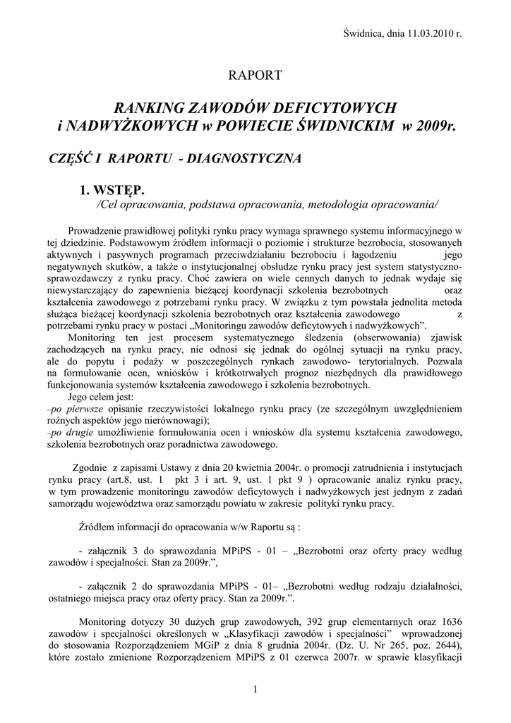 Świdnica, dnia 11.03.2010 r. RAPORT RANKING ZAWODÓW DEFICYTOWYCH i NADWYŻKOWYCH w POWIECIE ŚWIDNICKIM w 2009r. CZĘŚĆ I RAPORTU - DIAGNOSTYCZNA 1. WSTĘP. /Cel opracowania, podstawa opracowania, metodologia opracowania/ Prowadzenie prawidłowej polityki rynku pracy wymaga sprawnego systemu informacyjnego w tej dziedzinie. Podstawowym źródłem informacji o poziomie i strukturze bezrobocia, stosowanych aktywnych i pasywnych programach przeciwdziałaniu bezrobociu i łagodzeniu jego negatywnych skutków, a także o instytucjonalnej obsłudze rynku pracy jest system statystycznosprawozdawczy z rynku pracy. Choć zawiera on wiele cennych danych to jednak wydaje się oraz niewystarczający do zapewnienia bieżącej koordynacji szkolenia bezrobotnych kształcenia zawodowego z potrzebami rynku pracy. W związku z tym powstała jednolita metoda służąca bieżącej koordynacji szkolenia bezrobotnych oraz kształcenia zawodowego z potrzebami rynku pracy w postaci „Monitoringu zawodów deficytowych i nadwyżkowych”. Monitoring ten jest procesem systematycznego śledzenia (obserwowania) zjawisk zachodzących na rynku pracy, nie odnosi się jednak do ogólnej sytuacji na rynku pracy, ale do popytu i podaży w poszczególnych rynkach zawodowo- terytorialnych. Pozwala na formułowanie ocen, wniosków i krótkotrwałych prognoz niezbędnych dla prawidłowego funkcjonowania systemów kształcenia zawodowego i szkolenia bezrobotnych. Jego celem jest: −po pierwsze opisanie rzeczywistości lokalnego rynku pracy (ze szczególnym uwzględnieniem rożnych aspektów jego nierównowagi); −po drugie umożliwienie formułowania ocen i wniosków dla systemu kształcenia zawodowego, szkolenia bezrobotnych oraz poradnictwa zawodowego. Zgodnie z zapisami Ustawy z dnia 20 kwietnia 2004r. o promocji zatrudnienia i instytucjach rynku pracy (art.8, ust. 1 pkt 3 i art. 9, ust. 1 pkt 9 ) opracowanie analiz rynku pracy, w tym prowadzenie monitoringu zawodów deficytowych i nadwyżkowych jest jednym z zadań samorządu województwa oraz samorządu powiatu w zakresie polityki rynku pracy. Źródłem informacji do opracowania w/w Raportu są : - załącznik 3 do sprawozdania MPiPS - 01 – „Bezrobotni oraz oferty pracy według zawodów i specjalności. Stan za 2009r.”, - załącznik 2 do sprawozdania MPiPS - 01– „Bezrobotni według rodzaju działalności, ostatniego miejsca pracy oraz oferty pracy. Stan za 2009r.”. Monitoring dotyczy 30 dużych grup zawodowych, 392 grup elementarnych oraz 1636 zawodów i specjalności określonych w „Klasyfikacji zawodów i specjalności” wprowadzonej do stosowania Rozporządzeniem MGiP z dnia 8 grudnia 2004r. (Dz. U. Nr 265, poz. 2644), które zostało zmienione Rozporządzeniem MPiPS z 01 czerwca 2007r. w sprawie klasyfikacji 1 zawodów i specjalności dla potrzeb rynku pracy oraz zakresu jej stosowania (Dz. U. Nr 106, poz. 728). Ponadto przy monitoringu uwzględniono poziom i strukturę bezrobotnych oraz zgłaszane oferty pracy według Polskiej Klasyfikacji Działalności. Wdrożenie monitoringu zawodów deficytowych i nadwyżkowych pozwoli w szczególności na: - określenie kierunków i natężenia zmian zachodzących w strukturze zawodowo -kwalifikacyjnej na lokalnym, regionalnym i krajowym rynku pracy; - stworzenie bazy informacyjnej dla opracowania przyszłych struktur zawodowo -kwalifikacyjnych w układzie lokalnym, regionalnym i krajowym; - określenie odpowiednich kierunków szkolenia bezrobotnych, zapewniających większą efektywność organizowanych szkoleń; - bieżącą korektę poziomu, struktury i treści kształcenia zawodowego (dot. władz oświatowych oraz dyrekcji szkół ); - usprawnienie poradnictwa i nadwyżkowych; zawodowego poprzez wskazanie zawodów deficytowych - usprawnienie pośrednictwa pracy poprzez uzyskanie informacji o planowanych ofertach pracy na rok przyszły oraz przewidywanej liczbie absolwentów według zawodów; - ułatwienie realizacji programów specjalnych. 2. ANALIZA BEZROBOCIA WG ZAWODÓW . Analizę bezrobocia wg zawodów dokonano w oparciu o dane statystyczne za 2009 r. ze sprawozdań MPiPS – 01 wygenerowane dzięki programowi komputerowemu. Na podstawie szczegółowych zestawień tabelarycznych zawierających n/w dane statystyczne: Największa liczba osób bezrobotnych na koniec 2008 i 2009r. była w n/w zawodach (tabela porównawcza): L.P. 1. Kod zawodu 0 Wyszczególnienie 2008r. ogółem kobiety bez zawodu 1356 735 2. 522107 sprzedawca 417 3. 722204 ślusarz 4. Kod zawodu 2009r. ogółem kobiety bez zawodu 1622 857 388 522107 sprzedawca 478 432 254 26 722204 ślusarz 383 33 743304 krawiec 193 189 341902 asystent ekonomiczny 192 169 5. 341902 asystent ekonomiczny 186 166 743304 krawiec 181 176 6. 743604 szwaczka 172 172 743604 szwaczka 163 162 7. 419101 pracownik biurowy 128 124 419101 pracownik biurowy 156 143 8. 311502 technik mechanik 114 21 712102 murarz 148 0 9. 914103 robotnik gospodarczy 106 50 722304 tokarz 146 15 10. 722304 tokarz 106 22 914103 robotnik gospodarczy 144 77 11. 712102 murarz 100 0 311502 technik mechanik 132 18 2 0 Wyszczególnienie 12 512201 kucharz 98 87 512201 kucharz 99 81 13. 413103 magazynier 77 27 413103 magazynier 98 27 14. 244104 pedagog 72 59 244104 pedagog 87 75 15. 913207 sprzątaczka 67 66 913207 sprzątaczka 81 80 16. 241102 ekonomista 67 52 343101 pracownik administracyjny 75 67 17. 343101 pracownik administracyjny 66 61 931301 robotnik budowlany 67 0 18. 341501 handlowiec 53 41 247901 specjalista administracji publicznej 64 53 19. 832302 kierowca samochodu ciężarowego 53 0 932103 pakowacz 61 54 20. 742204 stolarz 52 7 241912 specjalista ds marketingu i handlu 60 40 21 723105 mechanik samochodów osobowych 51 0 742204 stolarz 58 3 22. 241912 specjalista ds marketingu i handlu 49 28 312102 technik informatyk 57 14 23. 312102 technik informatyk 49 17 711301 kamieniarz 56 0 24. 247901 specjalista administracji publicznej 47 40 741203 piekarz 55 1 25. 931301 robotnik budowlan