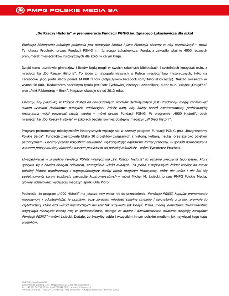 „Do Rzeczy Historia” w prenumeracie Fundacji PGNiG im. Ignacego Łukasiewicza dla szkół Edukacja historyczna młodego pokolenia jest niezwykle istotna i jako Fundacja chcemy w niej uczestniczyć – mówi Tymoteusz Pruchnik, prezes Fundacji PGNiG im. Ignacego Łukasiewicza. Fundacja zakupiła właśnie 4000 rocznych prenumerat miesięczników historycznych dla szkół w całym kraju. Dzięki temu uczniowie gimnazjów i liceów będą mogli w swoich szkolnych bibliotekach i czytelniach korzystać m.in. z miesięcznika „Do Rzeczy Historia”. To jeden z najpopularniejszych w Polsce miesięczników historycznych, tylko na Facebooku jego profil śledzi ponad 14 000 fanów (https://www.facebook.com/HistoriaDoRzeczy). Nakład miesięcznika wynosi 58 000. Redaktorem naczelnym tytułu jest Piotr Zychowicz, historyk i dziennikarz, autor m.in. książek „Obłęd’44” oraz „Pakt Ribbentrop – Beck”. Magazyn ukazuje się od 2013 roku. Chcemy, aby placówki, w których dostęp do nowoczesnych środków dydaktycznych jest utrudniony, mogły zaoferować swoim uczniom dodatkowe narzędzia edukacyjne. Zależy nam, aby każdy uczeń zainteresowany problematyką historyczną mógł poszerzać swoją wiedzę – mówi prezes Fundacji PGNiG. W programie „4000 Historii”, obok miesięcznika „Do Rzeczy Historia” w szkołach będzie również dostępny magazyn „W Sieci Historii”. Program prenumeraty miesięczników historycznych wpisuje się w szerszy program Fundacji PGNiG pn.: „Rozgrzewamy Polskie Serca”. Fundacja zrealizowała blisko 30 projektów związanych z historią, kulturą, nauką oraz szeroko pojętym patriotyzmem. Chcemy przede wszystkim edukować. Wykorzystując najnowsze formy przekazu, w sposób nowoczesny a zarazem prosty musimy dotrzeć z naszym przekazem do polskiej młodzieży – mówi Tymoteusz Pruchnik. Uwzględnienie w projekcie Fundacji PGNiG miesięcznika „Do Rzeczy Historia” to uznanie znaczenia tego tytułu, który spotyka się z bardzo dobrym odbiorem, szczególnie wśród młodych. To jedno z najlepszych źródeł wiedzy na temat polskiej historii współczesnej i najpopularniejszy dzisiaj polski magazyn historyczny, który nie unika i nie boi się podejmowania spraw trudnych, nierzadko kontrowersyjnych – mówi Michał M. Lisiecki, prezes PMPG Polskie Media, główny udziałowiec wydającej magazyn spółki Orle Pióro. Podkreśla, że program „4000 Historii” ma jeszcze inny walor nie do przecenienia. Fundacja PGNiG, kupując prenumeraty magazynów i udostępniając je uczniom, uczy zarazem młodzież szkolną czytania i korzystania z prasy, promuje to czytelnictwo, które dziś wśród najmłodszych nie jest tak oczywiste jak kiedyś. Prasa, media, prawdziwe dziennikarstwo odgrywają niezwykle ważną rolę w społeczeństwie, dlatego za mądre i dalekowzroczne działanie dziękuję zarządowi Fundacji PGNiG” – mówi Lisiecki. Dodaje, że życzyłby sobie i wszystkim innym polskim mediom jak najwięcej tego typu projektów. PMPG Polskie Media SA Batory Office Building II, Al. Jerozolimskie 212, 02-486 Warszawa tel. (+48 22) 347 50 00, fax (+48 22) 347 50 01, www.point-group.pl NIP 521-00-88-831, REGON 010768408, KRS 0000051017, Kapitał zakładowy: 103 897 320 zł