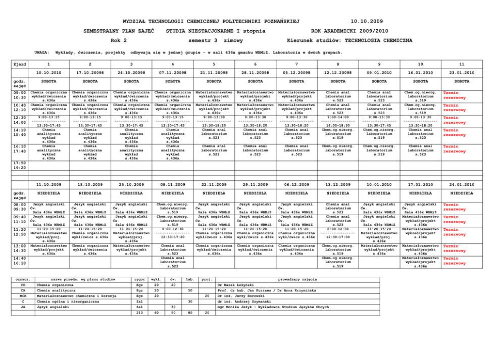 WYDZIAŁ TECHNOLOGII CHEMICZNEJ POLITECHNIKI POZNAŃSKIEJ SEMESTRALNY PLAN ZAJĘĆ STUDIA NIESTACJONARNE I stopnia Rok 2 UWAGA: Zjazd Wykłady, ćwiczenia, projekty semestr 3 zimowy 10.10.2009 ROK AKADEMICKI 2009/2010 Kierunek studiów: TECHNOLOGIA CHEMICZNA odbywają się w jednej grupie - w sali 436x gmachu WBMiZ. Laboratoria w dwóch grupach. 1 2 3 4 5 6 7 8 9 10 11 10.10.2010 17.10.20098 24.10.20098 07.11.20098 21.11.20098 28.11.20098 05.12.20098 12.12.20098 09.01.2010 16.01.2010 23.01.2010 godz. zajęć SOBOTA SOBOTA SOBOTA SOBOTA SOBOTA SOBOTA SOBOTA SOBOTA SOBOTA SOBOTA SOBOTA 09:00 10:30 Chemia organiczna wykład/ćwiczenia s.436x Chemia organiczna wykład/ćwiczenia s.436x 9:00-13:15 ---------------13:30-17:45 Chemia analityczna wykład s.436x Chemia analityczna wykład s.436x Chemia organiczna wykład/ćwiczenia s.436x Chemia organiczna wykład/ćwiczenia s.436x 9:00-13:15 ---------------13:30-17:45 Chemia analityczna wykład s.436x Chemia analityczna wykład s.436x Chemia organiczna wykład/ćwiczenia s.436x Chemia organiczna wykład/ćwiczenia s.436x 9:00-13:15 ---------------13:30-17:45 Chemia analityczna wykład s.436x Chemia analityczna wykład s.436x Chemia organiczna wykład/ćwiczenia s.436x Chemia organiczna wykład/ćwiczenia s.436x 9:00-13:15 ---------------13:30-17:45 Chemia analityczna wykład s.436x Chemia analityczna wykład s.436x Materiałoznawstwo wykład/projekt s.436x Materiałoznawstwo wykład/projekt s.436x 9:00-13:30 ---------------13:30-18:20 Chemia anal laboratorium s.523 Materiałoznawstwo wykład/projekt s.436x Materiałoznawstwo wykład/projekt s.436x 9:00-13:30 ---------------13:30-18:20 Chemia anal laboratorium s.523 Materiałoznawstwo wykład/projekt s.436x Materiałoznawstwo wykład/projekt s.436x 9:00-13:30 ---------------13:30-18:20 Chemia anal laboratorium s.523 Chemia anal laboratorium s.523 Chemia anal laboratorium s.523 9:00-14:00 ---------------14:00-18:30 Chem.og.nieorg. laboratorium s.519 Chemia anal laboratorium s.523 Chemia anal laboratorium s.523 9:00-13:30 ---------------13:30-17:45 Chem.og.nieorg. laboratorium s.519 Chem.og.nieorg. laboratorium s.519 Chem.og.nieorg. laboratorium s.519 9:00-13:30 ---------------13:30-18:20 Chemia anal laboratorium s.523 Termin rezerwowy Chemia anal laboratorium s.523 Chemia anal laboratorium s.523 Chemia anal laboratorium s.523 Chem.og.nieorg. laboratorium s.519 Chem.og.nieorg. laboratorium s.519 Chemia anal laboratorium s.523 Termin rezerwowy 10:40 12:10 12:30 14:00 14:10 15:40 16:10 17:40 Termin rezerwowy Termin rezerwowy Termin rezerwowy 17:50 19:20 11.10.2009 18.10.2009 25.10.2009 08.11.2009 22.11.2009 29.11.2009 06.12.2009 13.12.2009 10.01.2010 17.01.2010 24.01.2010 godz. zajęć NIEDZIELA NIEDZIELA NIEDZIELA NIEDZIELA NIEDZIELA NIEDZIELA NIEDZIELA NIEDZIELA NIEDZIELA NIEDZIELA NIEDZIELA 08:00 09:30 Język angielski Ćw. Sala 436x WBMiZ Język angielski Ćw. Sala 436x WBMiZ 11:20-15:20 Materiałoznawstwo wykład/proj. s.436x Materiałoznawstwo wykład/projekt s.436x Język angielski Ćw. Sala 436x WBMiZ Język angielski Ćw. Sala 436x WBMiZ 11:20-15:20 Chemia organiczna wykł/ćwicz s.436x Język angielski Ćw. Sala 436x WBMiZ Język angielski Ćw. Sala 436x WBMiZ 11:20-15:20 Materiałoznawstwo wykład/proj. s.436x Materiałoznawstwo wykład/projekt s.436x Chem.og.nieorg. laboratorium s.519 Chem.og.nieorg. laboratorium s.519 8:00-12:30 ---------------12:30-17:20 Język angielski Ćw. Sala 436x WBMiZ Język angielski Ćw. Sala 436x WBMiZ 11:20-15:20 Chemia organiczna wykł/ćwicz s.436x Język angielski Ćw. Sala 436x WBMiZ Język angielski Ćw. Sala 436x WBMiZ 11:20-15:20 Chemia organiczna wykł/ćwicz s.436x Język angielski Ćw. Sala 436x WBMiZ Język angielski Ćw. Sala 436x WBMiZ 11:20-15:20 Chemia organiczna wykł/ćwicz s.436x Chemia anal laboratorium s.523 Chemia anal laboratorium s.523 8:00-12:30 ---------------12:30-17:00 Język angielski Ćw. Sala 436x WBMiZ Materiałoznawstwo wykład/projekt s.436x Materiałoznawstwo wykład/projekt s.436x Termin rezerwowy Chemia anal laboratorium s.523 Chemia anal laboratorium s.523 Chemia organiczna wykład/ćwiczenia s.436x Chemia organiczna wykład/ćwiczenia s.436x Chemia organiczna wykład/ćwiczenia s.436x Chem.og.nieorg. laboratorium s.519 Chem.og.nieorg. laboratorium s.519 Język angielski Ćw. Sala 436x WBMiZ Język angielski Ćw. Sala 436x WBMiZ 11:20-15:20 Materiałoznawstwo wykład/proj. s.436x Materiałoznawstwo wykład/projekt s.436x Materiałoznawstwo wykład/projekt s.436x Materiałoznawstwo wykład/projekt s.436x Termin rezerwowy 09:40 11:10 11:20 12:50 13:00 14:30 Chemia organiczna wykład/ćwiczenia s.436x 14:40 16:10 oznacz. rygor wykł. ćw. Chemia organiczna Egz 20 20 CA Chemia analityczna Egz 20 MCK Materiałoznawstwo chemiczne i korozja Egz 20 Chemia ogólna i nieorganiczna Zal Język angielski Zal CO C JA nazwa przedm. wg planu studiów 210 lab. proj. 50 Prof. dr hab. Jan Kurzawa / Dr Anna Krzymińska 20 30 50 Dr inŜ. Jerzy Borowski dr inŜ. Andrzej Szymański 30 60 prowadzący zajęcia Dr Marek ŁoŜyński mgr Monika JeŜyk - Wykładowca Studium Języków Obcych 80 20 Termin rezerwowy Termin rezerwowy Termin rezerwowy Politechnika Poznańska, Wydział Technologii Chemicznej Rok akademicki 2009/2010 semestr zimowy (03) Studia niestacjonarne I stopnia Kierunek TECHNOLOGIA CHEMICZNA Lista studentów II roku Lp. Nazwisko Imię 1. 2. 3. 4. 5. 6. 7. 8. 9. 10. 11. 12. 13. 14. 15. 16. 17. 18. 19. 20. 21. Banachowicz Bednarek Bidyj BłaŜejczak Działdowska Felhauer Grenda Karolak Kazimierska Kubiak Kurek Macioszczyk Macioszczyk Marchwiak Oboza Smolarz Tomaszewski Warzybok Wesoły Wrzesińska Ziętkiewicz BłaŜej Jacek Mateusz Tomasz Katarzyna Bartosz Katarzyna Monika Violetta Piotr Paweł Katarzyna Łukasz Paweł Adam Patryk Mateusz Ewelina Ireneusz Joanna Jan