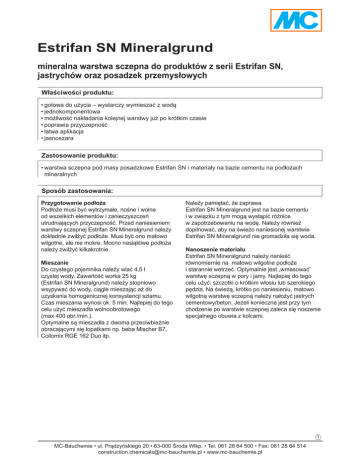Estrifan SN Mineralgrund mineralna warstwa sczepna do produktów z serii Estrifan SN, jastrychów oraz posadzek przemysłowych Właściwości produktu: •gotowa do użycia – wystarczy wymieszać z wodą •jednokomponentowa •możliwość nakładania kolejnej warstwy już po krótkim czasie •poprawia przyczepność •łatwa aplikacja •jasnoszara Zastosowanie produktu: •warstwa sczepna pod masy posadzkowe Estrifan SN i materiały na bazie cementu na podłożach mineralnych Sposób zastosowania: Przygotowanie podłoża Podłoże musi być wytrzymałe, nośne i wolne od wszelkich elementów i zanieczyszczeń utrudniających przyczepność. Przed naniesieniem warstwy sczepnej Estrifan SN Mineralgrund należy dokładnie zwilżyć podłoże. Musi być ono matowo wilgotne, ale nie mokre. Mocno nasiąkliwe podłoża należy zwilżyć kilkakrotnie. Mieszanie Do czystego pojemnika należy wlać 4,5 l czystej wody. Zawartość worka 25 kg (Estrifan SN Mineralgrund) należy stopniowo wsypywać do wody, ciągle mieszając aż do uzyskania homogenicznej konsystencji szlamu. Czas mieszania wynosi ok. 5 min. Najlepiej do tego celu użyć mieszadła wolnoobrotowego (max 400 obr./min.). Optymalne są mieszadła z dwoma przeciwbieżnie obracającymi się łopatkami np. beba Mischer B7, Collomix RGE 162 Duo itp. Należy pamiętać, że zaprawa Estrifan SN Mineralgrund jest na bazie cementu i w związku z tym mogą wystąpić różnice w zapotrzebowaniu na wodę. Należy również dopilnować, aby na świeżo naniesionej warstwie Estrifan SN Mineralgrund nie gromadziła się woda. Nanoszenie materiału Estrifan SN Mineralgrund należy nanieść równomiernie na matowo wilgotne podłoże i starannie wetrzeć. Optymalnie jest „wmasować” warstwę sczepną w pory i jamy. Najlepiej do tego celu użyć: szczotki o krótkim włosiu lub szerokiego pędzla. Na świeżą, krótko po naniesieniu, matowo wilgotną warstwę sczepną należy nałożyć jastrych cementowy/beton. Jeżeli konieczne jest przy tym chodzenie po warstwie sczepnej zaleca się noszenie specjalnego obuwia z kolcami. 1 MC-Bauchemie • ul. Prądzyńskiego 20 • 63-000 Środa Wlkp. • Tel. 061 28 64 500 • Fax: 061 28 64 514 [email protected] • www.mc-bauchemie.pl Dane techniczno-użytkowe produktu Estrifan SN Mineralgrund: Parametr Jednostka miary Zużycie Wartość kg/m² ok. 1,2 Uwagi w zależności od rodzaju i chropowatości podłoża Czas urabialności min. ok. 45 przy temp. 20°C i wilgotności względnej 65% Ilość wody l ok. 4,5 na worek 25 kg Właściwości produktu Estrifan SN Mineralgrund: Zakładowa Kontrola Produkcji ISO 9001 Barwa jasnoszara Postać proszek Sposób dostawy worek 25 kg 1 paleta (35 worków po 25 kg) Warunki przechowywania Przechowywać w szczelnie zamkniętych opakowaniach przez okres 12 miesięcy w suchych pomieszczeniach. Chronić przed przemarzaniem. Usuwanie odpadów W trosce o środowisko naturalne opakowania należy dokładnie opróżniać a następnie postępować zgodnie z zaleceniami, zawartymi w naszej karcie, dotyczącej usuwania odpadów. Podane informacje, dotyczące właściwości produktu są wynikiem badań laboratoryjnych i mogą różnić się w praktyce. Właściwe zastosowanie musi być ściśle określone na podstawie badań kontrolnych stanu konkretnego obiektu. Uwaga! Wszelkie informacje zawarte w niniejszej karcie oparte są na naszym doświadczeniu i najlepszej wiedzy, jednakże nie mogą być traktowane jako prawnie wiążące. Należy bezwzględnie każdorazowo stosować się do prawodawstwa miejscowego, w zakresie przeznaczenia oraz zastosowania w obiektach budowlanych. Przy spełnieniu powyższych wymogów odpowiadamy za poprawność przekazanych informacji w ramach naszych Ogólnych Warunków Sprzedaży, Dostaw i Płatności. Wszelkie doradztwo ze strony naszych Współpracowników, odbiegające od treści naszych kart technicznych, jest wiążące jedynie w przypadku pisemnego ich potwierdzenia. W każdym przypadku należy stosować się do ogólnie obowiązujących zasad sztuki budowlanej. 04/12 Niniejszy druk został zaktualizowany pod względem technicznym. Tym samym unieważnia się dotychczasowe wydania i nie wolno ich stosować. W przypadku wydania nowej karty, zaktualizowanej pod względem technicznym, niniejsze wydanie traci ważność. 2 MC-Bauchemie • ul. Prądzyńskiego 20 • 63-000 Środa Wlkp. • Tel. 061 28 64 500 • Fax: 061 28 64 514 [email protected] • www.mc-bauchemie.pl