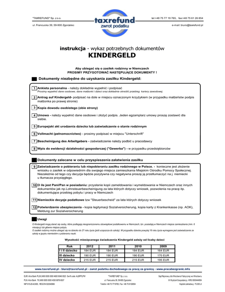 "TAXREFUND" Sp. z o.o. tel:+48 75 77 19 765, fax:+48 75 61 26 854 ul. Francuska 39, 59-900 Zgorzelec e-mail: [email protected] instrukcja - wykaz potrzebnych dokumentów KINDERGELD Aby ubiegać się o zasiłek rodzinny w Niemczech PROSIMY PRZYGOTOWAĆ NASTĘPUJĄCE DOKUMENTY ! Dokumenty niezbędne do uzyskania zasiłku Kindergeld: 1 Ankieta personalna - należy dokładnie wypełnić i podpisać Prosimy wypełnić dane osobowe, dane małżonki i dzieci oraz dokładnie określić przebieg kariery zawodowej. 2 Antrag auf Kindergeld- podpisać na dole w miejscu oznaczonym krzyżykiem (w przypadku małżeństw podpis małżonka po prawej stronie) 3 Kopia dowodu osobistego (obie strony) 4 Umowa - należy wypełnić dane osobowe i złożyć podpis. Jeden egzamplarz umowy proszę zostawić dla siebie. 5 Europejski akt urodzenia dziecka lub zaświadczenie o stanie rodzinnym 6 Vollmacht (pełnomocnictwo) - prosimy podpisać w miejscu "Unterschrift" 7 Bescheinigung des Arbeitgebers - zaświadczenie należy podbić u pracodawcy 8 Wpis do ewidencji działalności gospodarczej ("Gewerba") - w przypadku przedsiębiorców Dokumenty zalecane w celu przyspieszenia załatwienia zasiłku 9 Zaświadczenie o pobieraniu lub niepobieraniu zasiłku rodzinnego w Polsce. - konieczne jest złożenie wniosku o zasiłek w odpowiednim dla swojego miejsca zamieszkania Miejskim Ośrodku Pomocy Społecznej. Niezależnie od tego czy decyzja będzie pozytywna czy negatywna proszę ją przetłumaczyć na j. niemiecki u tłumacza przysięgłego. 10 O ile jest Pani/Pan w posiadaniu: przysłanie kopii zameldowania i wymeldowania w Niemczech oraz innych dokumentów jak np.Lohnsteuerbescheinigung za lata których dotyczy wniosek, pozwolenia na pracę itp. dokumentujące przebieg pobytu i pracy w Niemczech 11 Niemieckie decyzje podatkowe tzw "Steuerbescheid" za lata których dotyczy wniosek 12 Potwierdzenie ubezpieczenia - kopia legitymacji Sozialversicherung, kopia karty z Krankenkasse (np. AOK), Meldung zur Sozialversicherung Uwagi O Kindergeld mogą starać się osoby, które podlegają nieograniczonemu obowiązkowi podatkowemu w Niemczech, tzn. posiadają w Niemczech miejsce zamieszkania (min. 6 miesięcy) lub główne miejsce pobytu. O zasiłek rodzinny można ubiegać się na dziecko do 27 roku życia (jeśli uczęszcza do szkoły). W przypadku dziecka powyżej 16 roku życia wymagane jest zaświadczenie ze szkoły w języku niemieckim o pobieraniu nauki. Wysokość miesięcznego świadczenia Kindergeld zależy od liczby dzieci Rok I i II dziecko 2012 2011 2010 2009 184 EUR 184 EUR 184 EUR 164 EUR III dziecko 190 EUR 190 EUR 190 EUR 170 EUR IV dziecko 215 EUR 215 EUR 215 EUR 195 EUR www.taxrefund.pl - [email protected] - zwrot podatku dochodowego za pracę za granicą - www.pracabezgranic.info EUR: Alior Bank PL36 2490 0005 0000 4600 9046 0523 Swift code: ALBPPLPW PLN: Alior Bank 78 2490 0005 0000 4530 6876 6537 NIP 615-20-42-800, REGON 022040666 "TAXREFUND" Sp. z o.o. ul. Francuska 39, 59-900 Zgorzelec Telefon +48 75 7719765, Fax +48 75 6126854 Sąd Rejonowy dla Wrocławia Fabrycznej we Wrocławiu IX Wydział Gospodarczy KRS 0000444954 Kapitał zakładowy: 75.000 zł Ankieta personalna dla ubiegającego się o niemiecki zasiłek rodzinny (Kindergeld) 1. Dane osobowe wnioskodawcy i jego współmałżonka Wnioskodawca 2. Współmałżonek wnioskodawcy Nazwisko:…………………………………………………………… Nazwisko:………………………………………………………………… Imię:…………………………………………………………………… Imię:………………………………………………………………………… Nazwisko rodowe lub z poprzedniego małżeństwa: Nazwisko rodowe lub z poprzedniego małżeństwa: ………….………………………………………………………………… ……………………………………………………………………………….. Data urodzenia……………………………………………………. Data urodzenia………………………………………………………. Miejsce urodzenia………………………………………………… Miejsce Urodzenia…………………………………………………… Płeć: Płeć: Kobieta Mężczyzna Kobieta … Mężczyzna Obywatelstwo…..………………………………………………… Obywatelstwo………………………………………………………… Stan cywilny (zaznaczyć właściwe, wpisać datę): Stan cywilny (zaznaczyć właściwe, wpisać datę): stan wolny stan wolny w związku małżeńskim w związku małżeńskim wdowa/wdowiec wdowa/wdowiec rozwiedziony(a) rozwiedziony(a) trwała separacja trwała separacja . Adres zamieszkania kod poczt. ............................... Adres zamieszkania kod poczt. ....................................... Miejscowość………………………………………………………… Miejscowość…………………………………………………………… Ulica…………………………………………………………………….. Ulica……………………………………………………………………….. Nr. Tel…………………………………………………………………. Nr.tel……………………………………………………………………… Dane bankowe wnioskodawcy: Numer konta (IBAN) …………………………………………………………… ………………….BIC(SWIFT) ………………………………………… Nazwa banku i miejscowość………………………………………………… ……………………………………………………………………………… W przypadku posiadania rachunku bankowego w Niemczech : Nr. konta…………………………………………………………………………….. BLZ…………………………