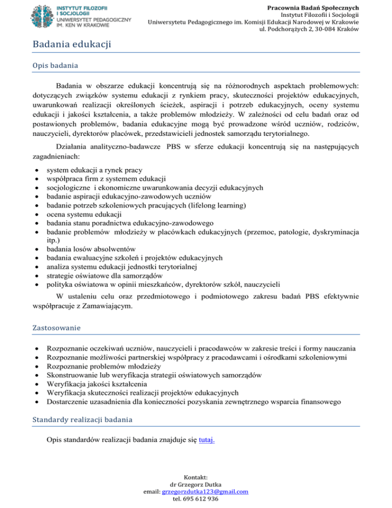 Pracownia Badań Społecznych Instytut Filozofii i Socjologii Uniwersytetu Pedagogicznego im. Komisji Edukacji Narodowej w Krakowie ul. Podchorążych 2, 30-084 Kraków Badania edukacji Opis badania Badania w obszarze edukacji koncentrują się na różnorodnych aspektach problemowych: dotyczących związków systemu edukacji z rynkiem pracy, skuteczności projektów edukacyjnych, uwarunkowań realizacji określonych ścieżek, aspiracji i potrzeb edukacyjnych, oceny systemu edukacji i jakości kształcenia, a także problemów młodzieży. W zależności od celu badań oraz od postawionych problemów, badania edukacyjne mogą być prowadzone wśród uczniów, rodziców, nauczycieli, dyrektorów placówek, przedstawicieli jednostek samorządu terytorialnego. Działania analityczno-badawcze PBS w sferze edukacji koncentrują się na następujących zagadnieniach: system edukacji a rynek pracy współpraca firm z systemem edukacji socjologiczne i ekonomiczne uwarunkowania decyzji edukacyjnych badanie aspiracji edukacyjno-zawodowych uczniów badanie potrzeb szkoleniowych pracujących (lifelong learning) ocena systemu edukacji badania stanu poradnictwa edukacyjno-zawodowego badanie problemów młodzieży w placówkach edukacyjnych (przemoc, patologie, dyskryminacja itp.) badania losów absolwentów badania ewaluacyjne szkoleń i projektów edukacyjnych analiza systemu edukacji jednostki terytorialnej strategie oświatowe dla samorządów polityka oświatowa w opinii mieszkańców, dyrektorów szkół, nauczycieli W ustaleniu celu oraz przedmiotowego i podmiotowego zakresu badań PBS efektywnie współpracuje z Zamawiającym. Zastosowanie Rozpoznanie oczekiwań uczniów, nauczycieli i pracodawców w zakresie treści i formy nauczania Rozpoznanie możliwości partnerskiej współpracy z pracodawcami i ośrodkami szkoleniowymi Rozpoznanie problemów młodzieży Skonstruowanie lub weryfikacja strategii oświatowych samorządów Weryfikacja jakości kształcenia Weryfikacja skuteczności realizacji projektów edukacyjnych Dostarczenie uzasadnienia dla konieczności pozyskania zewnętrznego wsparcia finansowego Standardy realizacji badania Opis standardów realizacji badania znajduje się tutaj. Kontakt: dr Grzegorz Dutka email: [email protected] tel. 695 612 936