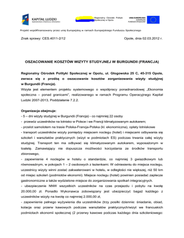 Regionalny Ośrodek Polityki Społecznej w Opolu Projekt współfinansowany przez unię Europejską w ramach Europejskiego Funduszu Społecznego Znak sprawy: CES.4011-2/12 Opole, dnia 02.03.2012 r. OSZACOWANIE KOSZTÓW WIZYTY STUDYJNEJ W BURGUNDII (FRANCJA) Regionalny Ośrodek Polityki Społecznej w Opolu, ul. Głogowska 25 C, 45-315 Opole, zwraca się z prośbą o oszacowanie kosztów zorganizowania wizyty studyjnej w Burgundii (Francja). Wizyta jest elementem projektu systemowego o współpracy ponadnarodowej „Ekonomia społeczna – ponad granicami”, realizowanego w ramach Programu Operacyjnego Kapitał Ludzki 2007-2013, Poddziałanie 7.2.2. Organizacja obejmuje: - 5 – dni wizyty studyjnej w Burgundii (Francja) - co najmniej 22 osoby - przewóz uczestników na lotnisko w Polsce i we Francji klimatyzowanym autokarem; - przelot samolotem na trasie Polska-Francja-Polska (kl. ekonomiczna), opłaty lotniskowe - transport uczestników wizyty pomiędzy miejscem noclegu (hotel) i miejscami odbywania się szkoleń i warsztatów praktycznych (wizyt w podmiotach ES) podczas trwania całej wizyty studyjnej. Transport ten ma odbywać się klimatyzowanym autokarem, wyposażonym w toaletę. Zamawiający nie dopuszcza możliwości korzystania ze środków transportu zbiorowego, - zapewnienie 4 noclegów w hotelu o standardzie, co najmniej 3 gwiazdkowym lub równoważnym, w pokojach 1 – 2 osobowych z łazienkami. W odniesieniu do miejsca noclegu, uczestnicy wizyty winni zostać zakwaterowani w hotelu, w odległości nie większej, niż 50 km od miejsc szkoleń (podmiotów ekonomii). Miejsce noclegu (hotel) powinien posiadać zaplecze gastronomiczne a także wydzielone miejsce do zorganizowania spotkań integracyjnych. - ubezpieczenie NNW wszystkich uczestników na czas przejazdu i pobytu na kwotę 20.000,00 zł. Ponadto Wykonawca zobowiązany jest ubezpieczyć bagaż każdego z uczestników wizyty na kwotę co najmniej 2.000,00 zł, - zapewnienie pełnego wyżywienia dla uczestników (trzy posiłki dziennie: śniadanie, obiad, kolacja oraz przerw kawowych podczas warsztatów praktycznych/wizyt we francuskich podmiotach ekonomii społecznej (2 przerwy kawowe podczas każdego dnia szkoleniowego: kawa, herbata, soki, woda, ciasto, owoce). Wyżywienie powinno rozpocząć się od obiadu w dniu przyjazdu i zakończyć obiadem w dniu wyjazdu. Łącznie, w trakcie 5-dniowego pobytu na każdego uczestnika szkolenia przypadają: 5 obiadów, 4 kolacje (w tym jedna uroczysta) i 4 śniadania. Należy także uwzględnić poczęstunek w postaci ciasta/ciastek, a także dostęp do napojów (kawy, herbaty, wody mineralnej/źródlanej) w czasie przerw między zajęciami dydaktycznymi. Dodatkowe informacje: - zapewnienie moderatora grupy, który posiada wiedzę i doświadczenie w organizowaniu wizyt studyjnych, - zapewnienie tłumacza, który włada biegle jednocześnie językiem polskim oraz francuskim w mowie i piśmie, - funkcję moderatora i tłumacza może wykonywać jedna osoba. Termin: kwiecień-czerwiec 2012 W przypadku dodatkowych pytań proszę o kontakt: Marek Jędrzejewski tel. 77 44 15 250, od poniedziałku do piątku w godz. 7.30-15.00. Informację zwrotną w sprawie szacunkowego kosztu ogółem, w tym VAT w % proszę przesłać na adres: [email protected] do dnia 13 marca 2012 r.