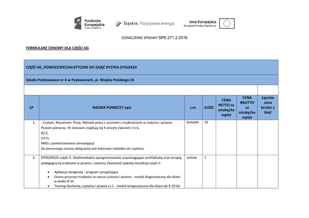 OZNACZENIE SPRAWY SP6.271.2.2016 FORMULARZ CENOWY DLA CZĘŚCI 6G CZĘŚĆ 6G_POMOCESPECJALISTYCZNE DO ZAJĘĆ RYZYKA DYSLEKSJI Szkoła Podstawowa nr 4 w Pyskowicach, ul. Wojska Polskiego 23 LP 1. NAZWA POMOCY/ opis . Czytam. Rozumiem. Piszę. Metoda pracy z uczniami z trudnościami w czytaniu i pisaniu. j.m. CENA NETTO za ILOŚC sztukę/ko mplet komplet 10 zestaw 1 Poziom pierwszy. W zestawie znajdują się 4 zeszyty ćwiczeń: I ó-U, RZ-Ż, CH-H, MIKS ( powtórzeniowo-utrwalający) Do pierwszego zeszytu dołączona jest kolorowa nakładka do czytania. 2. DYSLEKSJA część II. Multimedialne oprogramowanie wspomagające profilaktykę oraz terapię pedagogiczną trudności w pisaniu i czytaniu.Zawartość pakietu Dysleksja część II: Aplikacja terapeuty - program zarządzający Ocena przyczyn trudności w nauce czytania i pisania - moduł diagnostyczny dla dzieci w wieku 8 lat Trening słuchania, czytania i pisania cz.1 - moduł terapeutyczny dla dzieci do 9-10 lat CENA BRUTTO za sztukę/ko mplet Łącznie cena brutto x ilość 3. 4. Pakiet zawiera również tradycyjne pomoce dydaktyczne: Ilustrowana książeczka z wierszykami „Polska od A do Z” Zestaw pocztówek ortograficznych Dodatkowe programy służące do treningu płynnego czytanian oraz do „rozruszania” narządu wzroku – „Gimnastyka oka czytelnika” oraz „Śpiewanie na ekranie” Dyplomy Naklejki Notes na biurko DYSLEKTYCZNE UCHO lub równoważne – Zbiór ćwiczeń stymulujących rozwój percepcji słuchowej nie tylko dla uczniów z dysleksją – Zeszyt ćwiczeń dla ucznia Dyslektyczne ucho lub równoważne. Zbiór ćwiczeń stymulujących rozwój percepcji słuchowej nie tylko dla uczniów z dysleksją - Książka dla nauczyciela 1 8 1 szt WARTOŚĆ OFERTY ŁĄCZNIE BRUTTO w tym VAT ………………………………………. (miejscowość, data) ……………………………………………………. (podpis i pieczęć osoby/osób uprawnionych do reprezentowania Wykonawcy)