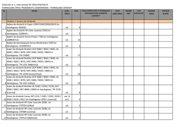 Załacznik nr 1, znak sprawy DZ-2501/243/50/13 FORMULARZ OPISU PRZEDMIOTU ZAMÓWIENIA - FORMULARZ CENOWY lp. 1 2 3 4 5 6 7 8 9 10 11 12 13 nazwa Zadanie 1 tonery do drukarek bęben do drukarki d-Copia 120D/150D/200D/201D (nr katalogowy: B0266) bęben do drukarki HP Color LaserJet 2550 (nr katalogowy: Q3964A ) bęben do drukarki Xerox Phaser 7760 (nr katalogowy: 108R00713) bęben do kserokopiarki Xerox WorkCentre 5230 (nr katalogowy: 101R00435) toner do drukarki Brother DCP 9040 / 9042 / 9045, HL 4040 / 4050 / 4070, MFC 9440 / 9450 / 9840 (nr katalogowy: TN-135BK) toner do drukarki Brother DCP 9040 / 9042 / 9045, HL 4040 / 4050 / 4070, MFC 9440 / 9450 / 9840 (nr katalogowy: TN-135C (błękitny)) toner do drukarki Brother DCP 9040 / 9042 / 9045, HL 4040 / 4050 / 4070, MFC 9440 / 9450 / 9840 (nr katalogowy: TN-135M (purpurowy)) toner do drukarki Brother DCP 9040 / 9042 / 9045, HL 4040 / 4050 / 4070, MFC 9440 / 9450 / 9840 (nr katalogowy: TN-135Y (żółty)) toner do drukarki Brother HL 5240 / 5250 / 5270, DCP 8060 / 8065, MFC 8860 / 8460 (nr katalogowy: TN-3130 (czarny)) toner do drukarki Canon NP-1215 / 1520 / 1550 / 2010 / 6020 / 6216 / 6317 (nr katalogowy: NPG-1 (czarny)) toner do drukarki HP Color LaserJet 2500L (nr katalogowy: C9702A (żółty)) toner do drukarki HP Color LaserJet 2500L (nr katalogowy: C9700A (czarny)) toner do drukarki HP Color LaserJet 2500L (nr katalogowy: C9701A (błękitny)) jedn. miary nazwa producenta/ nr katalogowy/ okres gwarancji/ wydajność produktu* ilość szt. 4 szt. 5 szt. 12 szt. 2 szt. 17 szt. 11 szt. 10 szt. 10 szt. 4 op. (4 szt.) 2 szt. 1 szt. 1 szt. 1 cena jedn.netto stawka VAT cena jedn.brutto wartość netto wartość brutto 14 15 16 17 18 19 20 21 22 23 24 25 26 27 28 29 30 31 32 toner do drukarki HP Color LaserJet 2500L (nr katalogowy: C9703A (purpurowy)) toner do drukarki HP Color LaserJet 2550 (nr katalogowy: Q3960A (czarny)) toner do drukarki HP Color LaserJet 2550 (nr katalogowy: Q3961A (błękitny)) toner do drukarki HP Color LaserJet 2550 (nr katalogowy: Q3962A (żółty)) toner do drukarki HP Color LaserJet 2550 (nr katalogowy: Q3963A (purpurowy)) toner do drukarki HP Color LaserJet 2600 / 2605 (nr katalogowy: Q6000A (czarny)) toner do drukarki HP Color LaserJet 2600 / 2605 (nr katalogowy: Q6001A (błękitny)) toner do drukarki HP Color LaserJet 2600 / 2605 (nr katalogowy: Q6002A (żółty)) toner do drukarki HP Color LaserJet 2600 / 2605 (nr katalogowy: Q6003A (purpurowy)) toner do drukarki HP Color LaserJet 3600 (nr katalogowy: Q6470A (czarny)) toner do drukarki HP Color LaserJet 3600 (nr katalogowy: Q6471A (błękitny)) toner do drukarki HP Color LaserJet 3600 (nr katalogowy: Q6472A (żółty)) toner do drukarki HP Color LaserJet 3600 (nr katalogowy: Q6473A (purpurowy)) toner do drukarki HP Color LaserJet CP1515 / CM1312nfi MFP (nr katalogowy: CB540A (czarny)) toner do drukarki HP Color LaserJet CP1515 / CM1312nfi MFP (nr katalogowy: CB541A (błękitny)) toner do drukarki HP Color LaserJet CP1515 / CM1312nfi MFP (nr katalogowy: CB542A (żółty)) toner do drukarki HP Color LaserJet CP1515 / CM1312nfi MFP (nr katalogowy: CB543A (purpurowy)) toner do drukarki HP Color LaserJet CP2025N / CM2320fxi MFP (nr katalogowy: CC530A (czarny)) toner do drukarki HP Color LaserJet CP2025N / CM2320fxi MFP (nr katalogowy: CC531A (błękitny)) szt. 1 szt. 14 szt. 9 szt. 9 szt. 9 szt. 129 szt. 81 szt. 81 szt. 81 szt. 23 szt. 17 szt 17 szt. 17 szt. 31 szt. 23 szt. 23 szt. 23 szt. 56 szt. 44 33 34 35 36 37 38 39 40 41 42 43 44 45 46 47 48 49 50 toner do drukarki HP Color LaserJet CP2025N / CM2320fxi MFP (nr katalogowy: HP CC532A (żółty)) toner do drukarki HP Color LaserJet CP2025N / CM2320fxi MFP (nr katalogowy: HP CC533A (purpurowy)) toner do drukarki HP Color LaserJet CP3525 (nr katalogowy: CE252A (żółty)) toner do drukarki HP Color LaserJet CP3525 (nr katalogowy: CE251A (błękitny)) toner do drukarki HP Color LaserJet CP3525 (nr katalogowy: CE250X (czarny)) toner do drukarki HP Color LaserJet CP3525 (nr katalogowy: CE253A (purpurowy)) toner do drukarki HP LaserJet 1000 / 1005 (nr katalogowy: C7115A (czarny)) toner do drukarki HP LaserJet 1015 / 1018 / 1020 (nr katalogowy: Q2612A (czarny)) toner do drukarki HP LaserJet 1100 / 1100A (nr katalogowy: C4092A (czarny)) toner do drukarki HP LaserJet 1150 (nr katalogowy: Q2624A (czarny)) toner do drukarki Hp LaserJet 1200 (nr katalogowy: C7115X (czarny)) toner do drukarki HP LaserJet 1300 (nr katalogowy: Q2613X (czarny)) toner do drukarki HP LaserJet 1320 (nr katalogowy: Q5949X (czarny)) toner do drukarki HP LaserJet 2300 (nr katalogowy: Q2610A (czarny)) toner do drukarki HP LaserJet 4L / 4P (nr katalogowy: 92274A (czarny)) toner do drukarki HP LaserJet 5100 (nr katalogowy: C4129X (czarny)) toner do drukarki HP LaserJet 5200n (nr katalogowy: Q7516A (czarny)) toner do drukarki HP LaserJet 5P / MP, 6P / MP (nr katalogowy: C3903A (czarny)) szt. 42 szt. 41 szt. 5 szt. 5 szt. 8 szt. 5 szt. 10 szt. 29 szt. 7 szt 3 szt. 18 szt. 9 szt. 35 szt. 12 szt. 1 szt. 4 szt. 2 szt. 3 51 52 53 54 55 56 57 58 59 60 61 62 63 64 65 66 67 toner do drukarki HP LaserJet Enterprise P3015 (nr katalogowy: CE255X (czarny)) toner do drukarki HP LaserJet P1005 / P1006 (nr katalogowy: CB435A (czarny)) toner do drukarki HP LaserJet P1102 (nr katalogowy: CE285A (czarny)) toner do drukarki HP LaserJet P2014 / P2015 (nr katalogowy: Q7553X (czarny)) toner do drukarki HP LaserJet P2035 / P2055 (nr katalogowy: CE505X (czarny)) toner do drukarki Konica Minolta Magicolor 1600W / 1650EN / 1680MF / 1690MF (nr katalogowy: A0V301H (czarny)) toner do drukarki Konica Minolta Magicolor 1600W / 1650EN / 1680MF / 1690MF (nr katalogowy: A0V306H (żółty)) toner do drukarki Konica Minolta Magicolor 1600W / 1650EN / 1680MF / 1690MF (nr katalogowy: A0V30CH (purpurowy)) toner do drukarki Konica Minolta Magicolor 1600W / 1650EN / 1680MF / 1690MF (nr katalogowy: A0V30HH (błękitny)) Toner do drukarki Kyocera Mita FS-C5150DN (nr katalogowy: K-580K (czarny)) 