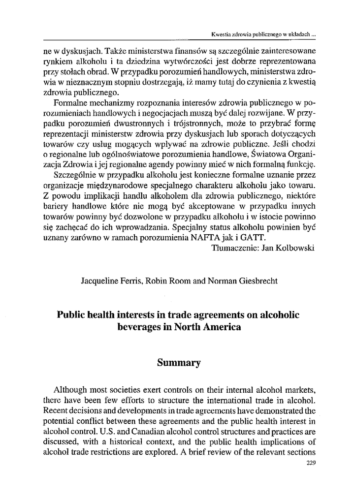 Kwestia zdrowia publicznego w układach ... ne W dyskusjach. Także ministerstwa finansów są szczególnie zainteresowane rynkiem alkoholu i ta dziedzina wytwórczości jest dobrze reprezentowana przy stolach obrad. W przypadku porozumień handlowych, ministerstwa zdrowia w nieznacznym stopniu dostrzegają, iż mamy tutaj do czynienia z kwestią zdrowia publicznego. Formalne mechanizmy rozpoznania interesów zdrowia publicznego w porozumieniach handlowych i negocjacjach muszą być dalej rozwijane. W przypadku porozumień dwustronnych i trójstronnych, może to przybrać formę reprezentacji ministerstw zdrowia przy dyskusjach lub sporach dotyczących towarów czy usług mogących wpływać na zdrowie publiczne. Jeśli chodzi o regionalne lub ogólnoświatowe porozumienia handlowe, Światowa Organizacja Zdrowia i jej regionalne agendy powinny mieć w nich formalną funkcję. Szczególnie w przypadku alkoholu jest konieczne formalne uznanie przez organizacje międzynarodowe specjalnego charakteru alkoholu jako towaru. Z powodu implikacji handlu alkoholem dla zdrowia publicznego, niektóre bariery handlowe które nie mogą być akceptowane w przypadku innych towarów powinny być dozwolone w przypadku alkoholu i w istocie powinno się zachęcać do ich wprowadzania. Specjalny status alkoholu powinien być uznany zarówno w ramach porozumienia NAFTA jak i GATT. Tłumaczenie: Jan Kolbowski Jacqueline Ferris, Robin Room and Norman Giesbrecht Public health interests in trade agreements on alcoholic beverages in North America Summary Although most societies exert controls on their internal alcohol markets, there have been few efforts to structure the international trade in alcoho!. Recent decisions and developments in trade agreements have demonstrated the potential conflict between these agreements and the public health interest in alcohol contro!. U.S. and Canadian alcohol control structures and practices are discussed, with a historical context, and the public health implications of alcohol trade restrictions are explored. A brief review of the re1evant sections 229 Jacqueline Fems, Robin Room, Nonnan Geisbrecht of the General Agreement on Tariffs and Trade (GATT), the Free Trade Agreement (FTA), and the North American Free Trade Agreement (NAFTA) is provided, along with a chronology of the Canada - U.S. beer dispute. We conclude that although currently at odds, public health interests and economic interests can be balanced. Piśmiennictwo l.Babor T.F., Mendelson 1.H., Greenberg I. and Huehnle J. : Experimental analysis of the "happy hour": Effects of purchase price on alcohol consumption. Psyehopharmaeology, 58: 35-41, 1978. 2. B e a u c h a m p D. E . : Beyond aleoholism: aleohol and publie health policy, Philadelphia: TempIe University Press, 1980. 3. Bruun K.: Alcohol Control Policies in PubZic Health Perspective, Helsinki: Finnish Foundation for A1cohol Studies, 1975. 4. Bruun K., Pan, L. and Rexed 1.: The Gentlemen's Club: International Control oj Drugs and Alcohol, Chicago University Press, Chicago, 1975. 5. Cherrington E.H., ed. Standard Eneyclopedia ojthe Aleohol Problem, 6 volumes, Westerville, Ohio: American Issue Publishing Co., 1925-1930. 6. Cook P. 1. and Tauchen G.: The Effect ofLiquorTaxes on Heavy Drinking, Bell Journal oj Economics, 15: 379-390, 1982. 7. GATT Aetivities, 1991: An Annual Review oj the Work oj the GATT. Geneva, July 1992. 8. Germer P.: A1cohol and the Single Market: Juridical Aspects, Contemporary Drug Problems 17: 481-496,1990. 9. H o I d er H. D. : Alcohol Availability and Advertising: Effects on Consumption, and the Publie Health and Sajety, prepared for the A1cohol and Public Policy Project meeting, Oslo, Norway, February 14-19, 1993. 10. Holder H.D. and Wagenaar, A. C.: Effects ofthe elimination of a state monopolyon distilled spirits' retail sales: A time-series analysis of lowa. British Journal oj Addiction 85: 1615-1625,1990. 11.Holder H.D. and Wagenaar, A.C.:MandatedServerTraining and the Reductżon ojAlcohol-Involved Traffic Crashes: A Time Series Analysis in the State oj Oregon. Prevention Research Center, Berkeley, CA, 1992. 230