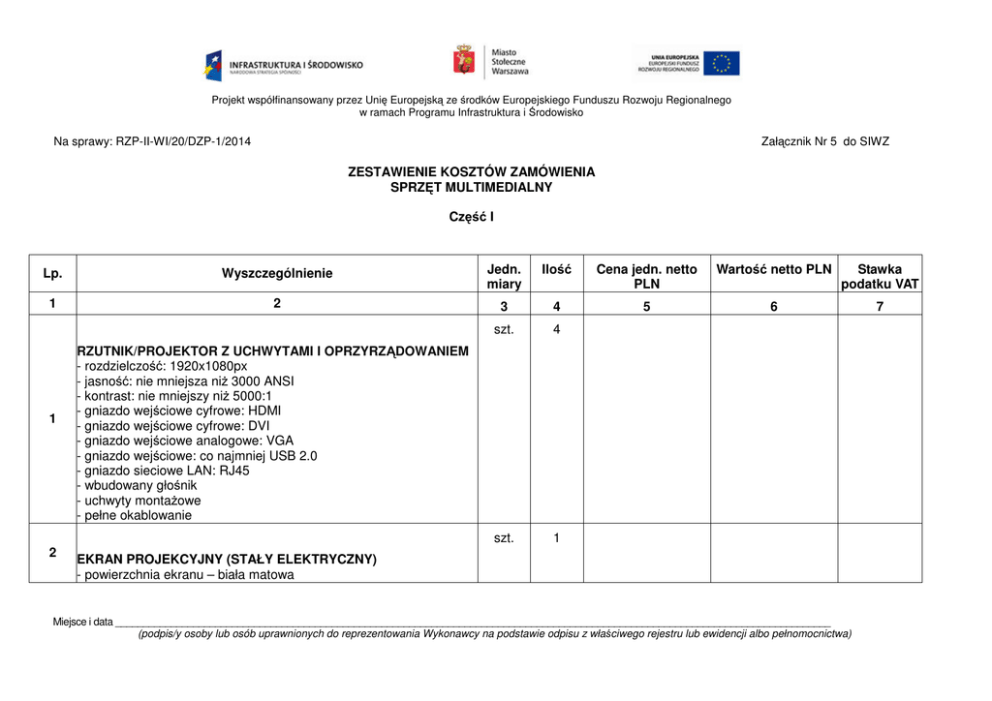 Projekt współfinansowany przez Unię Europejską ze środków Europejskiego Funduszu Rozwoju Regionalnego w ramach Programu Infrastruktura i Środowisko Na sprawy: RZP-II-WI/20/DZP-1/2014 Załącznik Nr 5 do SIWZ ZESTAWIENIE KOSZTÓW ZAMÓWIENIA SPRZĘT MULTIMEDIALNY Część I Lp. Wyszczególnienie Jedn. miary Ilość Cena jedn. netto PLN Wartość netto PLN Stawka podatku VAT 1 2 3 4 5 6 7 szt. 4 szt. 1 1 2 RZUTNIK/PROJEKTOR Z UCHWYTAMI I OPRZYRZĄDOWANIEM - rozdzielczość: 1920x1080px - jasność: nie mniejsza niż 3000 ANSI - kontrast: nie mniejszy niż 5000:1 - gniazdo wejściowe cyfrowe: HDMI - gniazdo wejściowe cyfrowe: DVI - gniazdo wejściowe analogowe: VGA - gniazdo wejściowe: co najmniej USB 2.0 - gniazdo sieciowe LAN: RJ45 - wbudowany głośnik - uchwyty montażowe - pełne okablowanie EKRAN PROJEKCYJNY (STAŁY ELEKTRYCZNY) - powierzchnia ekranu – biała matowa Miejsce i data _________________________________________________________________________________________________________________________________ (podpis/y osoby lub osób uprawnionych do reprezentowania Wykonawcy na podstawie odpisu z właściwego rejestru lub ewidencji albo pełnomocnictwa) - powierzchnia wizyjna 300cm (+/-5%) x300cm (+/-5%) - format obrazu 4:3, 16:9 - pełne zdalne sterowanie pilotem - uchwyty montażowe 3 4 4.1. szt. 3 x x szt. 1 EKRAN PROJEKCYJNY (MOBILNY) - powierzchnia ekranu – biała matowa - powierzchnia wizyjna - 240 cm (+/-5%) x 180 cm (+/-5%) - format obrazu 4:3, 16:9 SYSTEM NAGŁOŚNIENIOWY x ………………………………… (suma wartości netto określonych dla pkt.4.1., 4.2., 4.3.,4.4.) SYSTEM MIKSOWANIA DŹWIĘKU DŹWIĘKU System powinien składać się z: - Pulpitu sterowniczego, zawierającego procesory DSP oraz przyłącza lokalne panelu przyłączy scenicznych z przedwzmacniaczami mikrofonowymi, umożliwiający sterowanie wzmocnieniem za pośrednictwem pulpitu sterowniczego, z możliwością podłączenia sterowników AVIOM Pro 16, bądź kompatybilnych - zdalnego panelu przyłączy scenicznych z przedwzmacniaczami mikrofonowymi, umożliwiającymi sterowanie wzmocnieniem za pośrednictwem pulpitu sterowniczego. Panel powinien mieć możliwość dołączania go w szeregu do kolejnego panelu przyłączy scenicznych, bądź bezpośrednio do pulpitu sterowniczego - przewodów zgodnymi ze specyfikacją CAT5, służącymi do łączenia komponentów systemu Właściwości systemu: Strona 2 z 12 Miejsce i data ___________________________________________________________________________________________________________________________ (podpis/y osoby lub osób uprawnionych do reprezentowania Wykonawcy na podstawie odpisu z właściwego rejestru lub ewidencji albo pełnomocnictwa) - system służący do miksowania sygnałów audio w warunkach estradowych - możliwość miksowania nie mniej niż 48 sygnałów wejściowych, miksowania na 30 wewnętrznych szyn (Aux, Group, Matrix, Main, FX Send) oraz wyprowadzenie 20 z nich na wyjścia - możliwość wprowadzenia na system 40 sygnałów, oraz wyprowadzenie 26 niezależnych sygnałów - możliwość elastycznej konfiguracji funkcji szyn wyjściowych (Aux/Fx/Matrix) - możliwość wyboru trybu pracy szyny głównej: LR, LCR, LR+M, LR+Msum, OFF. - zdalne przyłącza sceniczne - łączenie kolejnych łańcuchów systemu kablami CAT5 o długościach maksymalnie 120m - skalowalność systemu - możliwość zmiany konfiguracji wejść i wyjść w zależności od złożoności obsługiwanego wydarzenia - możliwość komunikacji poprzez protokoły MADI, TPC/IP - możliwość rozszerzenia funkcjonalności systemu o komunikację z protokołami ACE, MADI, EtherSound, ADAT, Dante - możliwość zdalnej kontroli powierzchni sterującej poprzez urządzenia typu tablet - możliwość zapisywania ustawień stołu, z opcją wyłączenia dowolnych kanałów i parametrów z automatyki, - system powinien umożliwiać zapisanie 500 scen w pamięci wewnętrznej urządzenia - użytkownik powinien mieć możliwość tworzenia zmian w kolejności scen, łącznie z wielokrotnym powtarzaniem sceny w liście - możliwość podsłuchu sygnału audio w dowolnym miejscu toru sygnałowego - możliwość odtwarzania bezpośrednio z nośników USB plików audio zapisanych w formatach WAV, MP3, M4A, FLAC 44.1/48kHz - możliwość zapisu bezpośrednio na nośnik USB dwóch dowolnych Strona 3 z 12 Miejsce i data ___________________________________________________________________________________________________________________________ (podpis/y osoby lub osób uprawnionych do reprezentowania Wykonawcy na podstawie odpisu z właściwego rejestru lub ewidencji albo pełnomocnictwa) sygnałów audio, w formacie 48kHz / 16bit WAV - system powinien mieć co najmniej 10 przycisków funkcyjnych, o uniwersalnym zastosowaniu - możliwość konfigurowania kont użytkowników, wraz z edycją uprawnień dostępu Pulpit konsolety powinien zawierać: - nie mniej niż 20 zmotoryzowanych tłumików, nie krótszych niż 100mm, - ekran dotykowy TFT, o przekątnej nie mniejszej niż 8,4 cala i rozdzielczości co najmniej 800x600 - zestaw dedykowanych pokręteł obrotowych do obsługi przedwzmacniacza mikrofonowego, procesorów barwy, dynamiki oraz filtra dolnozaporowego - 8 stereofonicznych procesorów efektowych, z wpiętymi w tor korektorami parametrycznymi - 12 grup DCA - wbudowany generator sygnałów, RTA działający na szynie głównej i PFL - przyciski na powierzchni stołu pozwalające na szybkie kopiowanie i kasowanie ustawień - gniazda USB służące do przywoływania i archiwizowaniu ustawień, aktualizacji oprogramowania oraz odtwarzania/nagrywania plików audio - przyciski MIX, umożliwiające zamienne sterowanie poziomem wysyłki poprzez tłumik kanału/ tłumik mastera - dwa zrównoleglone gniazda słuchawkowe w postaci wtyków TRS 3,5mm i 6,3mm - diody sygnalizujące przesterowanie na ukrytych warstwach Minimalne wyposażenie kanałów wejściowych: - przyciski SEL, MIX
