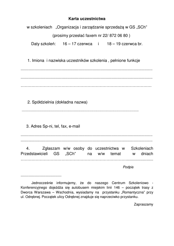Karta uczestnictwa w szkoleniach „Organizacja i zarządzanie sprzedażą w GS „SCh” (prosimy przesłać faxem nr 22/ 872 06 80 ) Daty szkoleń: 16 – 17 czerwca i 18 – 19 czerwca br. 1. Imiona i nazwiska uczestników szkolenia , pełnione funkcje .................................................................................................................... .................................................................................................................... …………………………………………………………………………………… 2. Spółdzielnia (dokładna nazwa) ................................................................................................................................................ 3. Adres Sp-ni, tel, fax, e-mail .................................................................................................................... .................................................................................................................... 4. Zgłaszam w/w osoby do uczestnictwa w Szkoleniach Przedstawicieli GS „SCh” na w/w temat w dniach ……………………………………………………………………....................... Podpis .................................... Jednocześnie informujemy, że do naszego Centrum Szkoleniowo Konferencyjnego dojeżdża się autobusem miejskim linii 146 – początek trasy z Dworca Warszawa – Wschodnia, wysiadamy na przystanku „Romantyczna” przy ul. Odrębnej. Początek ulicy Odrębnej znajduje się naprzeciwko przystanku. Zapraszamy