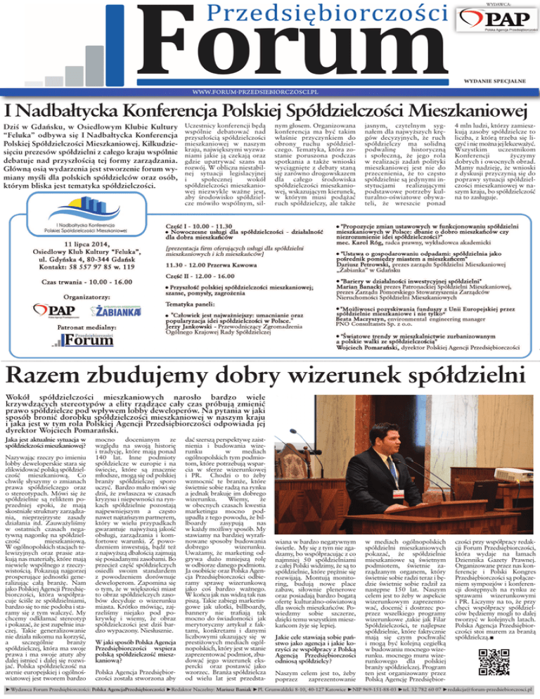 WYDAWCA: WYDANIE SPECJALNE www.forum-przedsiebiorczosci.pl I Nadbałtycka Konferencja Polskiej Spółdzielczości Mieszkaniowej Dziś w Gdańsku, w Osiedlowym Klubie Kultury “Feluka” odbywa się I Nadbałtycka Konferencja Polskiej Spółdzielczości Mieszkaniowej. Kilkudziesięciu prezesów spółdzielni z całego kraju wspólnie debatuje nad przyszłością tej formy zarządzania. Główną osią wydarzenia jest stworzenie forum wymiany myśli dla polskich spółdzielców oraz osób, którym bliska jest tematyka spółdzielczości. Uczestnicy konferencji będą wspólnie debatować nad przyszłością spółdzielczości mieszkaniowej w naszym kraju, największymi wyzwaniami jakie ją czekają oraz gdzie upatrywać szans na rozwój. W obliczu niestabilnej sytuacji legislacyjnej i społecznej wokół spółdzielczości mieszkaniowej niezwykle ważne jest, aby środowisko spółdzielcze mówiło wspólnym, sil- nym głosem. Organizowana konferencja ma być takim właśnie przyczynkiem do obrony ruchu spółdzielczego. Tematyka, która zostanie poruszona podczas spotkania a także wnioski wyciągnięte z debaty staną się zarówno drogowskazem dla całego środowiska spółdzielczości mieszkaniowej, wskazującym kierunek, w którym musi podążać ruch spółdzielczy, ale także jasnym, czytelnym sygnałem dla najwyższych kręgów decyzyjnych, że ruch spółdzielczy ma solidną podwalinę historyczną i społeczną, że jego rola w realizacji zadań polityki mieszkaniowej jest nie do przecenienia, że to często spółdzielnie są jedynymi instytucjami realizującymi podstawowe potrzeby kulturalno-oświatowe obywateli, że wreszcie ponad 4 mln ludzi, którzy zamieszkują zasoby spółdzielcze to liczba, z którą trzeba się liczyć i nie można jej lekceważyć. Wszystkim uczestnikom Konferencji życzymy dobrych i owocnych obrad. Mamy nadzieję, że wnioski z dyskusji przyczynią się do poprawy sytuacji spółdzielczości mieszkaniowej w naszym kraju, bo spółdzielczość na to zasługuje. Razem zbudujemy dobry wizerunek spółdzielni Wokół spółdzielczości mieszkaniowych narosło bardzo wiele krzywdzących stereotypów a elity rządzące cały czas próbują zmienić prawo spółdzielcze pod wpływem lobby deweloperów. Na pytania w jaki sposób bronić dorobku spółdzielczości mieszkaniowej w naszym kraju i jaka jest w tym rola Polskiej Agencji Przedsiębiorczości odpowiada jej dyrektor Wojciech Pomarański. Jaka jest aktualnie sytuacja w spółdzielczości mieszkaniowej? Nazywając rzeczy po imieniu lobby deweloperskie stara się zlikwidować polską spółdzielczość mieszkaniową. Co chwilę słyszymy o zmianach prawa spółdzielczego oraz o stereotypach. Mówi się że spółdzielnie są reliktem poprzedniej epoki, że mają skostniałe struktury zarządzania, nieprzejrzyste zasady działania itd. Zauważyliśmy w ostatnich czasach negatywną nagonkę na spółdzielczość mieszkaniową. W ogólnopolskich stacjach telewizyjnych oraz prasie atakują nas materiały, które mają niewiele wspólnego z rzeczywistością. Pokazują najgorzej prosperujące jednostki generalizując całą branżę. Nam jako Polskiej Agencji Przedsiębiorczości, która współpracuje ściśle ze spółdzielniami, bardzo się to nie podoba i staramy się z tym walczyć. My chcemy odkłamać stereotyp i pokazać, że jest zupełnie inaczej. Takie generalizowanie nie działa nikomu na korzyść, a szczególnie branży spółdzielczej, która ma swoje prawa i ma swoje atuty aby dalej istnieć i dalej się rozwijać. Polska spółdzielczość na arenie europejskiej i ogólnoświatowej jest tworem bardzo mocno docenianym ze względu na swoją historię i tradycję, które mają ponad 140 lat. Inne podmioty spółdzielcze w europie i na świecie, które są znacznie młodsze, mogą się od polskiej branży spółdzielczej sporo uczyć. Bardzo mało mówi się dziś, że zwłaszcza w czasach kryzysu i niepewności na rynkach spółdzielnie pozostają najpewniejszym a często nawet najtańszym partnerem, który w wielu przypadkach gwarantuje najwyższą jakość obsługi, zarządzania i komfortowe warunki. Z powodzeniem inwestują, bądź też z najwyższą dbałością zajmują się posiadanymi zasobami. Bo przecież część spółdzielczych osiedli swoim standardem z powodzeniem dorównuje deweloperom. Zapomina się o tym, że w większości miast to obraz spółdzielczych zasobów decyduje o wizerunku miasta. Krótko mówiąc, zajrzeliśmy niejako pod pokrywkę i wiemy, że obraz spółdzielczości jest dziś bardzo wypaczony. Niesłusznie. W jaki sposób Polska Agencja Przedsiębiorczości wspiera polską spółdzielczość mieszkaniową? Polska Agencja Przedsiębiorczości została stworzona aby dać szerszą perspektywę zaistnienia i budowania wizerunku w mediach ogólnopolskich tym podmiotom, które potrzebują wsparcia w sferze wizerunkowej i PR. Chodzi o to żeby wzmocnić te branże, które świetnie sobie radzą na rynku a jednak brakuje im dobrego wizerunku. Wiemy, że w obecnych czasach kwestia marketingu mocno podupadła z tego powodu, że billboardy zasypują nas w każdy możliwy sposób. My stawiamy na bardziej wyrafinowane sposoby budowania dobrego wizerunku. Uważamy, że marketing odgrywa dużo mniejszą rolę w odbiorze danego podmiotu. Ja osobiście oraz Polska Agencja Przedsiębiorczości odbieramy sprawę wizerunkową jako coś bardzo ważnego. W końcu jak nas widzą tak nas piszą. Takie zabiegi marketingowe jak ulotki, billboardy, bannery nie trafiają tak mocno do świadomości jak merytoryczny artykuł z faktami, konkretami i danymi liczbowymi ukazujący się w prestiżowych mediach ogólnopolskich, który jest w stanie zaprezentować podmiot, zbudować jego wizerunek ekspercki oraz postawić jako wzorzec. Branża spółdzielcza od wielu lat jest przedsta- wiana w bardzo negatywnym świetle. My się z tym nie zgadzamy, bo współpracując z co najmniej 50 spółdzieln