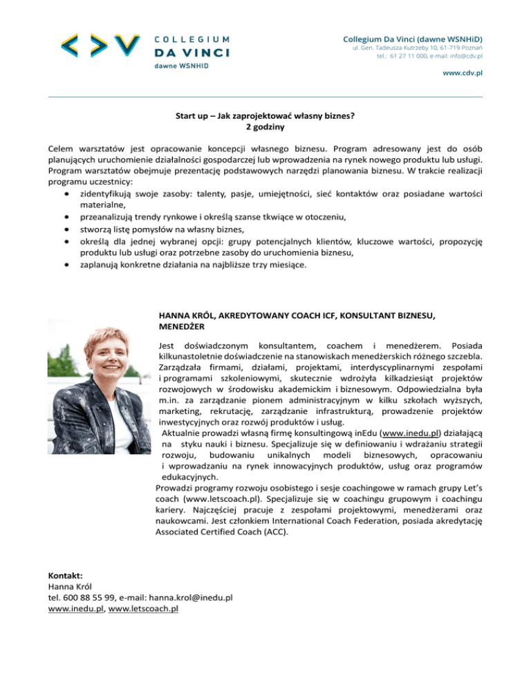 Collegium Da Vinci (dawne WSNHiD) ul. Gen. Tadeusza Kutrzeby 10, 61-719 Poznań tel.: 61 27 11 000, e-mail: [email protected] www.cdv.pl Start up – Jak zaprojektować własny biznes? 2 godziny Celem warsztatów jest opracowanie koncepcji własnego biznesu. Program adresowany jest do osób planujących uruchomienie działalności gospodarczej lub wprowadzenia na rynek nowego produktu lub usługi. Program warsztatów obejmuje prezentację podstawowych narzędzi planowania biznesu. W trakcie realizacji programu uczestnicy: zidentyfikują swoje zasoby: talenty, pasje, umiejętności, sieć kontaktów oraz posiadane wartości materialne, przeanalizują trendy rynkowe i określą szanse tkwiące w otoczeniu, stworzą listę pomysłów na własny biznes, określą dla jednej wybranej opcji: grupy potencjalnych klientów, kluczowe wartości, propozycję produktu lub usługi oraz potrzebne zasoby do uruchomienia biznesu, zaplanują konkretne działania na najbliższe trzy miesiące. HANNA KRÓL, AKREDYTOWANY COACH ICF, KONSULTANT BIZNESU, MENEDŻER Jest doświadczonym konsultantem, coachem i menedżerem. Posiada kilkunastoletnie doświadczenie na stanowiskach menedżerskich różnego szczebla. Zarządzała firmami, działami, projektami, interdyscyplinarnymi zespołami i programami szkoleniowymi, skutecznie wdrożyła kilkadziesiąt projektów rozwojowych w środowisku akademickim i biznesowym. Odpowiedzialna była m.in. za zarządzanie pionem administracyjnym w kilku szkołach wyższych, marketing, rekrutację, zarządzanie infrastrukturą, prowadzenie projektów inwestycyjnych oraz rozwój produktów i usług. Aktualnie prowadzi własną firmę konsultingową inEdu (www.inedu.pl) działającą na styku nauki i biznesu. Specjalizuje się w definiowaniu i wdrażaniu strategii rozwoju, budowaniu unikalnych modeli biznesowych, opracowaniu i wprowadzaniu na rynek innowacyjnych produktów, usług oraz programów edukacyjnych. Prowadzi programy rozwoju osobistego i sesje coachingowe w ramach grupy Let’s coach (www.letscoach.pl). Specjalizuje się w coachingu grupowym i coachingu kariery. Najczęściej pracuje z zespołami projektowymi, menedżerami oraz naukowcami. Jest członkiem International Coach Federation, posiada akredytację Associated Certified Coach (ACC). Kontakt: Hanna Król tel. 600 88 55 99, e-mail: [email protected] www.inedu.pl, www.letscoach.pl