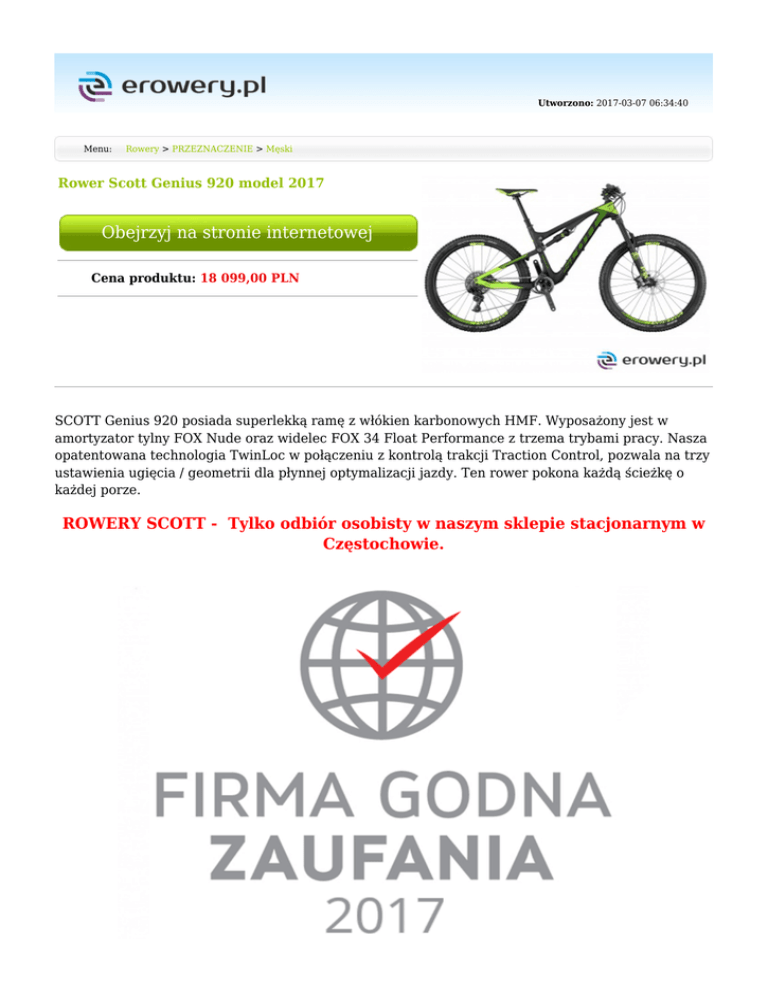 Utworzono: 2017-03-07 06:34:40 Menu: Rowery > PRZEZNACZENIE > Męski Rower Scott Genius 920 model 2017 Obejrzyj na stronie internetowej Cena produktu: 18 099,00 PLN SCOTT Genius 920 posiada superlekką ramę z włókien karbonowych HMF. Wyposażony jest w amortyzator tylny FOX Nude oraz widelec FOX 34 Float Performance z trzema trybami pracy. Nasza opatentowana technologia TwinLoc w połączeniu z kontrolą trakcji Traction Control, pozwala na trzy ustawienia ugięcia / geometrii dla płynnej optymalizacji jazdy. Ten rower pokona każdą ścieżkę o każdej porze. ROWERY SCOTT - Tylko odbiór osobisty w naszym sklepie stacjonarnym w Częstochowie. Rozmiary ram Klamki hamulców Hamulce S, M, L, XL Shimano M615 Disc 180mm F & R / SM-RT64 CL Rotor Mechanizm korbowy Sram Custom GX1 GXP PF 30T Oś korbowodu Sram GXP PF integrated / shell 41x89.5mm Prowadzenie łańcucha Kierownica Mostek/ Wspornik kierownicy Pedały Syncros FL1.5 mini Riser / Alloy 7050D.B. 12mm rise / 9° / 760mm Syncros Pro lock-on grips Syncros TR1.5 2014 / 3D forged / oversize 31.8mm 1 1/8” / -6° - Sztyca FOX Transfer Dropper Remote 31.6mm / S size 100mm / M, L & XL 150mm Siodło Syncros XM2.0 / CROM rails Przeznaczenie Męski Piasta przód Syncros TR2.5 CL / 15x100mm made by DT Swiss Piasta tył Syncros TR2.5 CL / 142x12mm RWS axle Made by DT Swiss Łańcuch Sram CN-PC1110 Kaseta/ wolnobieg Sram XG1150 / 10-42 T Szprychy DT Swiss Competition 2.0-1.8-2.0 Black Obręcze Syncros TR2.5 /28H tubeless ready Opony Schwalbe Nobby Nic EVO / 2.35 67EPI Kevlar Bead / Tubeless Easy PaceStar compound / Schwalbe EVO Tubes Wyposażenie dodatkowe Typ roweru Enduro Waga ok. 12,80 kg (Rozmiar M, bez pedałów) Tylny amortyzator /Damper FOX NUDE, SCOTTcustom, DPS 3 tryby pracy technologia TC, manetka TwinLoc 150mm skok Rozmiar kół Sezon Rodzina Kolor Producent Rama Widelec/amortyzator Stery Przerzutka przód Przerzutka tył Manetki 29" 2017 Czarny_#000000 Scott Genius Karbonowa główna rama , HMF włókna, IMP tech., Alum. specjalnie cieniowane trójkąt, IDS SL Hak pod 12x142mm oś FOX 34 Float Performance Air 3 tryby pracy, reg. siła odbicia, 15x100mm oś, skok: 140mm Syncros Pro Press Fit / Tapered 1.5” - 1 1/8” OD 50/61mm / ID 44/55mm SCOTT Chainguide Sram GX1 / 11 Speed Sram GX1 Trigger Mimo dołożenia wszelkich starań nie gwarantujemy, że publikowane opisy i specyfikacje techniczne niezawierają uchybień lub błędów, które nie mogą jednak być podstawą do roszczeń. W przypadku jakichkolwiek wątpliwości, przed podjęciem decyzji prosimy o kontakt. Adres: www.erowery.pl Telefon: 605 515 185, 34 361 16 71 Email: [email protected]