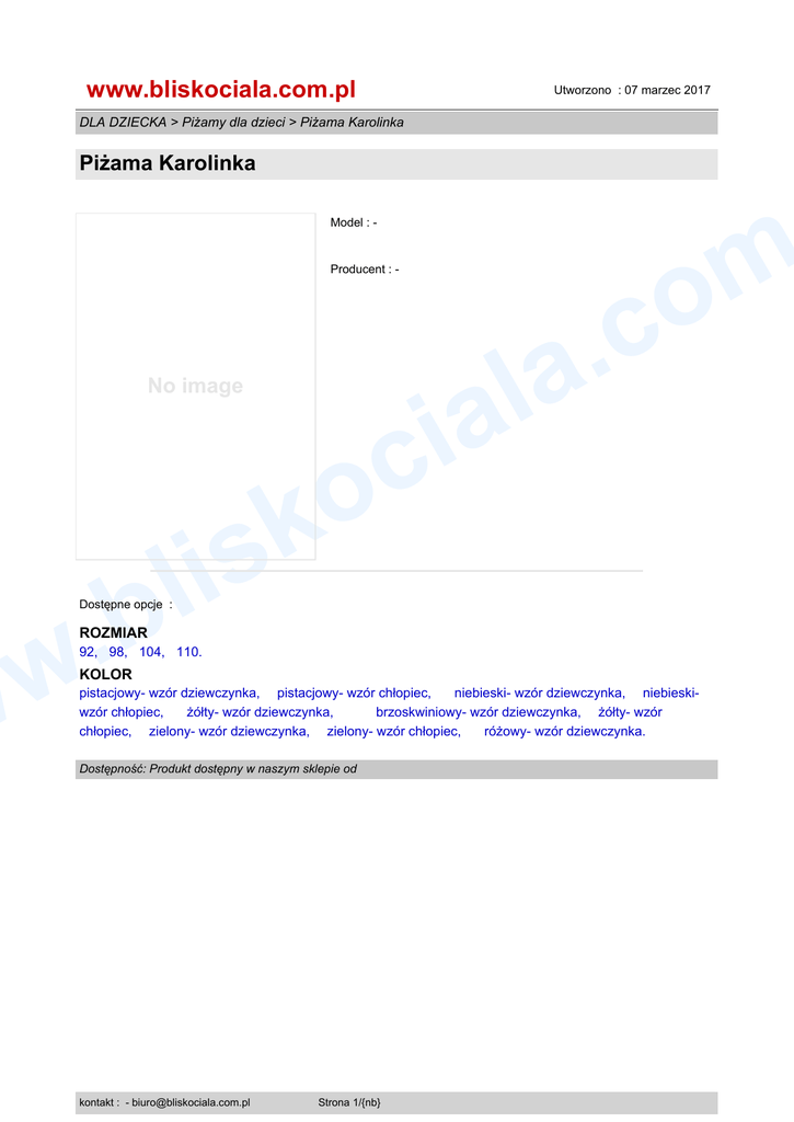 www.bliskociala.com.pl Utworzono : 07 marzec 2017 DLA DZIECKA > Piżamy dla dzieci > Piżama Karolinka Piżama Karolinka m o c . a l a Model : - Producent : - No image i c o k il s w b . w Dostępne opcje : ROZMIAR 92, 98, 104, 110. KOLOR pistacjowy- wzór dziewczynka, pistacjowy- wzór chłopiec, niebieski- wzór dziewczynka, niebieskiwzór chłopiec, żółty- wzór dziewczynka, brzoskwiniowy- wzór dziewczynka, żółty- wzór chłopiec, zielony- wzór dziewczynka, zielony- wzór chłopiec, różowy- wzór dziewczynka. Dostępność: Produkt dostępny w naszym sklepie od kontakt : - [email protected] Strona 1/{nb}