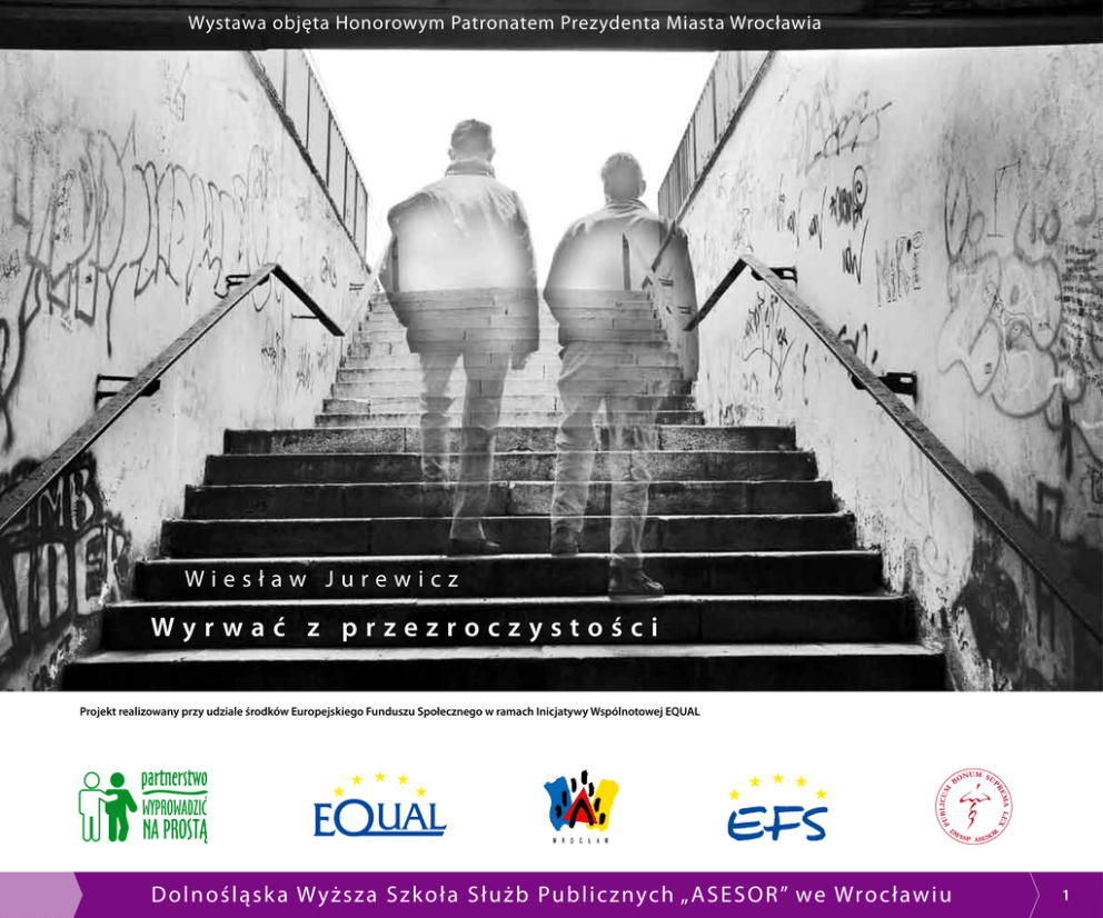 Wystawa objęta Honorowym Patronatem Prezydenta Miasta Wrocławia Wiesław Jurewicz Wyrwać z przezroczystości Projekt realizowany przy udziale środków Europejskiego Funduszu Społecznego w ramach Inicjatywy Wspólnotowej EQUAL D olnośląsk a Wyższa Szkoła Służb Publicznych „ASESOR ” we Wrocławiu P r z e z r o c z yś c i Bezdomni i bezrobotni. Niezauważalni, żyjący gdzieś obok życia. Specyficznie przezroczyści względem in‑ nych. Niby są, ale jakby Ich nie było. Często w sposób pra‑ wie bezwiedny spadli do ciemnej otchłani – urządzonej na wzór piekła, a zlokalizowanej gdzieś tuż obok nas. Przebywając tam, z przerażeniem obserwują uciekają‑ cy strumień rzeczywistości. Jest on, wydaje się, na wy‑ ciągnięcie ręki, a jednocześnie tak daleki. Ta relatywna bliskość, a jednocześnie dalekość życia jest chyba naj‑ bardziej degradująca. Co ciekawe – o ile w ciemnej otchłani doskonale słychać gwar, zgiełk życia, to głos stamtąd jakoś nie wydobywa się na powierzchnię. Może pora nadstawić ucha??? Wiesław Jurewicz Zdeptana cisza Bezdomny cień Bezrobotny Ponumerowany Za burtę życia rzucony Prawymi sercami Już nie człowiek Wzgardzone dziecię Niewolnictwa Demokracja Stanisław Kolasiński, beneficjent – PAB Bielice, mieszkaniec Schroniska im. św. Brata Alberta w Bielicach P r z e z r o c z yś c i List piszę i proszę Wysłuchaj mnie, Dobry Boże Mój znajomy, kolega Zwykły człowiek Niewyobrażalna „bieda” Nie ma butów, jest bosy A przez życie w butach chce kroczyć Nisko upadł, popełnił wiele złego Mówi, że chce być lepszym Chce wejść w butach Do Królestwa Twego Małgorzata Leśniewska, akompaniatorka – PAB Sosnowiec P r z e z r o c z yś c i „Znacząc życie od nowa” W wyniku popełnionych błędów wylądowałem na obrzeżach życia, w rwącym nurcie marginesu. Bez pracy, bez szans, bez rodziny, domu, bez przyjaciół. Na twarzy tylko przerażenie i rozdarcie. I zaułek ślepy. Wokół tylko zimne, skostniałe z obojętności wobec człowieka bezdomnego dłonie, wzrok i to sakramentalne: pracy brak. Zaryglowałem się. Zamieszkało we mnie milczenie z uchem do ziemi przywartym. Rósł mój sąd o ludziach – był zimny i plugawy jak rzeźnicki topór. Żyłem w świecie bez miłości i wyobraźni, bez czułości. Bez zwątpienia. Bez przeszłości i przyszłości, jak kukła oczekująca egzekucji do rozliczenia przed Najwyższym ze wszystkich swoich zmysłów. Byłem włóknem wszelkich sił. Ktoś anonim – szepnął: Schronisko Bielice, dowlokłem się, jak człowiek pędzony razami i rykiem”. Stanisław, beneficjent – PAB Bielice, mieszkaniec Schroniska im. św. Brata Alberta w Bielicach „Kiedyś mieszkałam 600 km. od Gliwic, odeszłam od męża sadysty. Przyjechałam do tego miasta, ponieważ mam tutaj siostrę i ojczyma. Mieszkałam w domu samotnej matki w Gliwicach, pomoc społeczna nie chciała mi pomóc”. Marta, beneficjentka – PAB Gliwice „Mam 21 lat, jak miałam 17 lat usamodzielniłam się, choć nie byłam jeszcze na to gotowa, zaszłam w ciążę. Mój synek ma teraz 2 latka, jest z ojcem. Ja od 5 miesięcy mieszkam w schronisku im. św. Brata Alberta w Zabrzu. Dlaczego? Brak domu. Chcę skończyć liceum, znaleźć pracę i wyjść na prostą. Chcę to zrobić dla mojego synka”. Barbara, beneficjentka – PAB Zabrze „Wróciłam z Wielkiej Brytanii, od grudnia jestem beneficjentem PAB‑u, nie mogę znaleźć pracy pomimo wielu kursów i znajomości języka angielskiego (…). Mam dwóch dorosłych synów, wychowałam ich sama. (…). Moje marzenie to znaleźć pracę i żyć na godnym poziomie”. Halina, beneficjentka – PAB Zabrze P r z e z r o c z yś c i Proszę cię, słońce, królewiczu nieba Zaświeć mocniej w miejsce Gdzie brak domu i chleba Dotknij swoim promieniem Nędzarza, żebraka Ogrzej serca smutkiem zranione Wlej do ich wnętrza nadzieję Muszą uwierzyć, że nie wszystko stracone Małgorzata Leśniewska, akompaniatorka – PAB Sosnowiec P r z e z r o c z yś c i P r z e z r o c z yś c i Ludzie do „Niczego” Rzetelnie potrafią ukochać człowieka Szabrownicy śmietników Żyją jak rwąca rzeka Oni wiedzą, że czas pędzi czas ucieka Małgorzata Leśniewska, akompaniatorka – PAB Sosnowiec U S ŁYS Z E Ć CZ Ł O W I E K A Przezroczystym może stać się naprawdę każdy. Utrata pracy, cięższa choroba, brak wsparcia w rodzinie lub odwrotnie konieczność opieki nad bliskimi czasem wystarczą aby zepchnąć człowieka w bolesny niebyt. Taka sytuacja może się utrwalić nawet na zawsze. Jak się okazuje nie trzeba wcale tak wiele aby przezroczyści mogli powrócić do życia. Wystarcza mądrze podać im rękę aby sami sobie dali już radę. Podstawą jest umiejętne słuchanie. Otworzenie się na cierpienie i niemożność drugiego człowieka. Wsparcie słowem, podpowiedzenie drogi. Słowem wspólna praca nad lepszą przyszłością. A stąd już tylko jeden krok do wyjścia z otchłani. Takie proste? Jest tylko jeden mały szkopuł – potrzebujący muszą mieć gdzie przyjść – a takich miejsc jest mało... Wiesław Jurewicz „Przychodzę tu, bo mogę zawsze z kimś porozmawiać i nie czuję się samotna”. Agnieszka, beneficjentka – PAB Gliwice „Jak mam problem przychodzę tu i nigdy nikt nie odprawia mnie z kwitkiem (…). Nie tak jak w urzędach (…)”. Małgorzata, beneficjentka – PAB Gliwice „W tym miejscu (PAB) zawsze akompaniator ma dla mnie czas, mogę się wygadać i popłakać”. Małgorzata, beneficjentka – PAB Gliwice „Ludzie, którzy tu przychodzą, nigdy nie zostają odesłani z kwitkiem (…). Jest to dobre miejsce i potrzebne”. Krzysztof, beneficjent – PAB Zabrze „Przychodzą, żeby wyrwać się ze środowiska, gdzie jest im źle, które jest złe dla nich (...), przychodzą, bo tu jest bezpiecznie”. – Małgorzata, akompaniatorka – PAB Gliwice „Staram się iść z tą osobą tak, ż