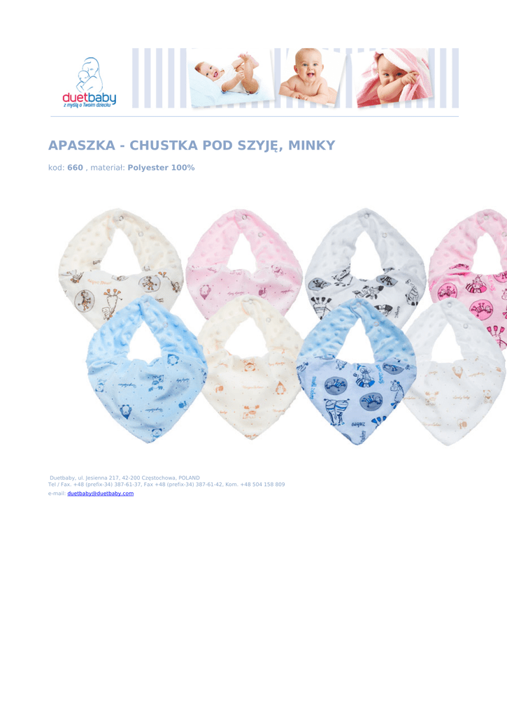 APASZKA - CHUSTKA POD SZYJĘ, MINKY kod: 660 , materiał: Polyester 100% Duetbaby, ul. Jesienna 217, 42-200 Częstochowa, POLAND Tel / Fax. +48 (prefix-34) 387-61-37, Fax +48 (prefix-34) 387-61-42, Kom. +48 504 158 809 e-mail: [email protected] Powered by TCPDF (www.tcpdf.org)