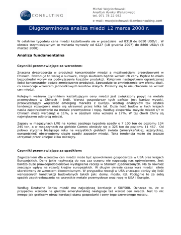 Michał Wojciechowski Analityk Rynku Walutowego tel. 071 78 22 982 e-mail: [email protected] Długoterminowa analiza miedzi 12 marca 2008 r. W ostatnim tygodniu cena miedzi kształtowała sie w przedziale od 8318 do 8650 USD/t . W okresie trzymiesięcznym te wahania wynosiły od 6227 (18 grudnia 2007) do 8860 USD/t (6 marzec 2008) . Analiza fundamentalna Czynniki przemawiające za wzrostem: Znaczna dysproporcja w produkcji koncentratów miedzi a możliwościami przerobowymi w Chinach. Powoduje to walkę o surowce, czego skutkiem będzie wzrost ich ceny. Będzie to miało bezpośredni wpływ na podwyższenie kosztów produkcji. Kolejnym następstwem ograniczonej ilości koncentratów będzie zmniejszenie produkcji. Spowoduje to zmniejszenie tzw efektu skali, co zaowocuje wzrostem jednostkowych kosztów stałych. Przełoży się to nieuchronnie na wzrost cen miedzi. Kolejnym ważnym czynnikiem kształtującym ceny miedzi jest zwiększony popyt na metale przemysłowe w Chinach i Indii. Wzrost gospodarczy tych państw jest bardzo wysoki, przewyższający większość emerging markets z Europy. Według analityków tak szybka tendencja rozwojowa może się utrzymać przez kilka lat. Duża ilość budów w tych krajach nasila zapotrzebowanie na metale przemysłowe i ropę. Według ekspertów zużycie miedzi r/r w Chinach może wzrosnąć o 11%, a w zeszłym roku wzrosła o 17%. W tej chwili Chiny są największym odbiorcą miedzi. Zapasy w magazynach LME na koniec zeszłego tygodnia spadły o 7 100 ton do poziomu 134 245 ton, a w magazynach na giełdzie Comex obniżyły się o 325 ton do poziomu 11 467. Od połowy stycznia bieżącego roku na wszystkich giełdach świata (amerykańskiej, azjatyckiej, europejskiej) obserwujemy ciągłe spadki zapasów miedzi. Taka tendencja może się jeszcze utrzymać przez kolejne kilka miesięcy. Czynniki przemawiające za spadkiem: Zagrożeniem dla wzrostów cen miedzi może być spowolnienie gospodarcze w USA oraz krajach Europejskich. Dane jakie napływają do nas zza oceanu nie napawają nas optymizmem. Jest bardzo duże prawdopodobieństwo wystąpienia recesji w Stanach Zjednoczonych. Ma to również znaczący wpływ na rozwój krajów europejskich. W długim okresie czasu kurs miedzi silnie skorelowany ze wzrostem ekonomicznym. W przypadku recesji w USA znacząco obniży się ilość wznoszonych konstrukcji budowlanych takich jak: domy, mosty, itd. Pociągnie to za sobą spadek zapotrzebowania na wszystkie metale przemysłowe oraz ropę w USA i Europie. Według Deutsche Banku miedź ma największą korelacje z S&P500. Oznacza to, że w przypadku wzrostu na giełdzie amerykańskiej następuje też wzrost cen miedzi. Jest to nic innego jak graficzny obraz korelacji stanu gospodarki i ceny tego czerwonego metalu. Analiza techniczna: Interwał:H4 Data 18 grudnia 2007 oznacza początek trendu wzrostowego, który wystartował z poziomu 6269 USD/t. Od tego czasu kurs stale podąża na północ. Początkowo wydawało się, że jest to tylko korekta ruchu spadkowego, jednak przebicie poziomu Fibonacciego 61,8% poprzedniego trendu spadkowego rozwiało wątpliwości. Kurs dalej piął się w górę przebijając kolejno ważny opór na poziomie 8367. Od tygodnia trwa dość istotne zniesienie, które po takich wzrostach jest normalną rzeczą. Zaobserwować możemy ruch ABC z podwójnie wydłużoną falą B. Oznacza to, że zasięg fali B jest na poziomie ok 8900 punktów. Na poziomie 8860 kurs zaczął zniżkować osiągając swoje minimum na poziomie 8254. Aby uznać to za korektę wzrostów wykres musi przebić bardzo silny opór na poziomie 8367. Otworzy to drogę do dalszych wzrostów, aż do historycznego poziomu 9000. Podsumowanie: Cena miedzi ma jeszcze potencjał wzrostowy. Od dłuższego czasu napływają do nas informacje o słabnącej podaży i jednoczesnym wzroście popytu ( głównie w Chinach). Mała ilość koncentratów i rosnące koszty produkcji zdają się w dalszym ciągu prowadzić kurs na północ. Dane fundamentalne potwierdza dodatkowo analiza techniczna, która po zakończeniu obecnej korekty wygeneruje najprawdopodobniej sygnał zakupu. Należy zatem bacznie obserwować kurs i po przebiciu poziomu 8856 zajmować długą pozycję. Zagrożenie, jakim może być spadek popytu w Stanach Zjednoczonych, może mieć znaczny wpływ na notowania cen miedzi więc zalecane jest monitorowanie bieżących informacji. Sporządził: Michał Wojciechowski Przedstawione, w raporcie, poglądy, oceny i wnioski sa wyrazem osobistych poglądów autorów i nie maja charakteru rekomendacji autora lub serwisu www.ambconsulting.pl do nabycia lub zbycia albo powstrzymania sie od dokonania transakcji w odniesieniu do jakichkolwiek walut lub papierów wartościowych. Poglądy te jak i inne treści raportów nie stanowią "rekomendacji" lub "doradztwa" w rozumieniu ustawy z dnia 21 sierpnia 1997r. Prawo o publicznym obrocie papierami wartościowymi (Dz. U. Nr118, poz. 754, z pózn. zm.) Wyłączna odpowiedzialność za decyzje inwestycyjne, podjęte lub zaniechane na podstawie raportu lub z wykorzystaniem wniosków w nim zawartych, ponosi inwestor. Autorzy serwisu sa również właścicielem majątkowych praw autorskich do raportów. W szczególności zabronione jest kopiowanie, przedrukowywanie, udostępnianie osobom trzecim i rozpowszechnianie raportów w całości lub we fragmentach bez zgody autorów serwisu. www.ambconsulting.pl